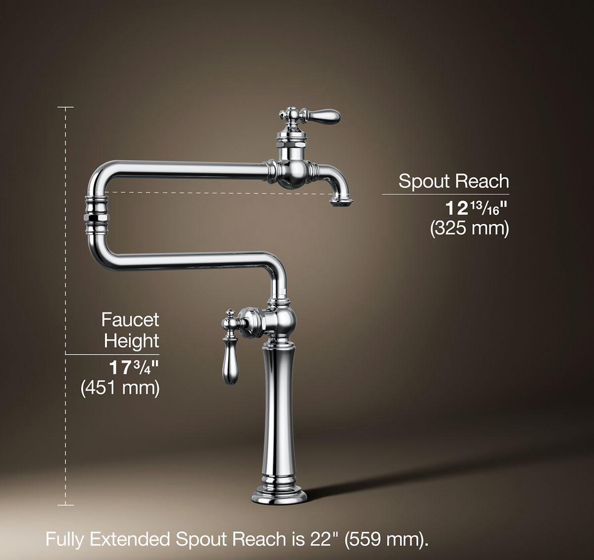 - Articulating spout with 360° rotation offers superior clearance for filling pots on cooktops and ranges.