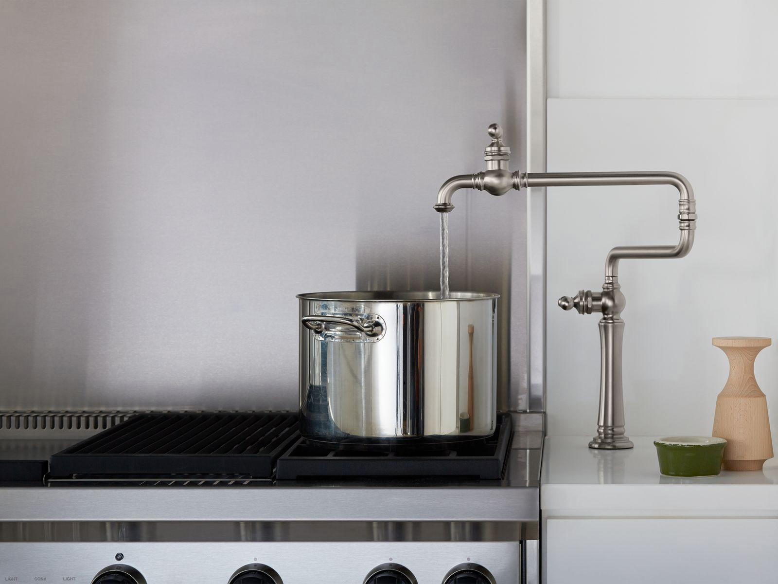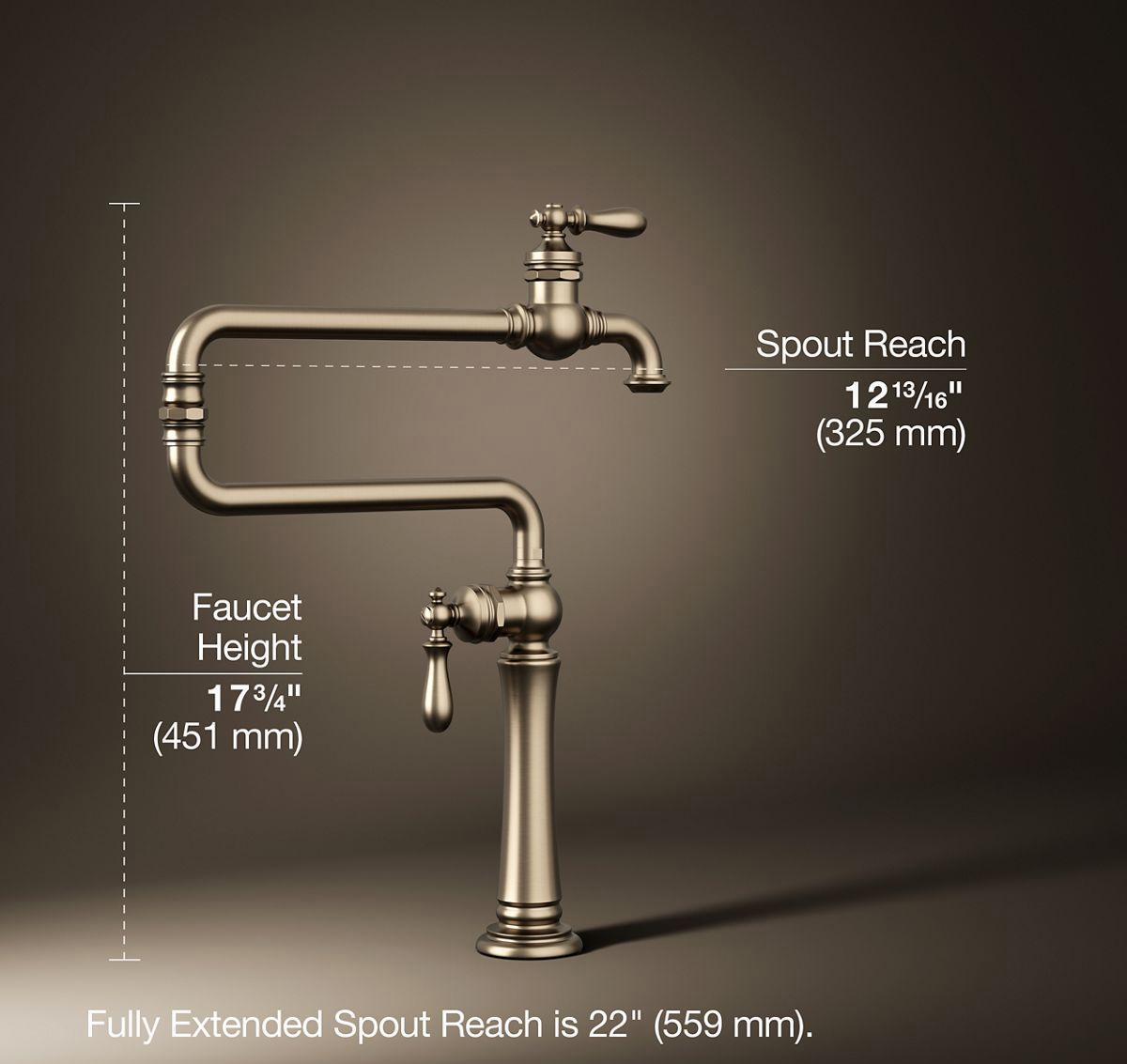 - Articulating spout with 360° rotation offers superior clearance for filling pots on cooktops and ranges