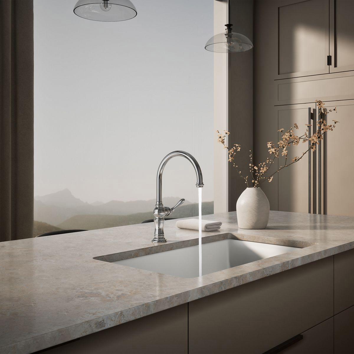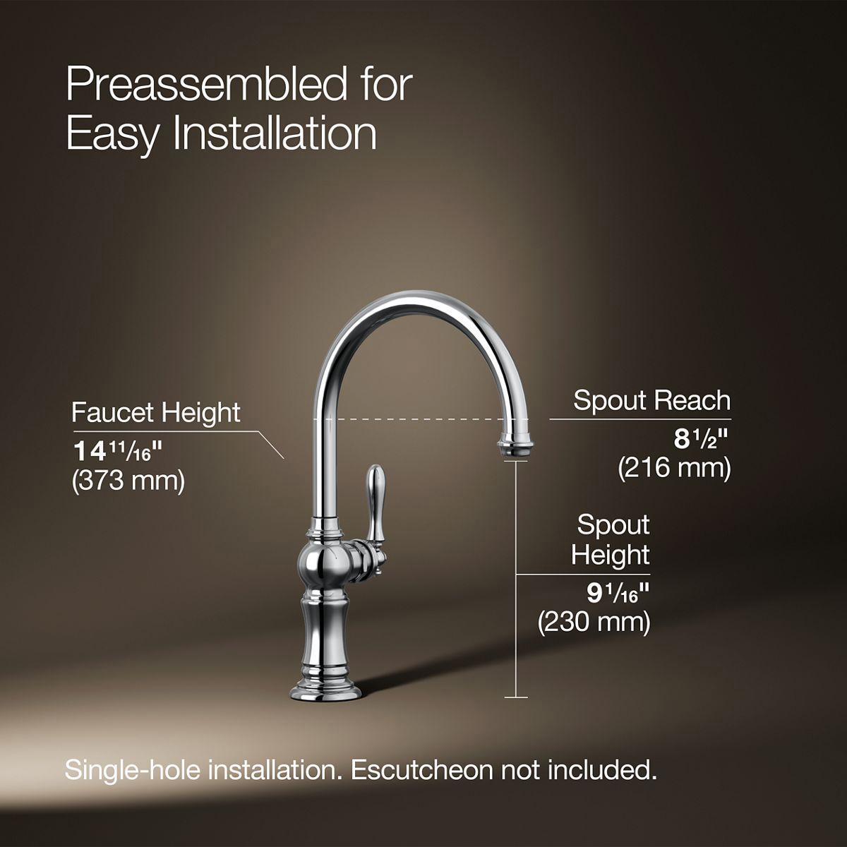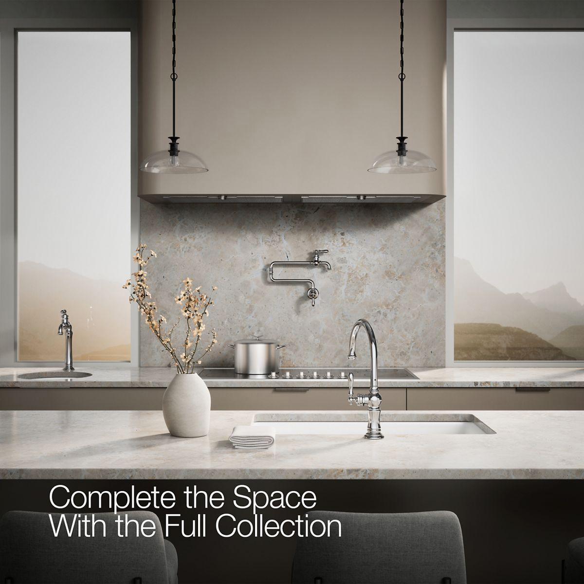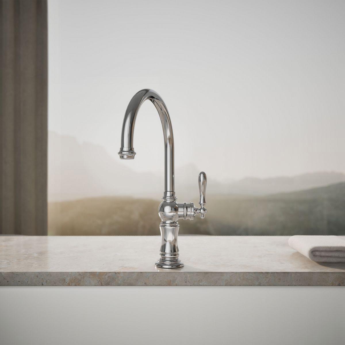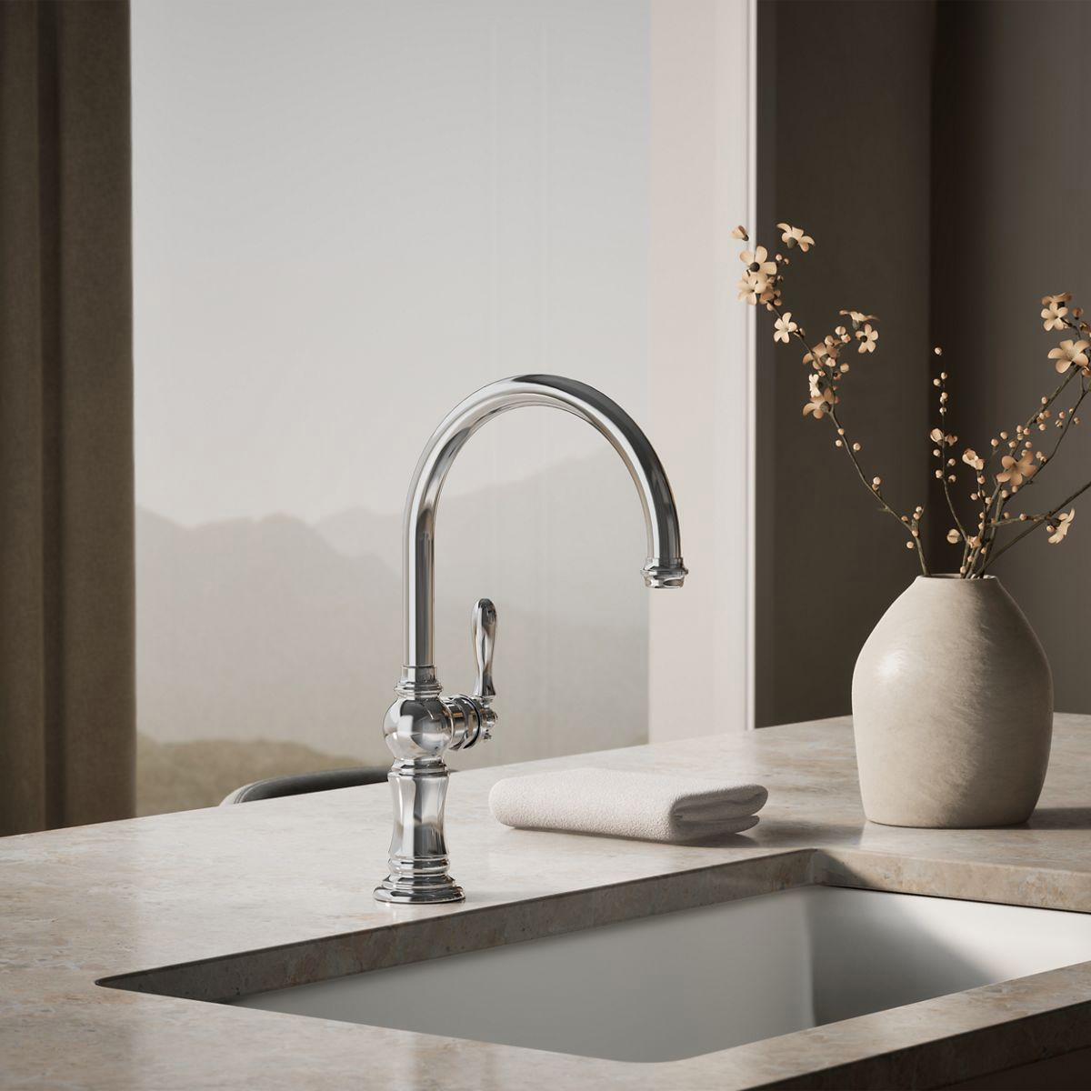 The Artifacts faucet collection brings you classic designs reimagined in fresh new ways for various task areas of the kitchen. This Artifacts kitchen sink faucet displays vintage style with its high-arch swing spout and turned lever handle.