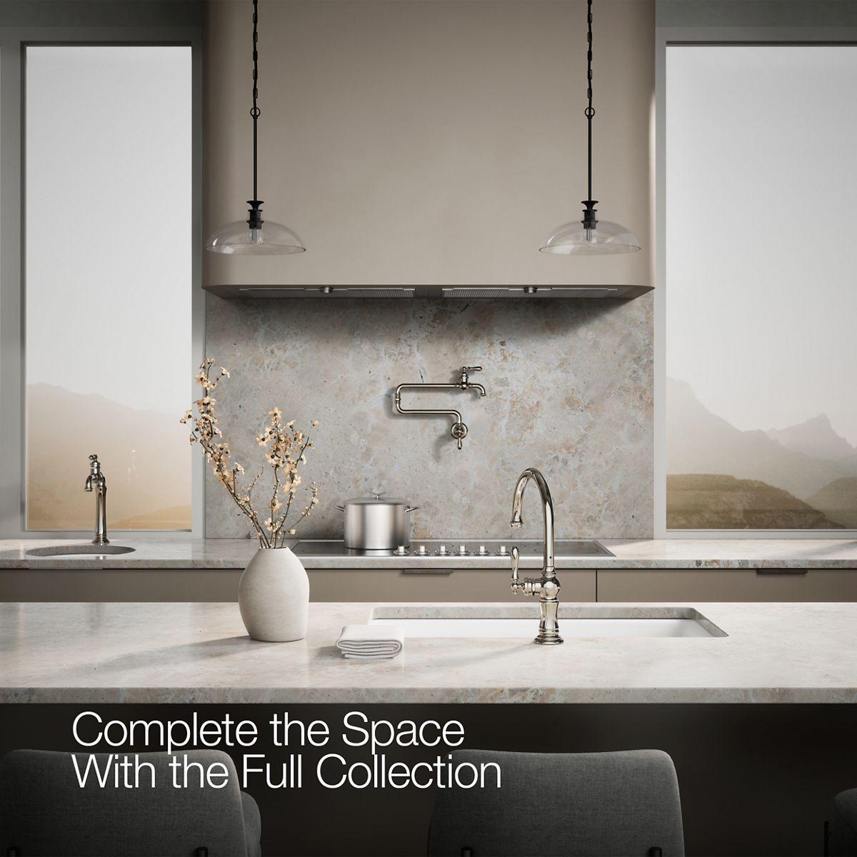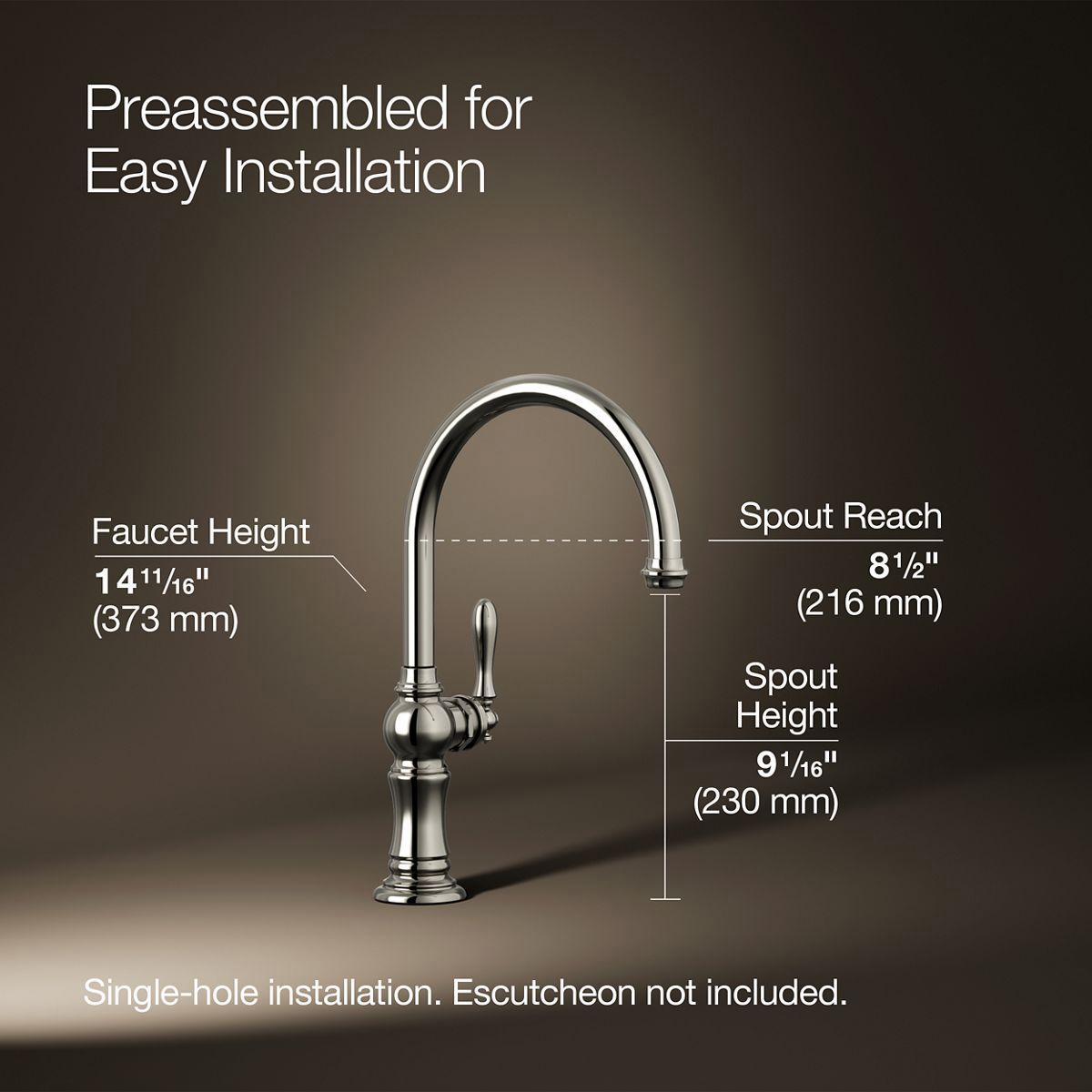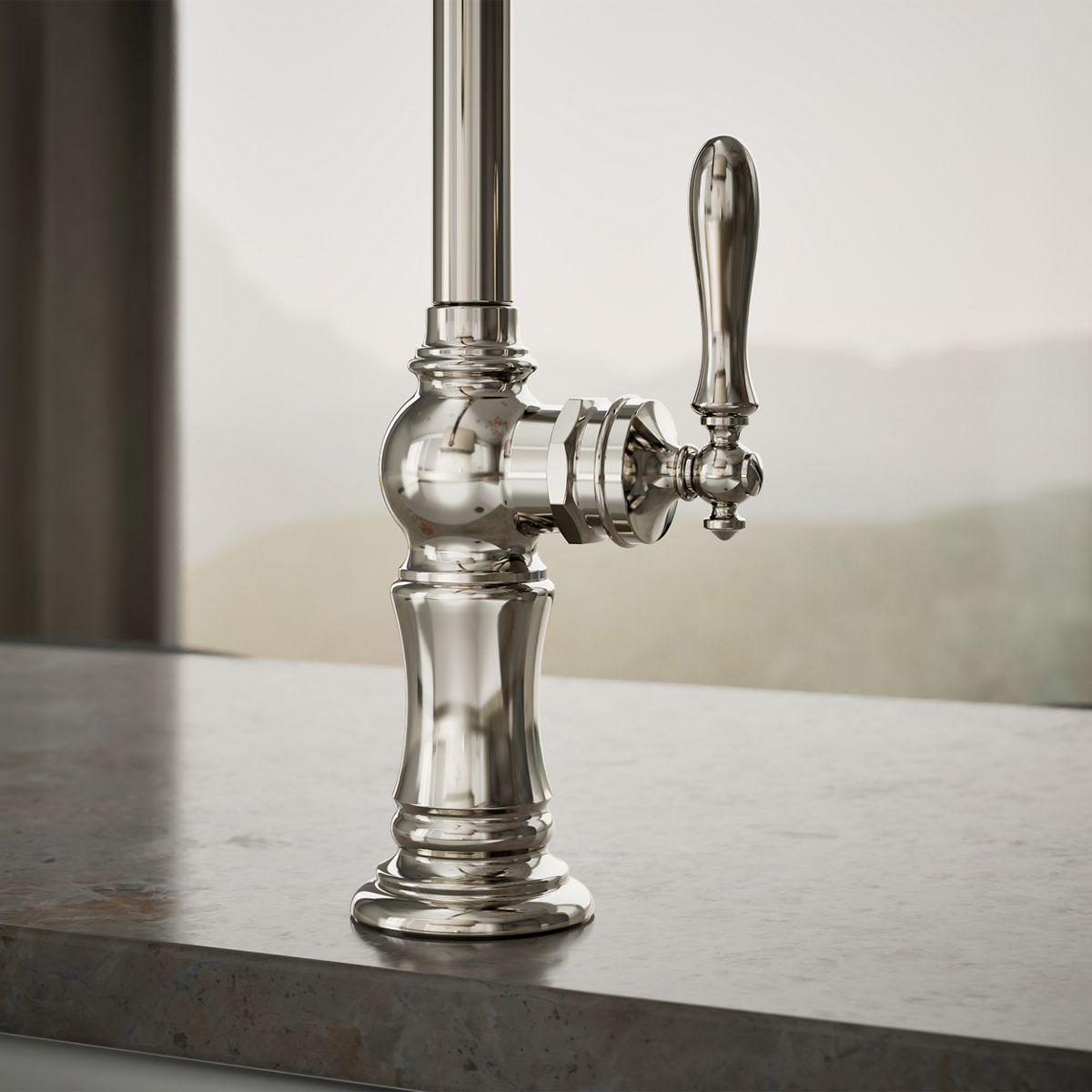 The Artifacts faucet collection brings you classic designs reimagined in fresh new ways for various task areas of the kitchen. This Artifacts kitchen sink faucet displays vintage style with its high-arch swing spout and turned lever handle.