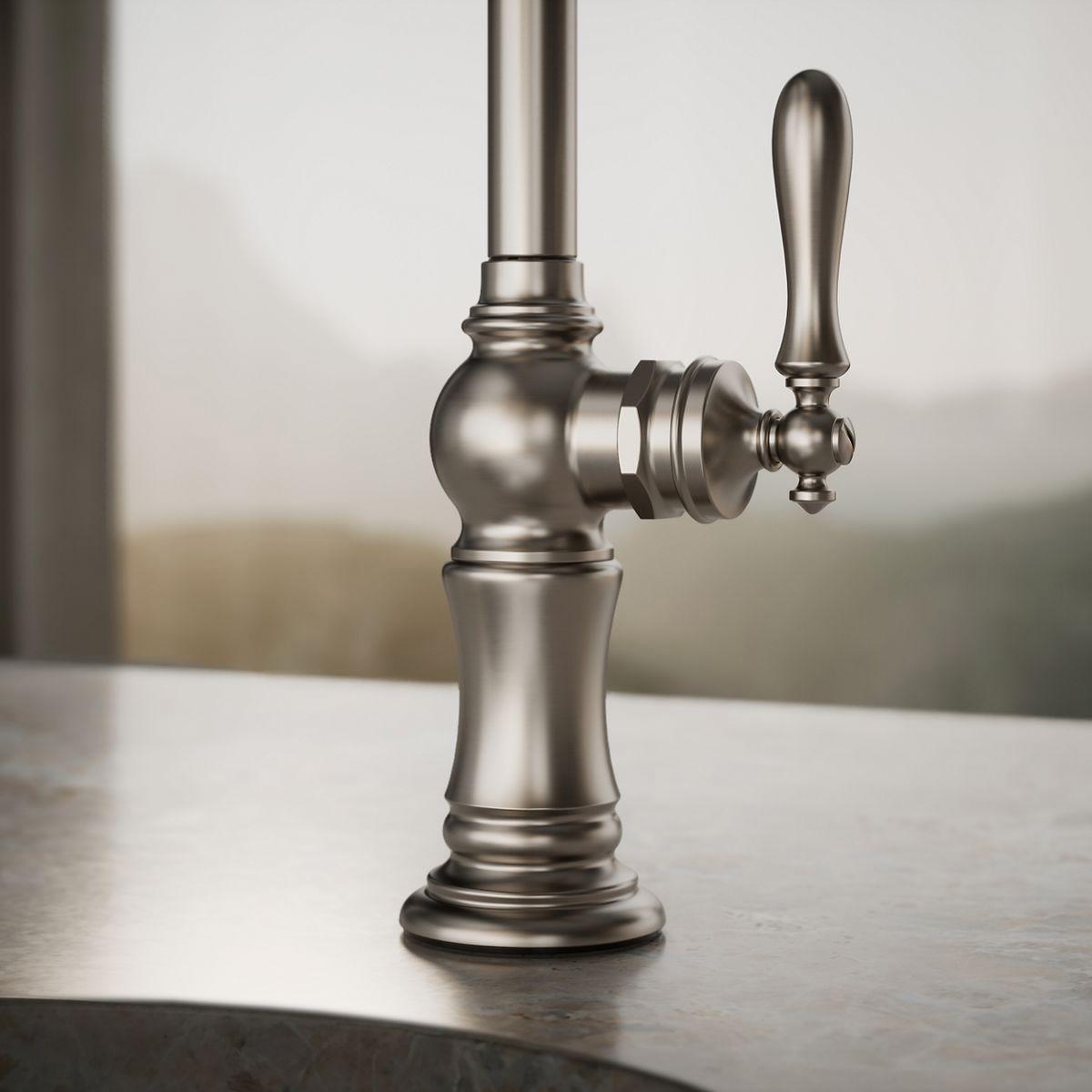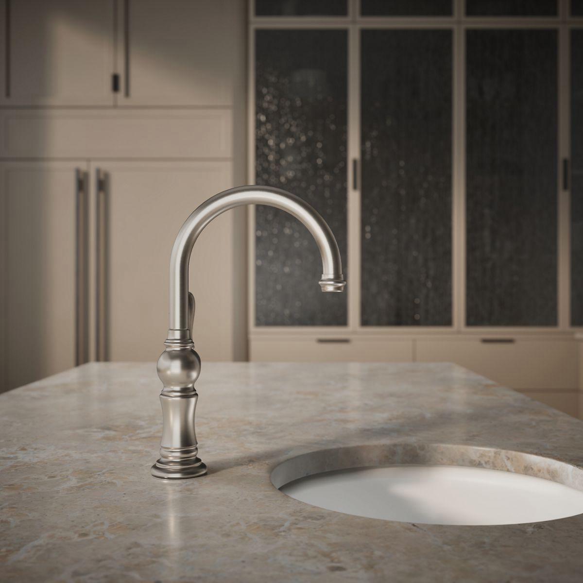 The Artifacts faucet collection brings you classic designs reimagined in fresh new ways for various task areas of the kitchen. This Artifacts bar sink faucet displays vintage style with its high-arch swing spout and turned lever handle.
