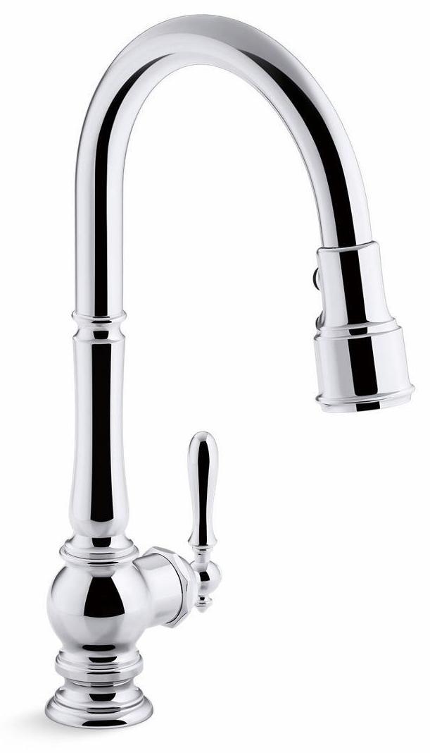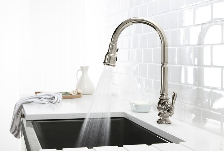 The Artifacts faucet collection brings you classic designs reimagined in fresh new ways for various task areas of the kitchen. This Artifacts kitchen sink faucet displays vintage style with its high-arch spout and turned lever handle. The three-function pull-down sprayhead has you covered for a range of tasks: BerrySoft spray for food prep; an aerated stream for filling pots; and Sweep spray for cleaning. Kohler's DockNetik docking system secures the sprayhead to the spout using magnetic force.