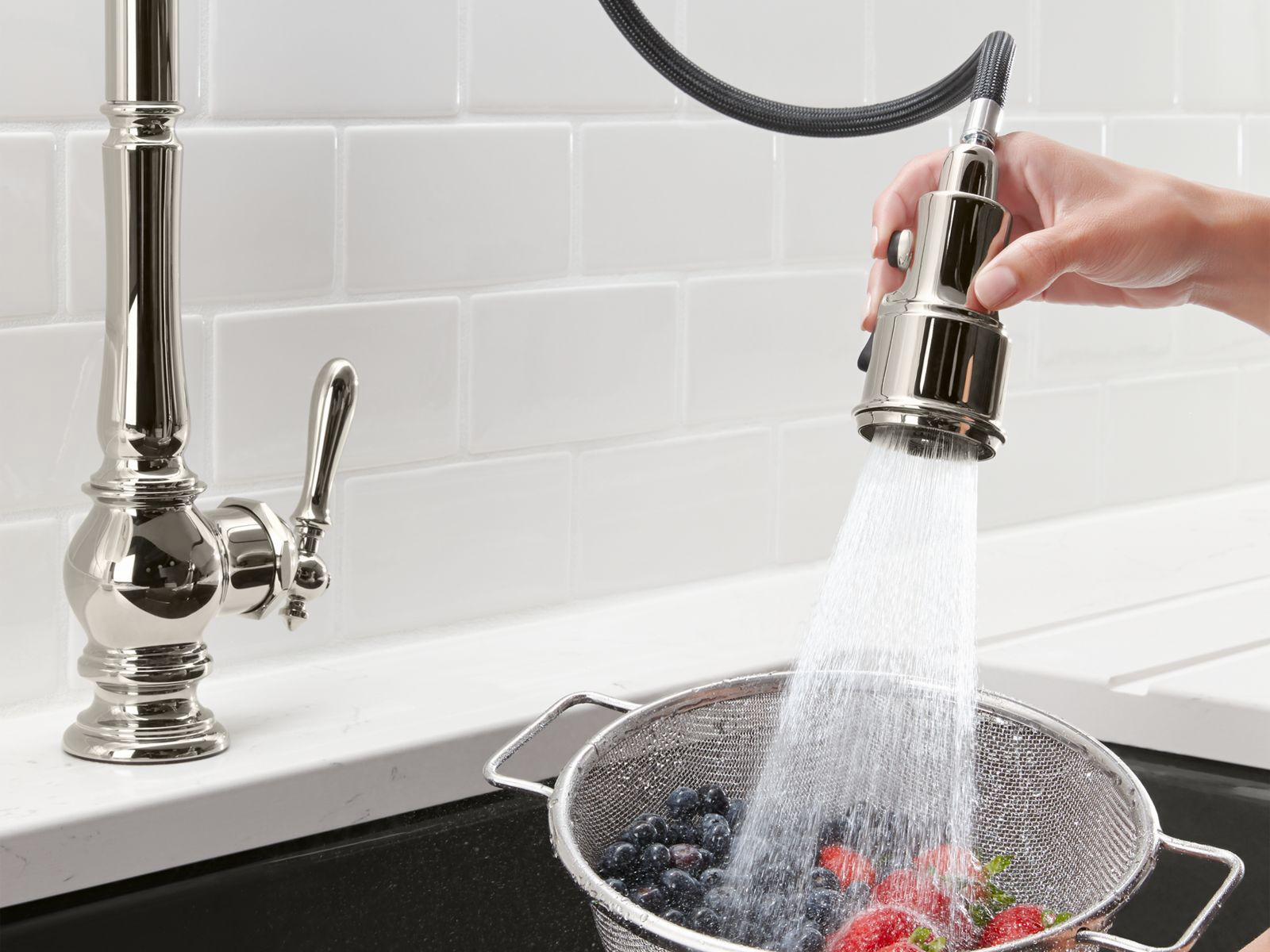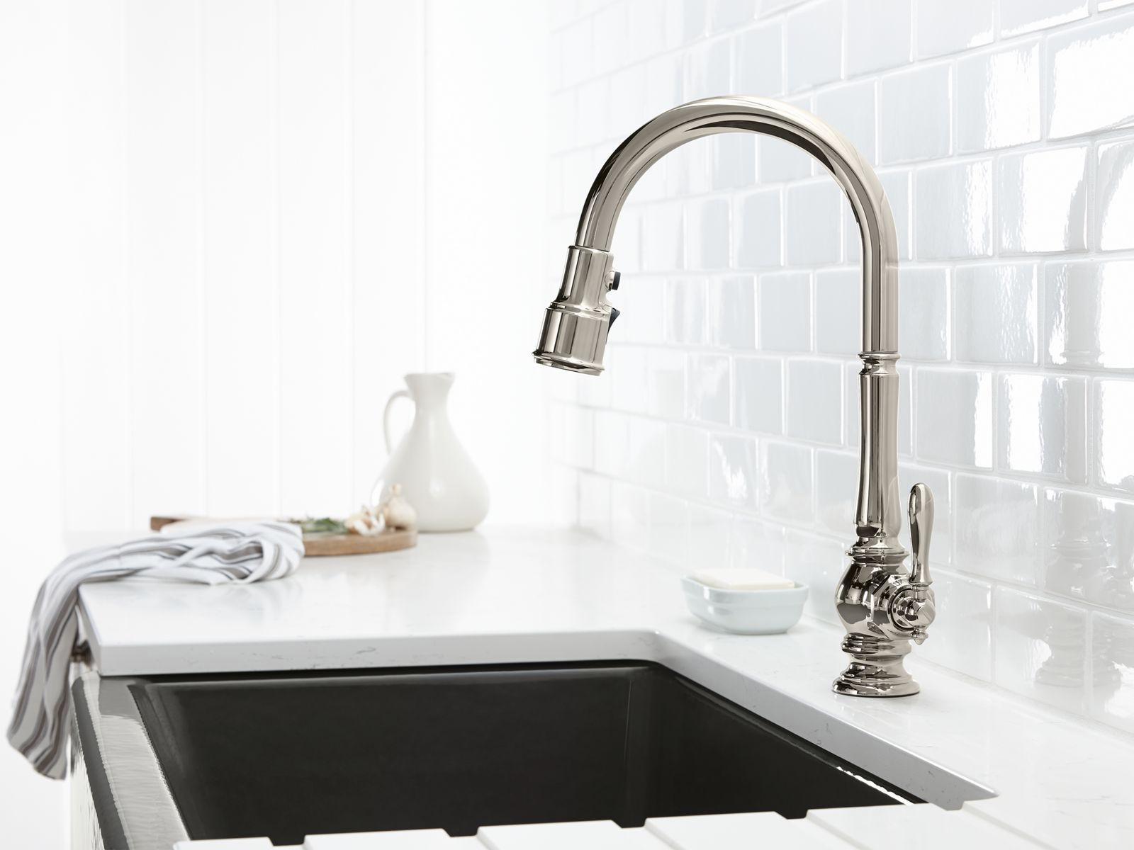 The Artifacts faucet collection brings you classic designs reimagined in fresh ways for various task areas of the kitchen. This Artifacts kitchen sink faucet displays vintage style with its high-arch spout and turned lever handle. The three-function pull-down sprayhead has you covered for a range of tasks: BerrySoft spray for food prep; an aerated stream for filling pots; and Sweep spray for cleaning. Kohler's DockNetik docking system secures the sprayhead to the spout.