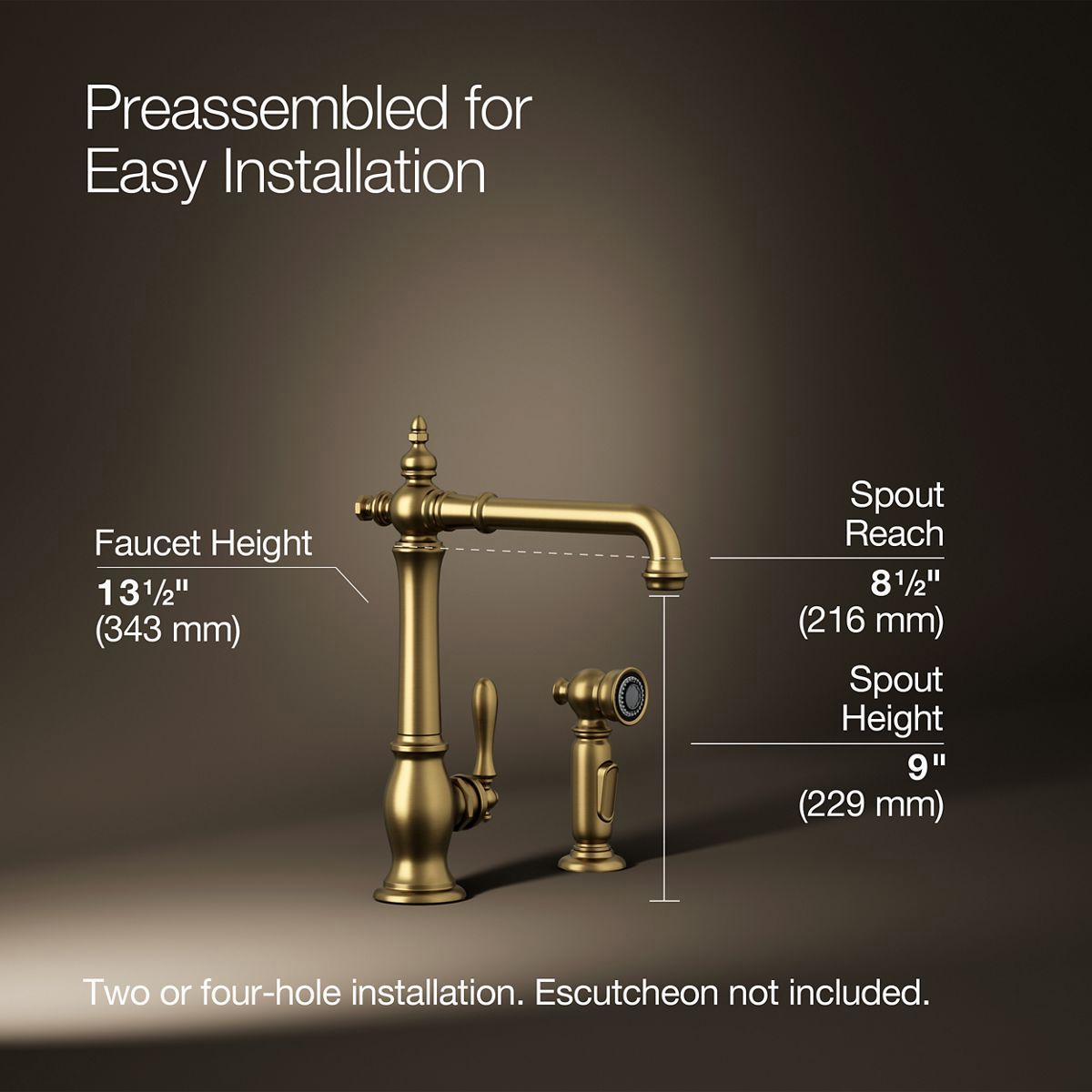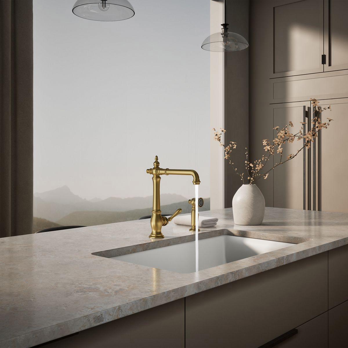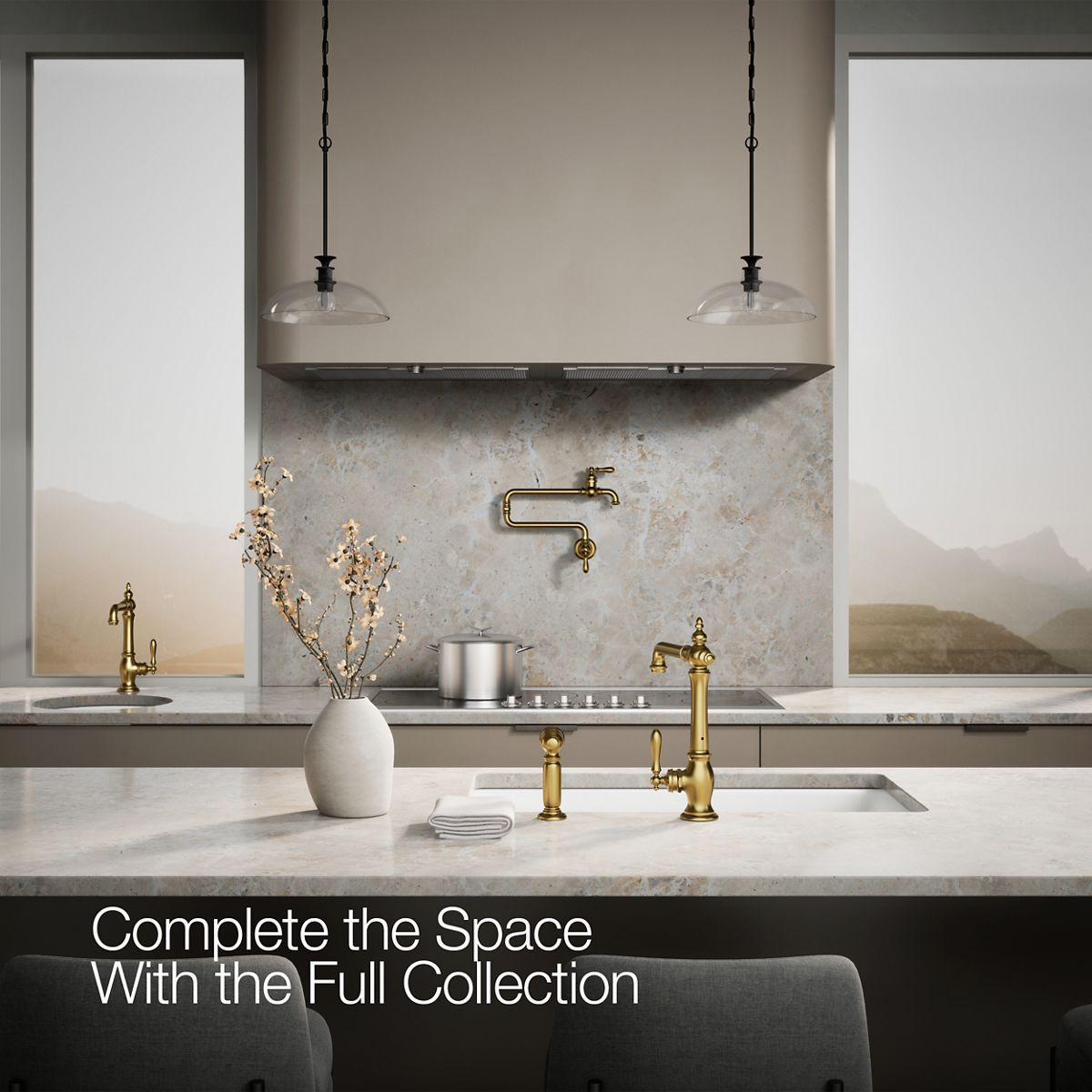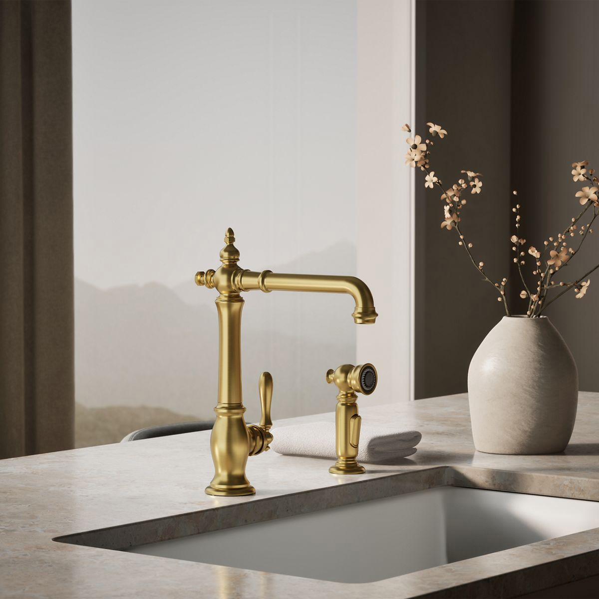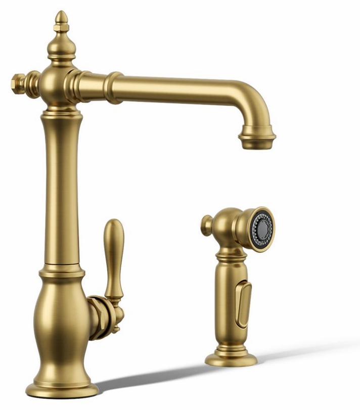 The Artifacts faucet collection brings you classic designs reimagined in fresh new ways for various task areas of the kitchen. This Victorian-inspired kitchen sink faucet features an elegant column design with convenient swing spout. The matched side spray lets you switch between BerrySoft spray for food prep and Sweep spray for cleaning.