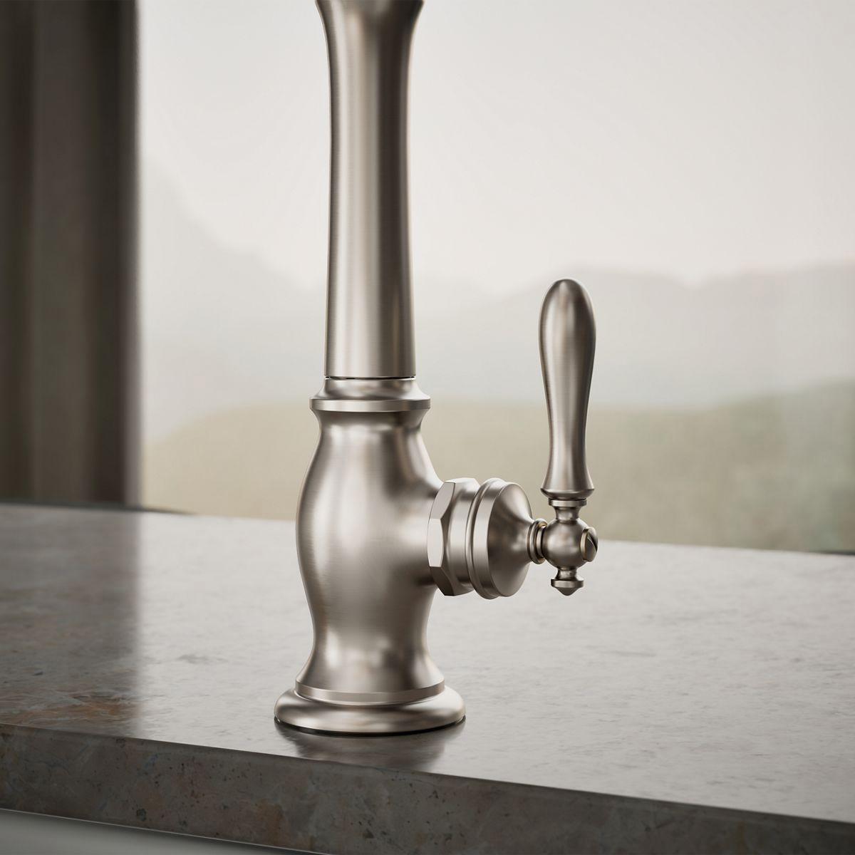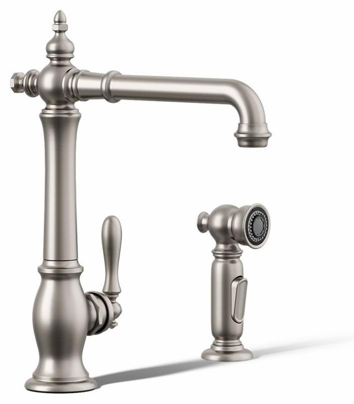 The Artifacts faucet collection brings you classic designs reimagined in fresh new ways for various task areas of the kitchen. This Victorian-inspired kitchen sink faucet features an elegant column design with convenient swing spout. The matched side spray lets you switch between BerrySoft spray for food prep and Sweep spray for cleaning.
