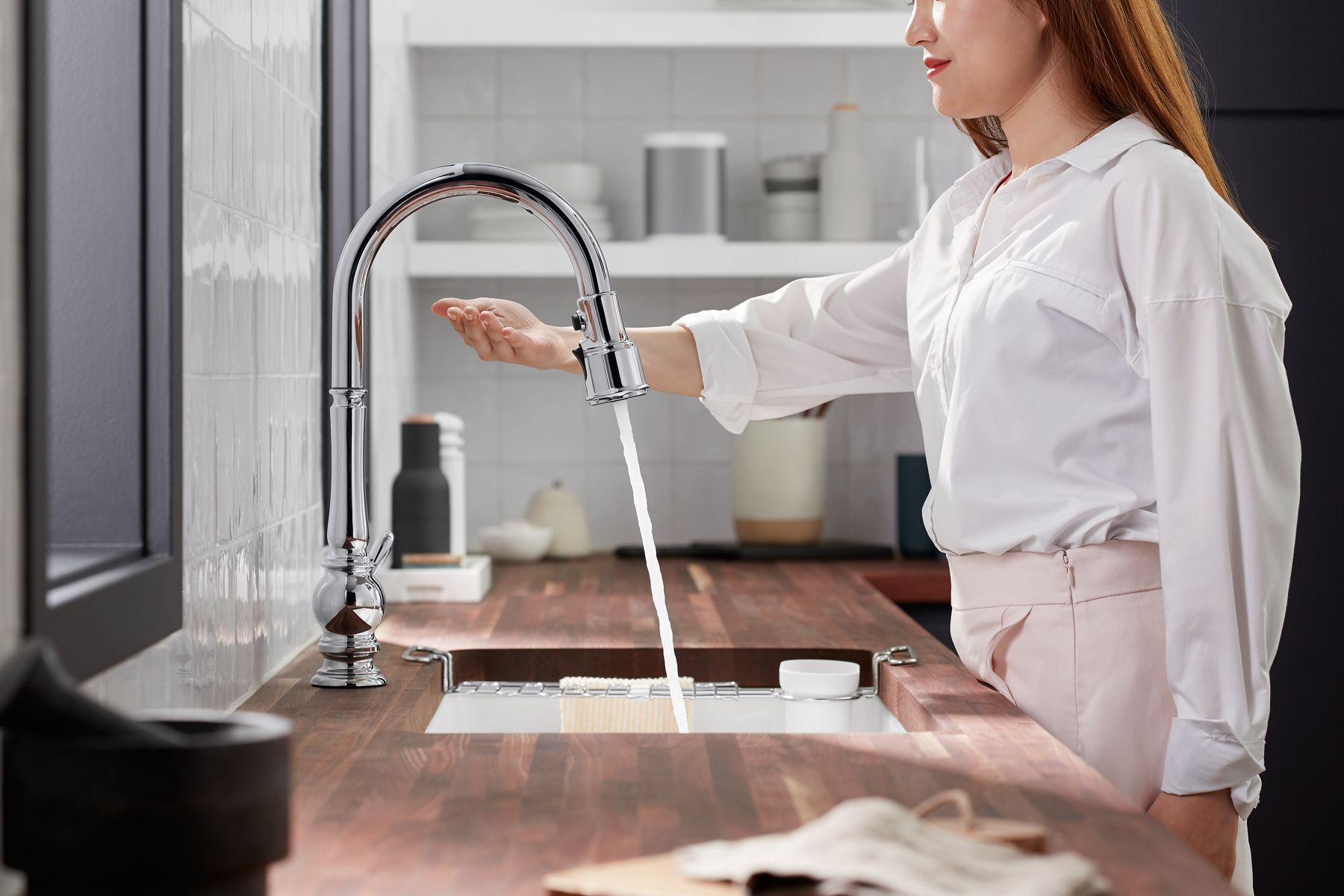 The Artifacts touchless faucet combines vintage style with state-of-the-art touchless technology. With a precision sensor built into the spout, the Artifacts touchless faucet lets you speed through tasks while enjoying a cleaner, more hygienic kitchen environment. Intuitive Response technology is in tune with your every move: a simple wave of your hand—or an object such as a pan or utensil—turns the faucet on or off. The three-function pull-down sprayhead has you covered for a range of tasks: BerrySoft spray for food prep; an aerated stream for filling pots; and powerful Sweep spray for cleaning.