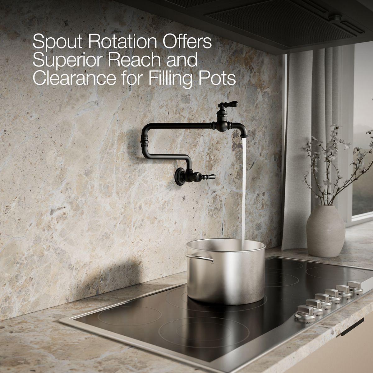 - Articulating spout with 360° rotation offers superior clearance for filling pots on cooktops and ranges