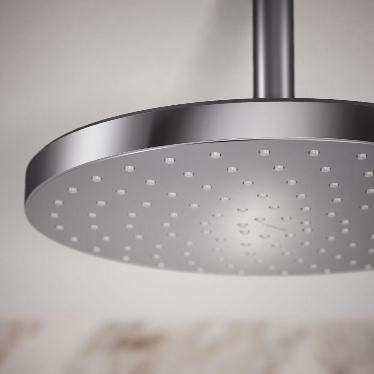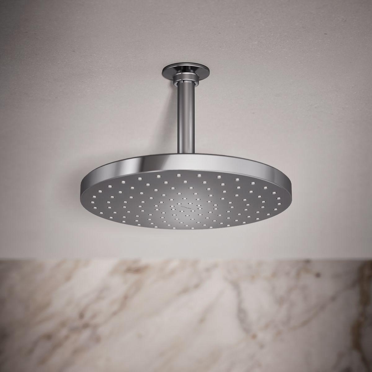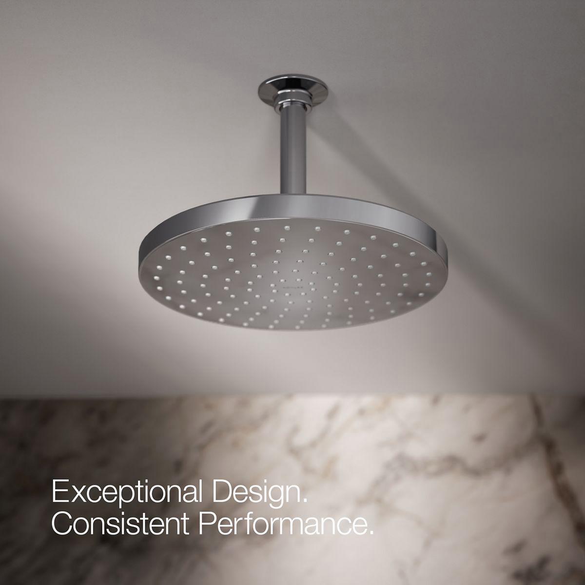 Bring the invigorating freshness of a summer rain to your shower with the Awaken rainhead. An optimized sprayface with angled nozzles generates a uniform spray pattern with wide, even coverage, simulating the experience of walking in a warm rainshower. The Awaken rainhead can be installed on a wall- or ceiling-mount shower arm, and a swivel joint allows for precise placement of the spray. Its simple and contemporary design complements the Awaken collection.