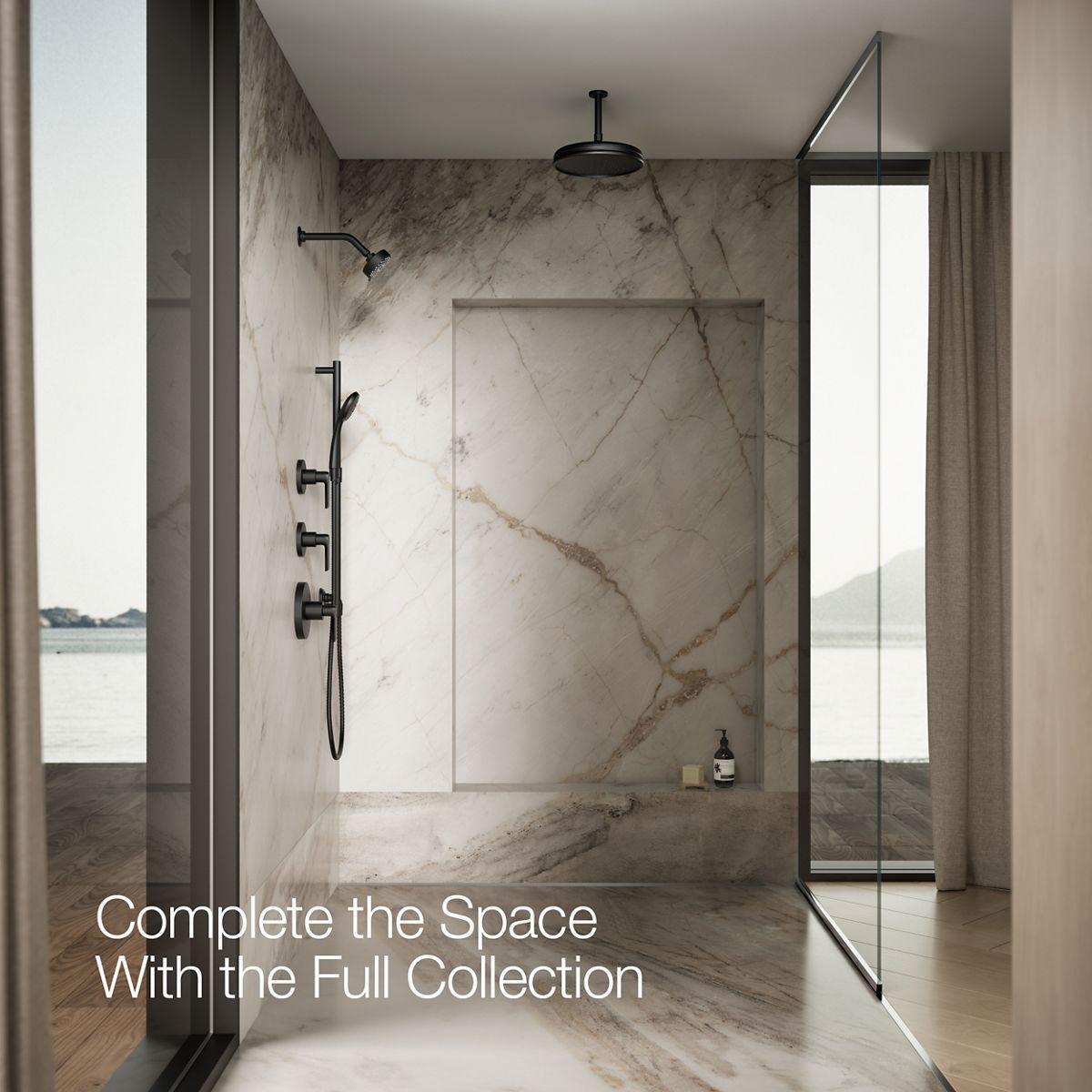The Awaken showerhead brings KOHLER quality, design, and performance to your bath. Advanced spray performance delivers three distinct sprays - wide coverage, intense drenching, or targeted - while an ergonomically designed thumb tab smoothly transitions between sprays with a quick touch. The artfully sculpted sprayface reveals simple, architectural forms that complement contemporary and minimalist baths.