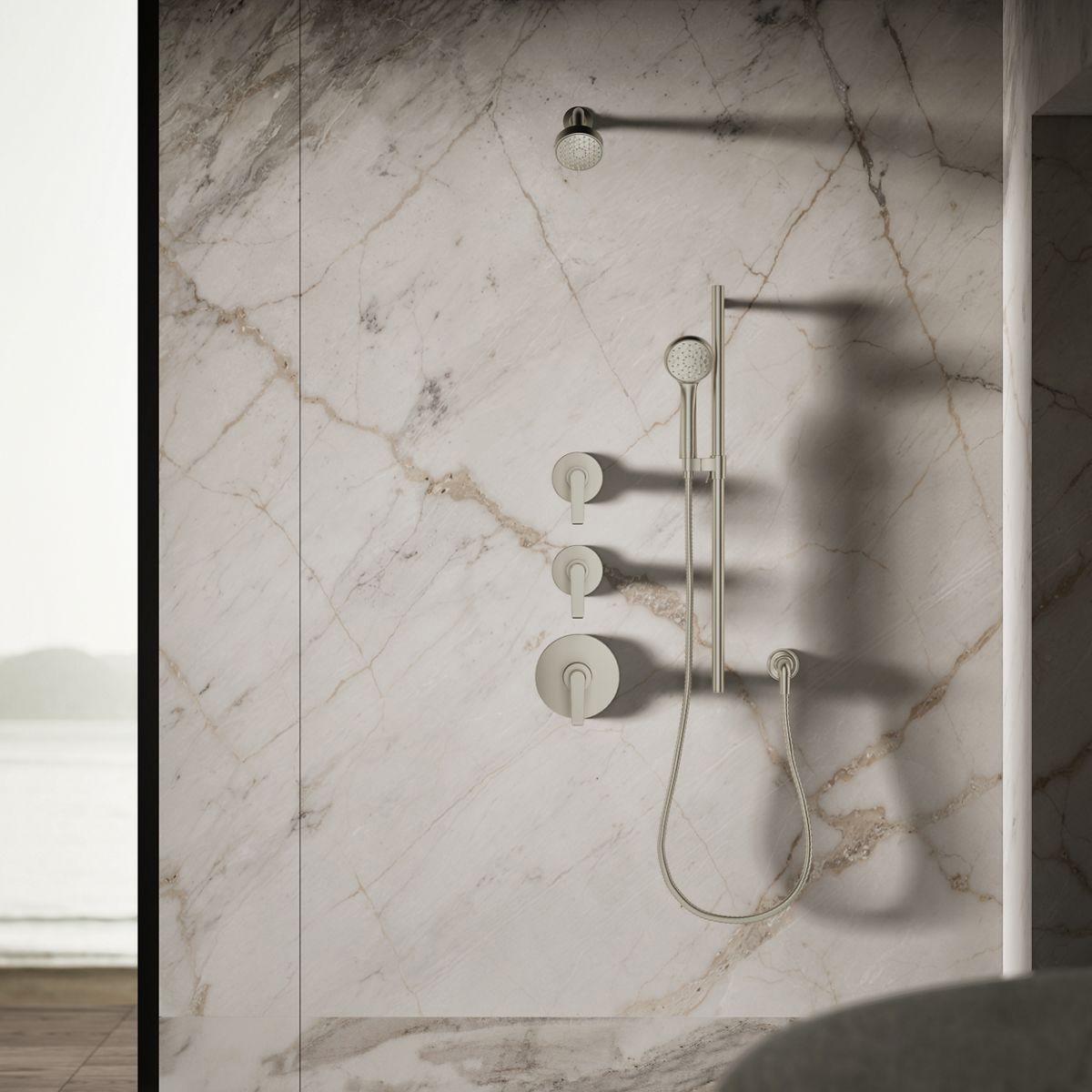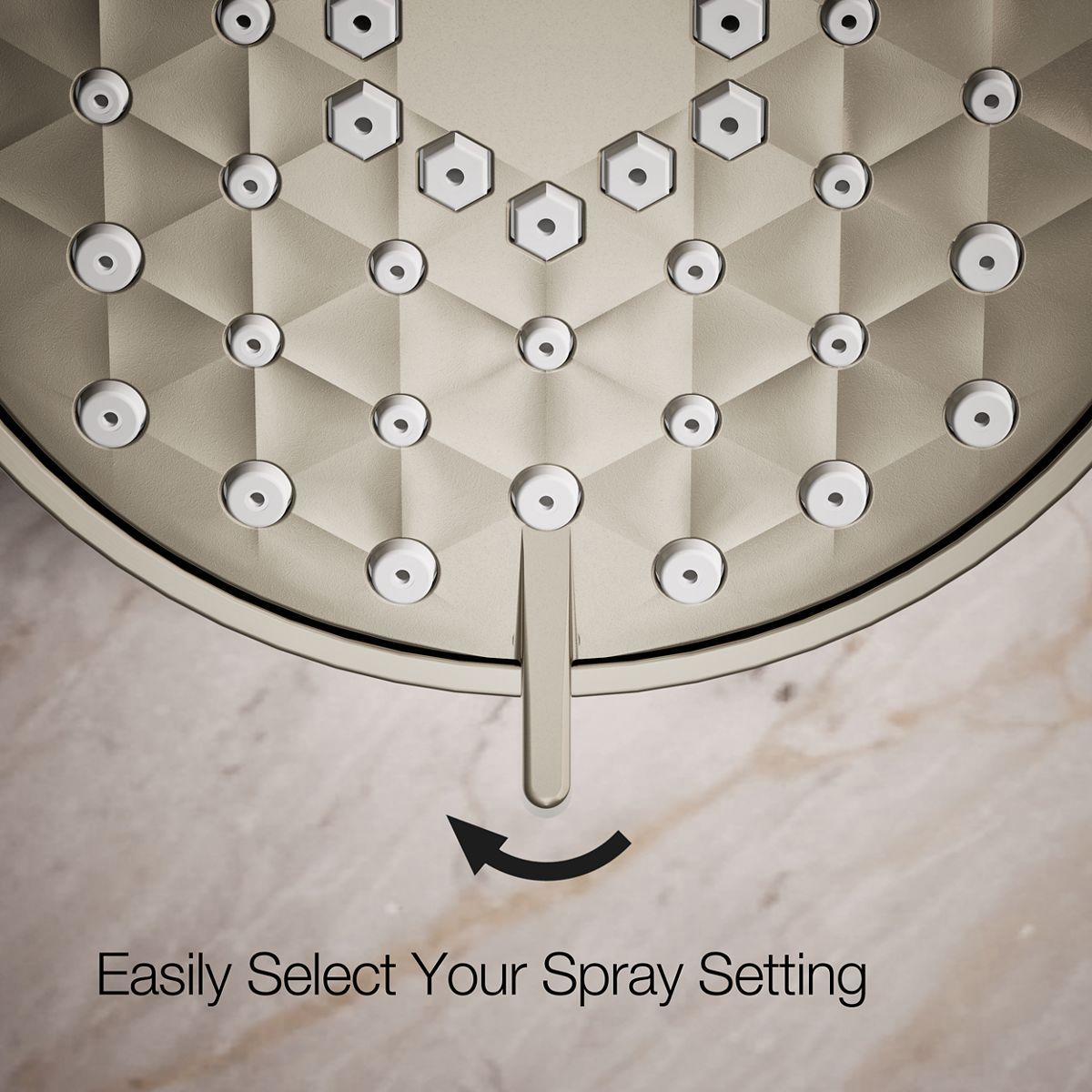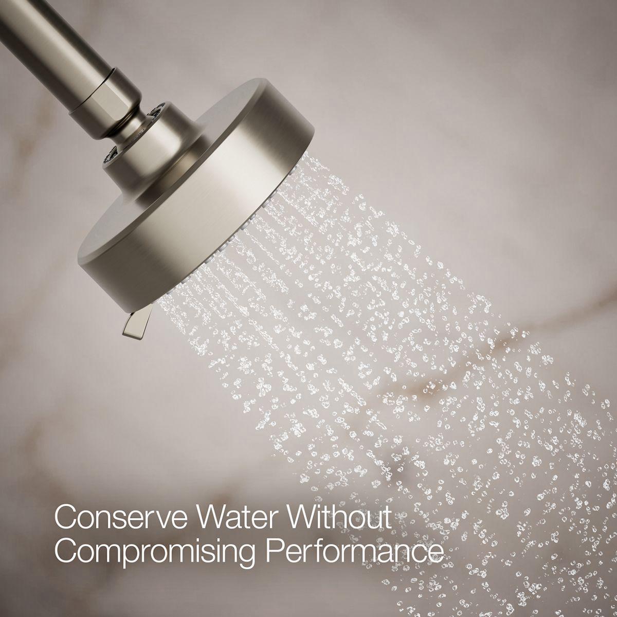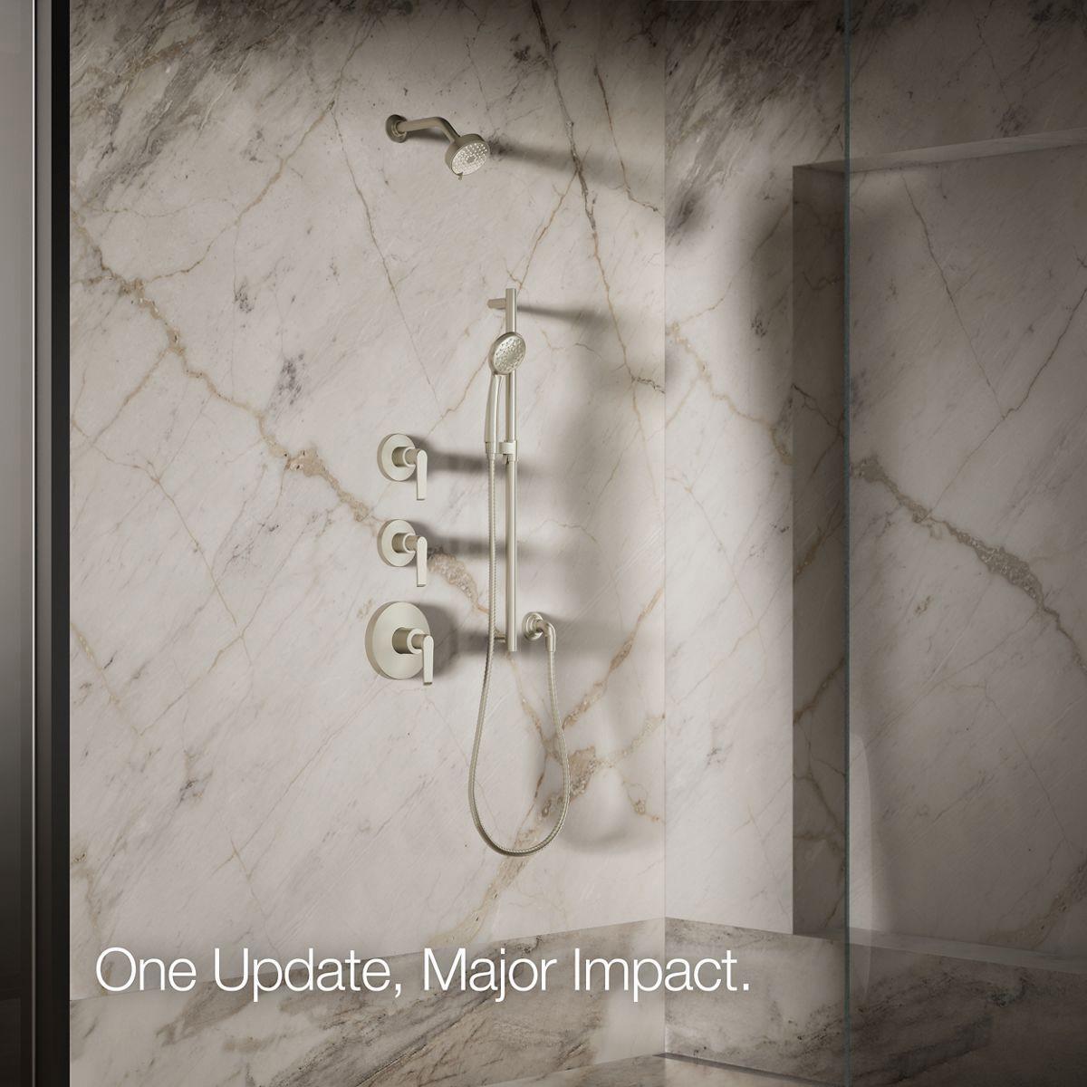 The Awaken showerhead brings KOHLER quality, design, and performance to your bath. Advanced spray performance delivers three distinct sprays - wide coverage, intense drenching, or targeted - while an ergonomically designed thumb tab smoothly transitions between sprays with a quick touch. The artfully sculpted sprayface reveals simple, architectural forms that complement contemporary and minimalist baths.