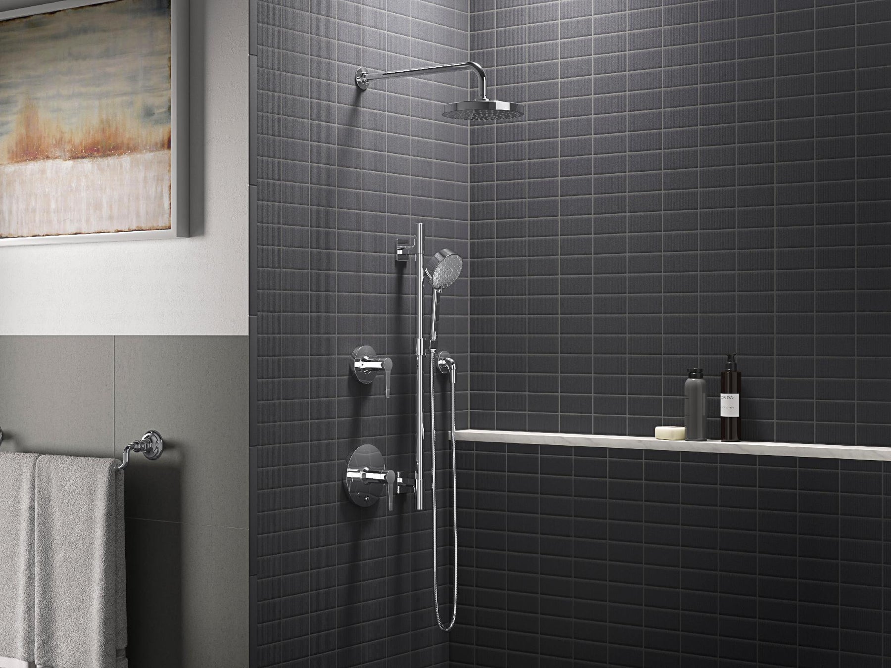 The Awaken showering kit is a simple way to upgrade your shower. This Awaken showering kit includes a single-function rainhead, ergonomically designed multifunction handshower, 24" slidebar, rainhead arm with flange, supply elbow with check valve, 60" handshower hose, valve trim, and mounting hardware. Complete the installation with Rite-Temp and MasterShower® valves.