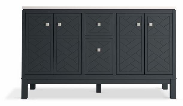 Rococo ornamentation meets clean, modern design in the uniquely patterned Beauxline vanity collection. Featuring geometric door- and drawer-front fretwork insets on cleanly molded frames, these Chippendale-style works of art come ready to install, no matter your experience level. Customize your bathroom’s main attraction with your choice of cabinet color; cabinet, countertop, sinks, and Vibrant Brushed Nickel hardware are all included with the vanity set. Additional hardware finishes are also available.