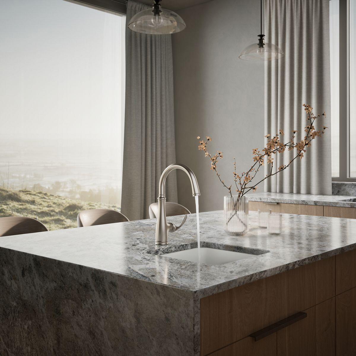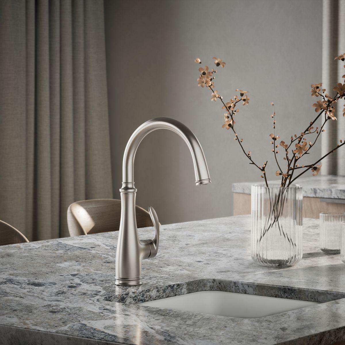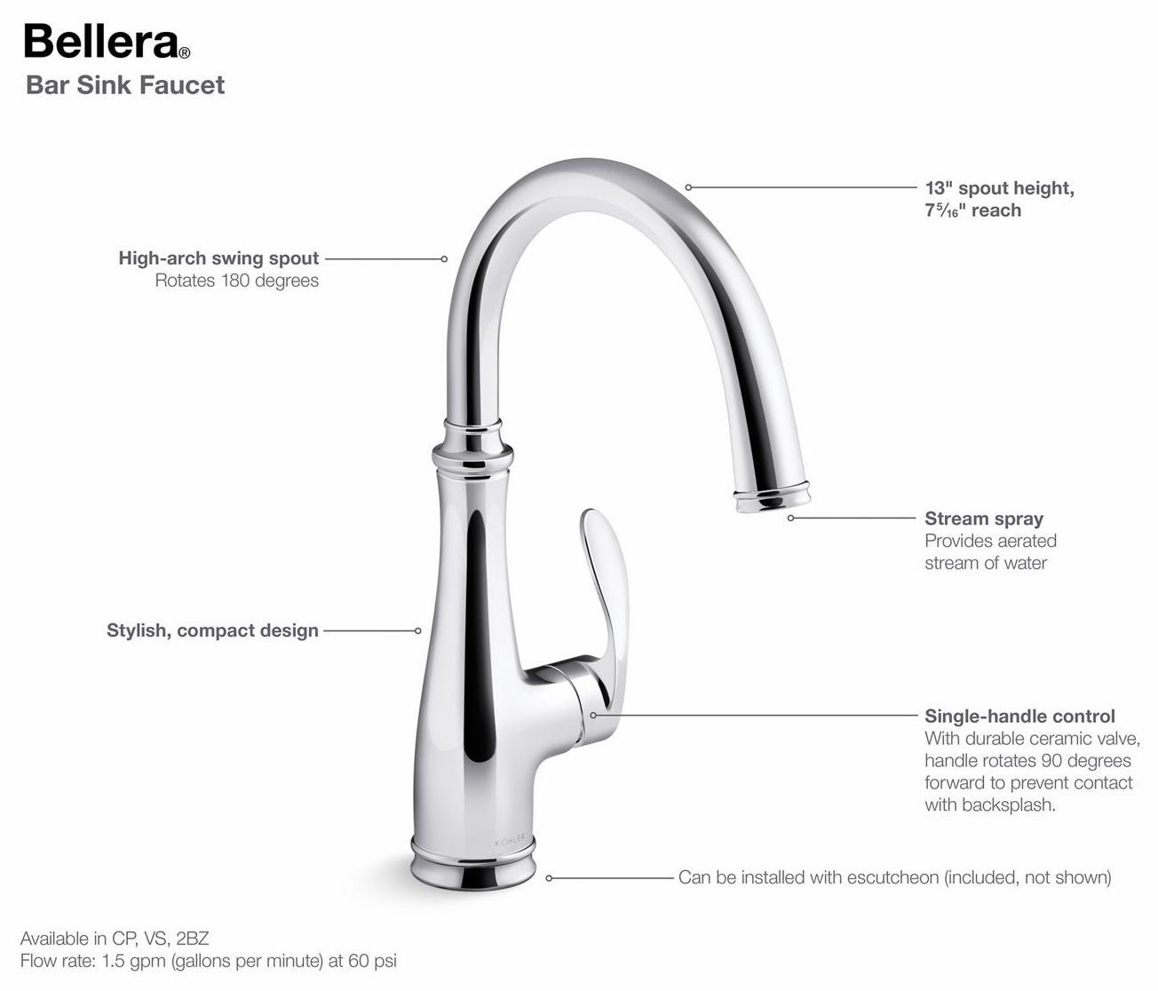 With an elegant, versatile design, this Bellera faucet offers exceptional functionality for a bar sink or secondary kitchen sink. The high-arch spout swivels 180 degrees, giving you wide coverage for food and drink prep and simplifying cleanup.