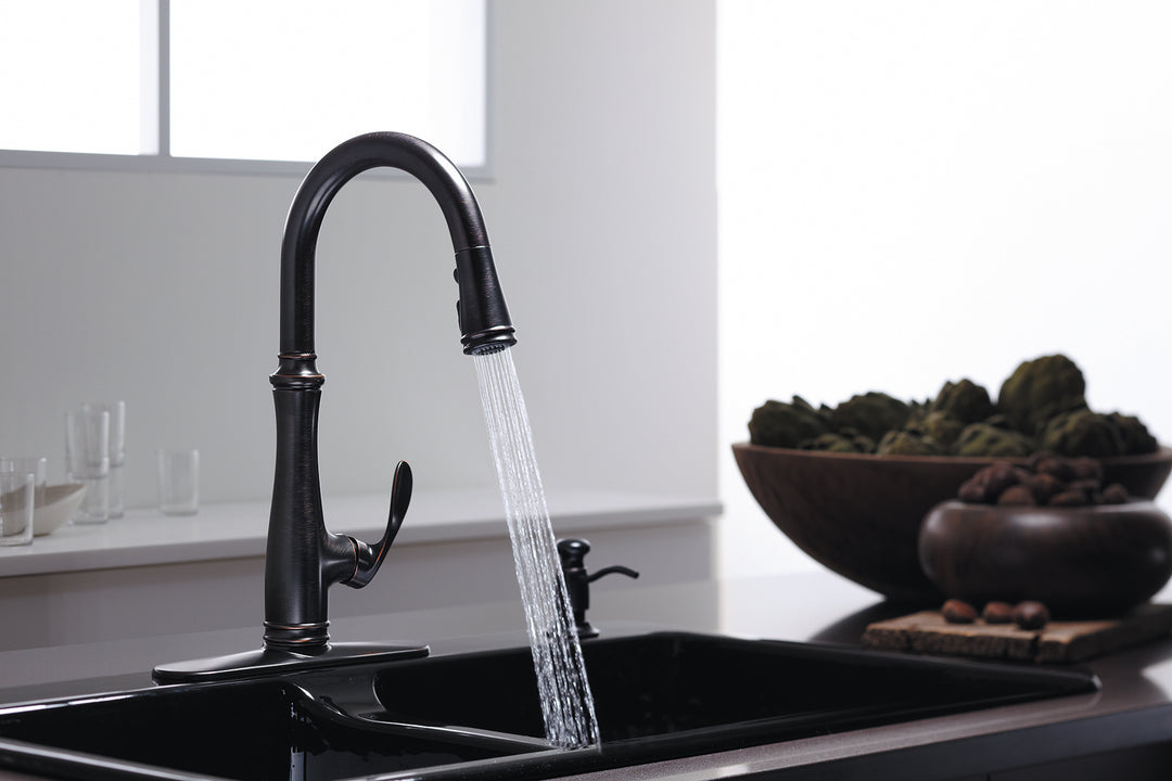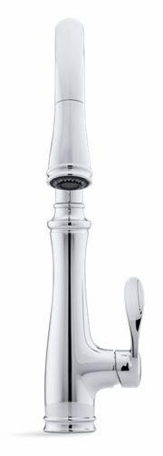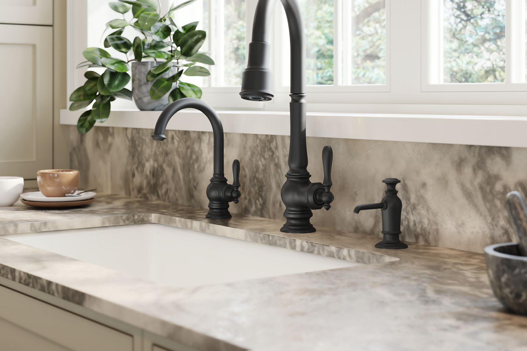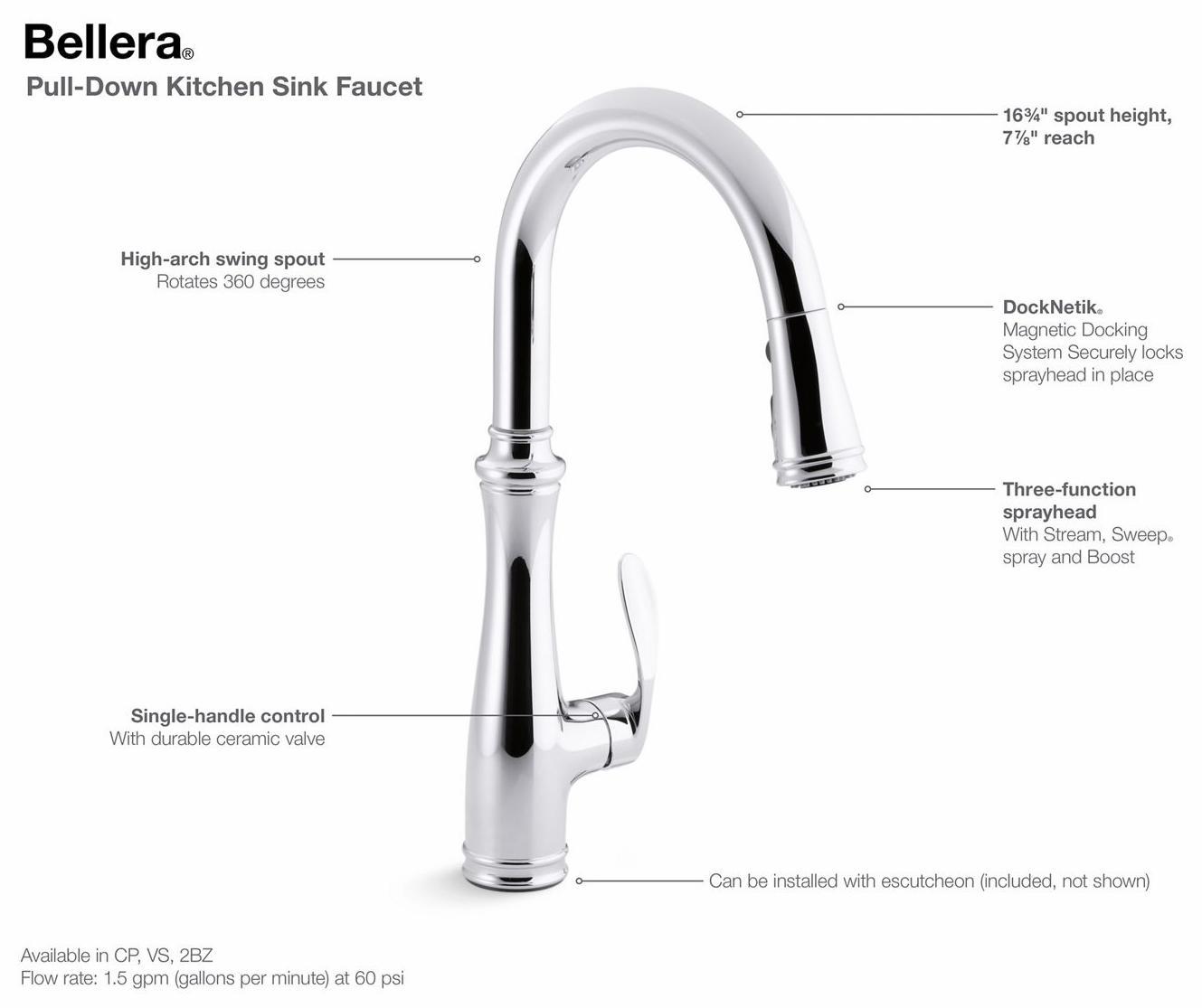With its sleek look and innovative features, this Bellera pull-down kitchen faucet combines an elegant, versatile design with exceptional ergonomics and functionality. The high-arch spout rotates 360 degrees and reaches over the tallest pots, while the compact, three-function sprayhead pulls down into the sink for up-close tasks, or out of the sink to fill pots. Sweep spray creates a wide, forceful blade of water for superior cleaning. Kohler's new docking system, DockNetik, secures the pull-down sprayhead to the spout using magnetic force.