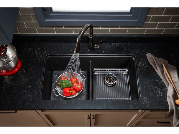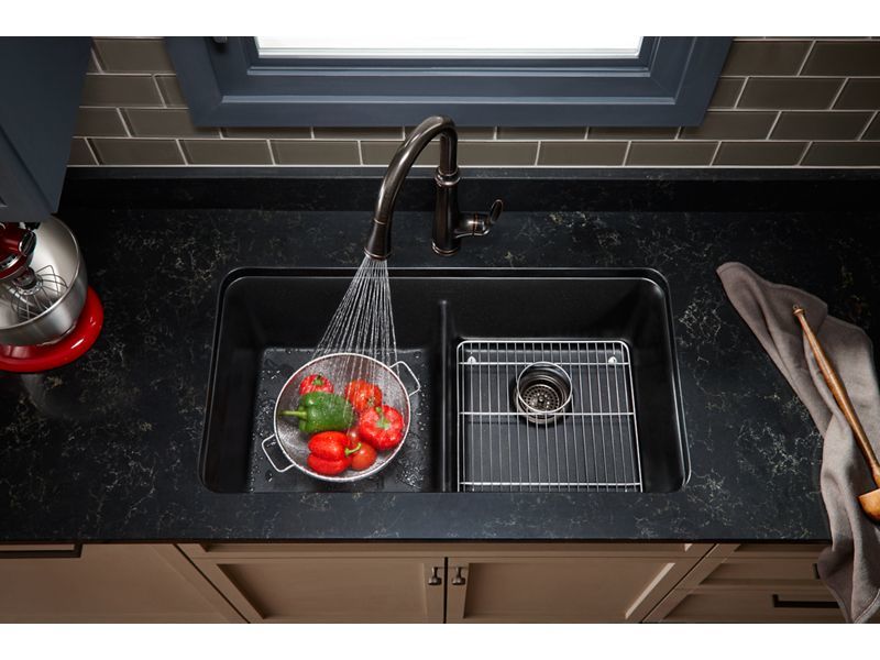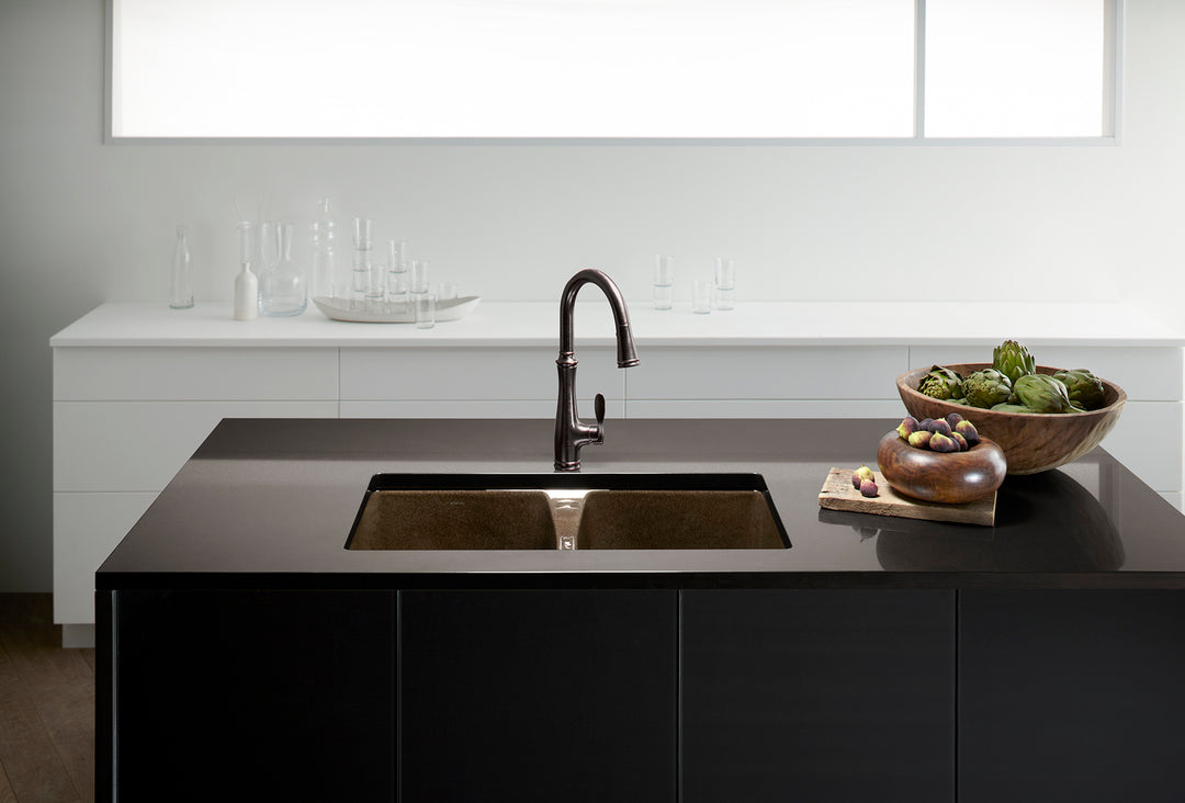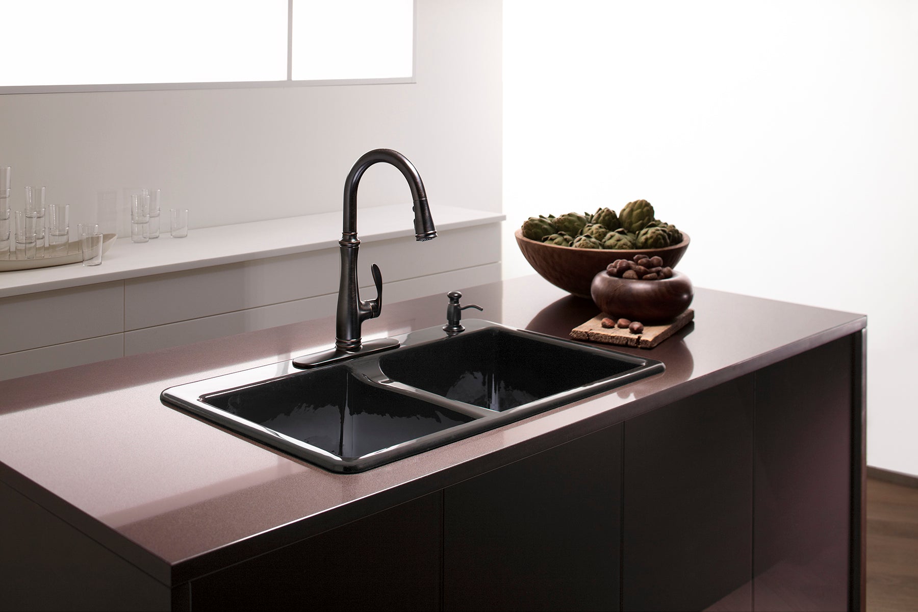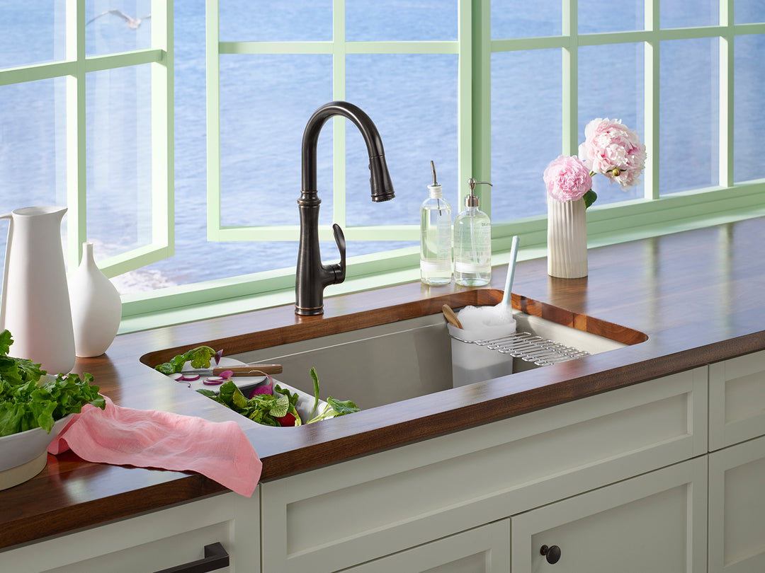 With its sleek look and innovative features, this Bellera pull-down kitchen faucet combines an elegant, versatile design with exceptional ergonomics and functionality. The high-arch spout rotates 360 degrees and reaches over the tallest pots, while the compact, three-function sprayhead pulls down into the sink for up-close tasks, or out of the sink to fill pots. Sweep spray creates a wide, forceful blade of water for superior cleaning. Kohler's new docking system, DockNetik, secures the pull-down sprayhead to the spout using magnetic force.