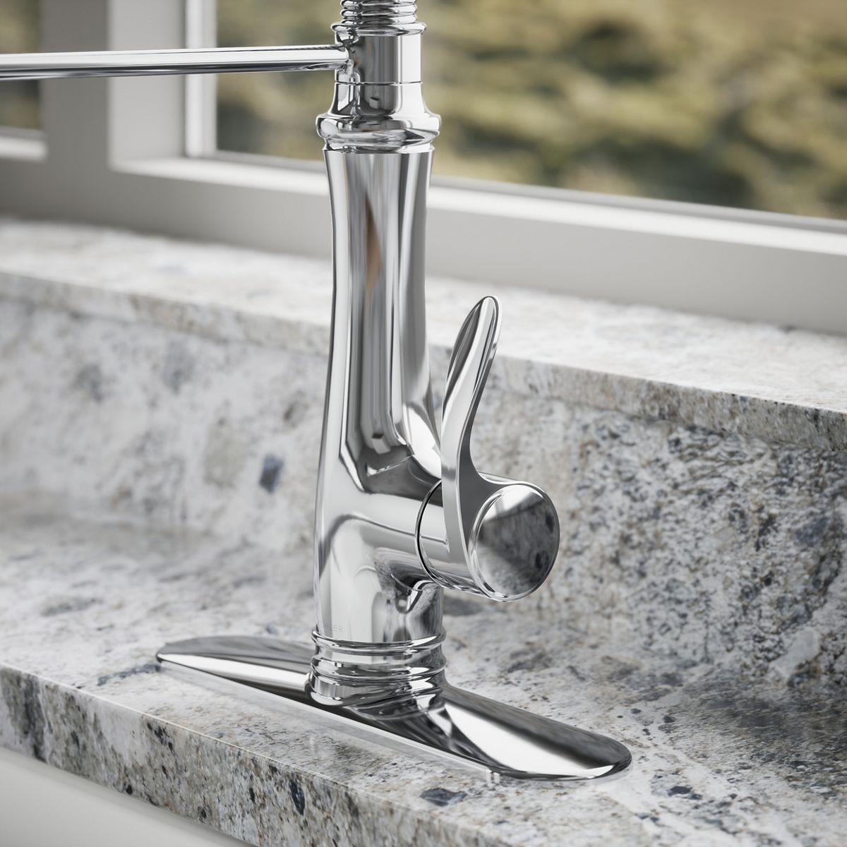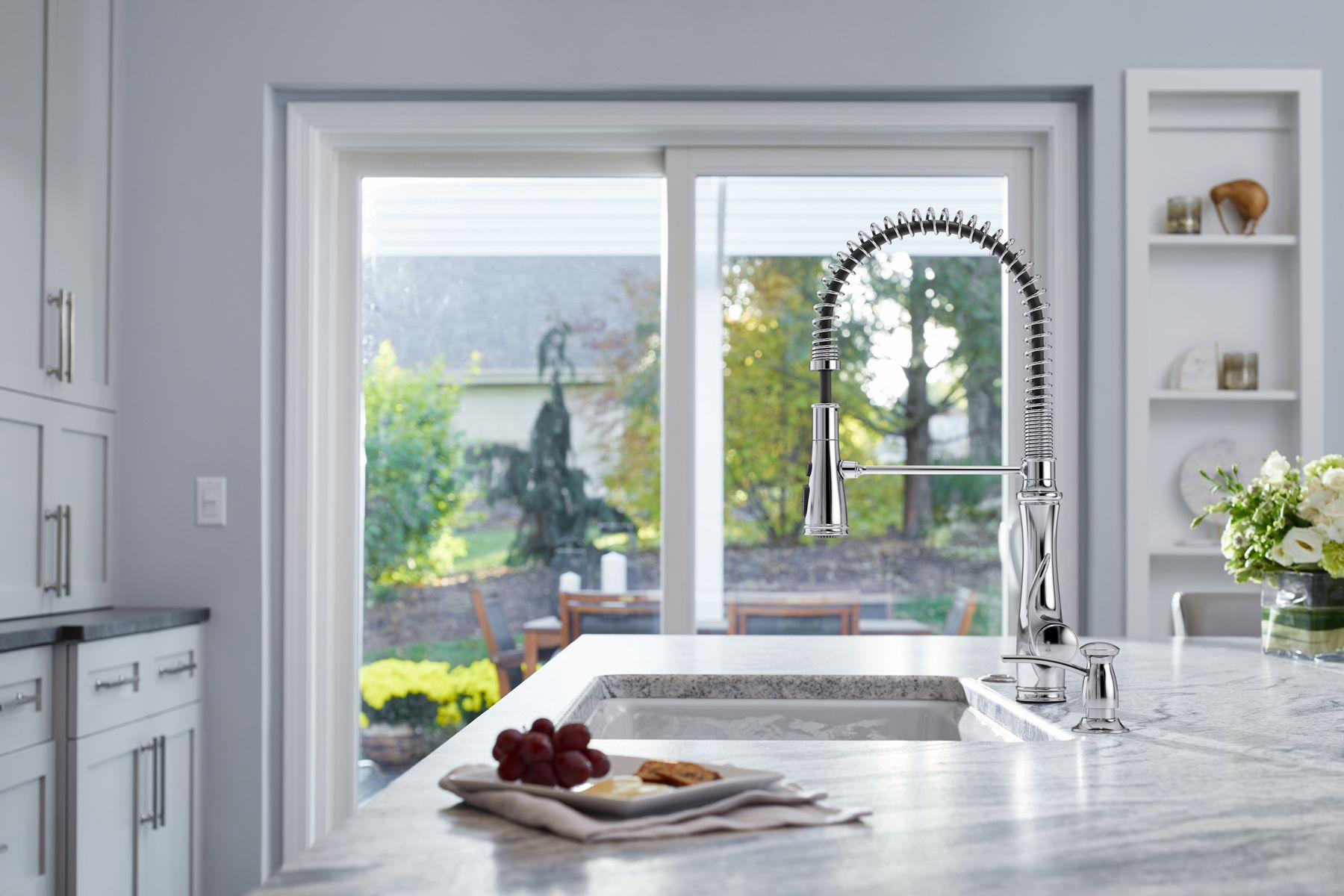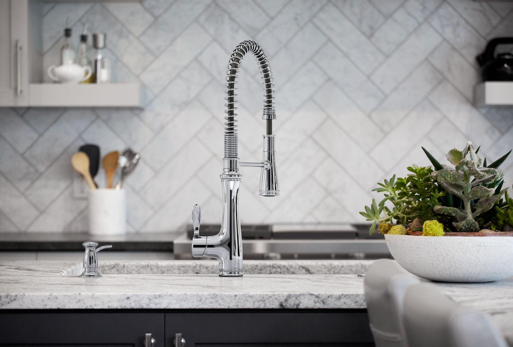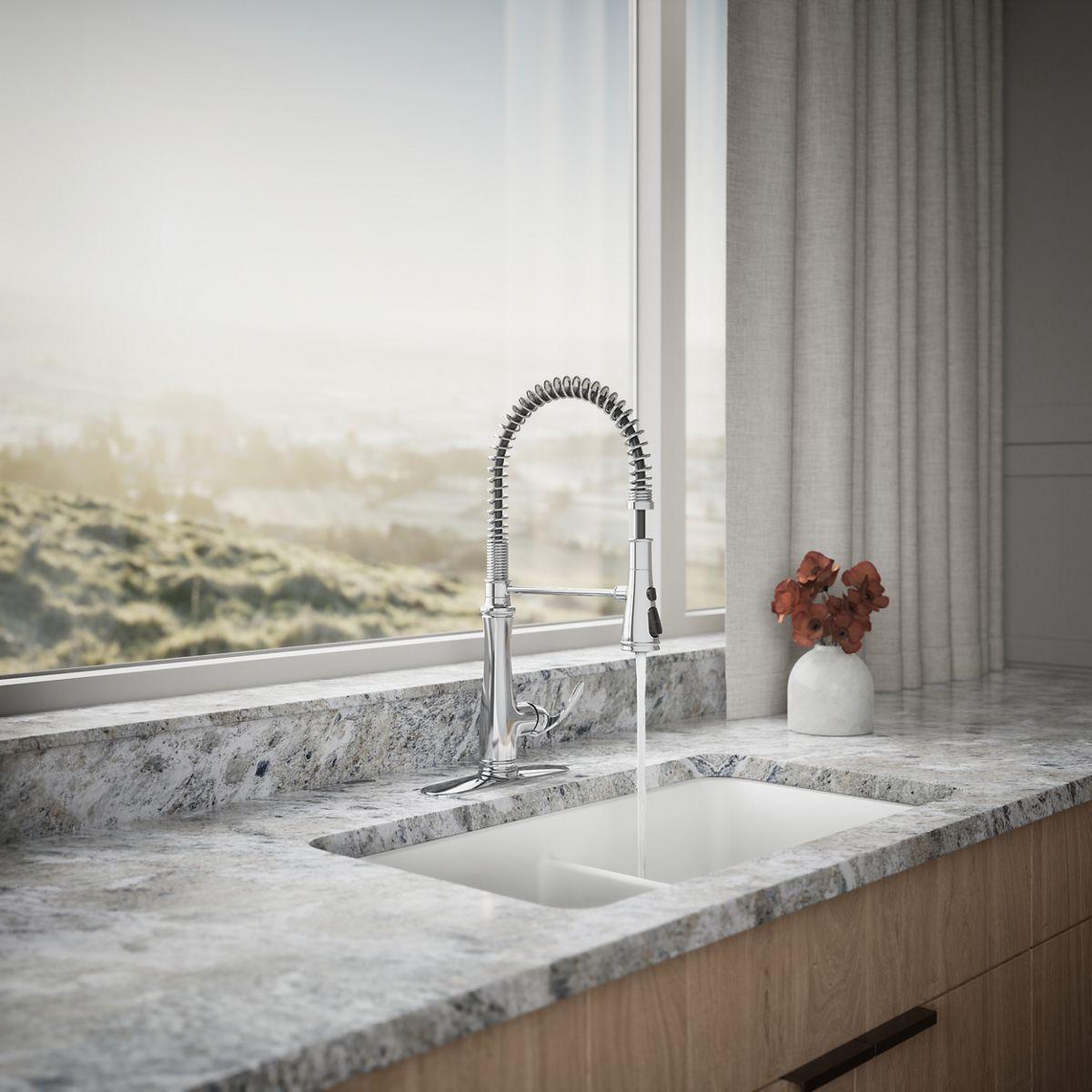 Distinguished by an elegant silhouette, this Bellera faucet brings professional-level style and performance into home kitchens. The high-arch spout with an industrial-inspired spring coil design swivels 360 degrees for a complete field of reach. A three-function sprayhead with touch control pulls down into the sink for powerful cleaning with Sweep spray, or out of the sink to fill pots and pitchers quickly with Boost function.