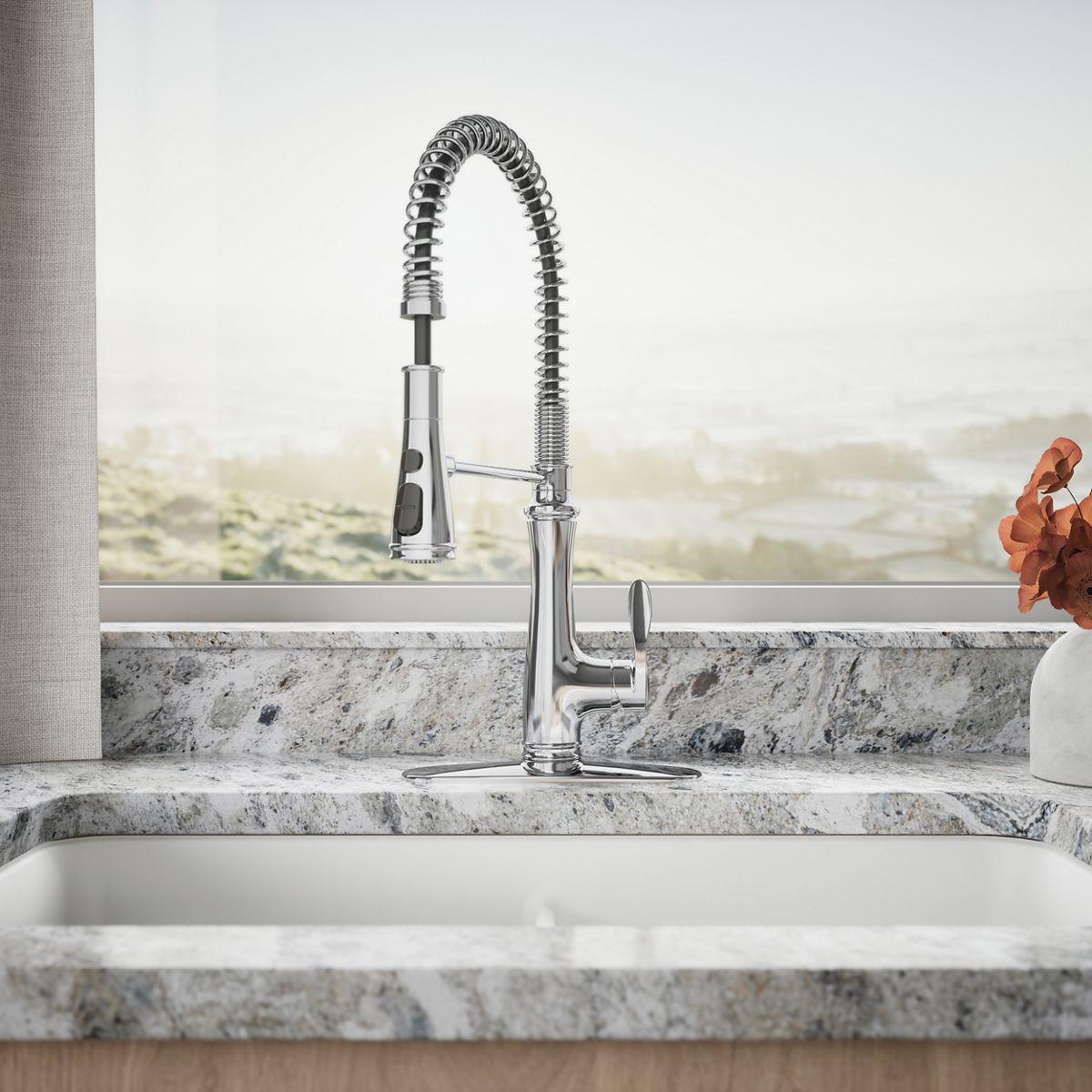 - Professional-style faucet with an easy-to-clean coated hose and removable coil.