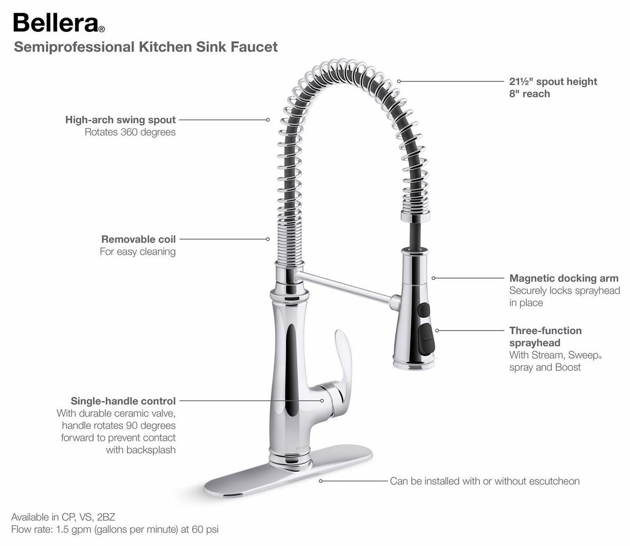 Distinguished by an elegant silhouette, this Bellera faucet brings professional-level style and performance into home kitchens. The high-arch spout with an industrial-inspired spring coil design swivels 360 degrees for a complete field of reach. A three-function sprayhead with touch control pulls down into the sink for powerful cleaning with Sweep® spray, or out of the sink to fill pots and pitchers quickly with Boost function.