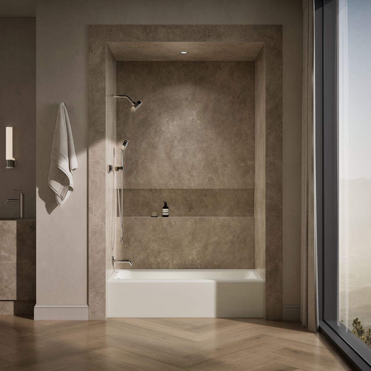 An update of a bestseller, Bellwether features a clean, contemporary design in a popular, industry-standard size. Its integral apron simplifies alcove installation, while a low step-over threshold allows for comfortable entry and exit. Bellwether's wide ledges provide storage space for towels, toiletries, and other items. Crafted from enameled cast iron, this bath offers years of reliable performance. Safeguard slip-resistant surface enhances safety.