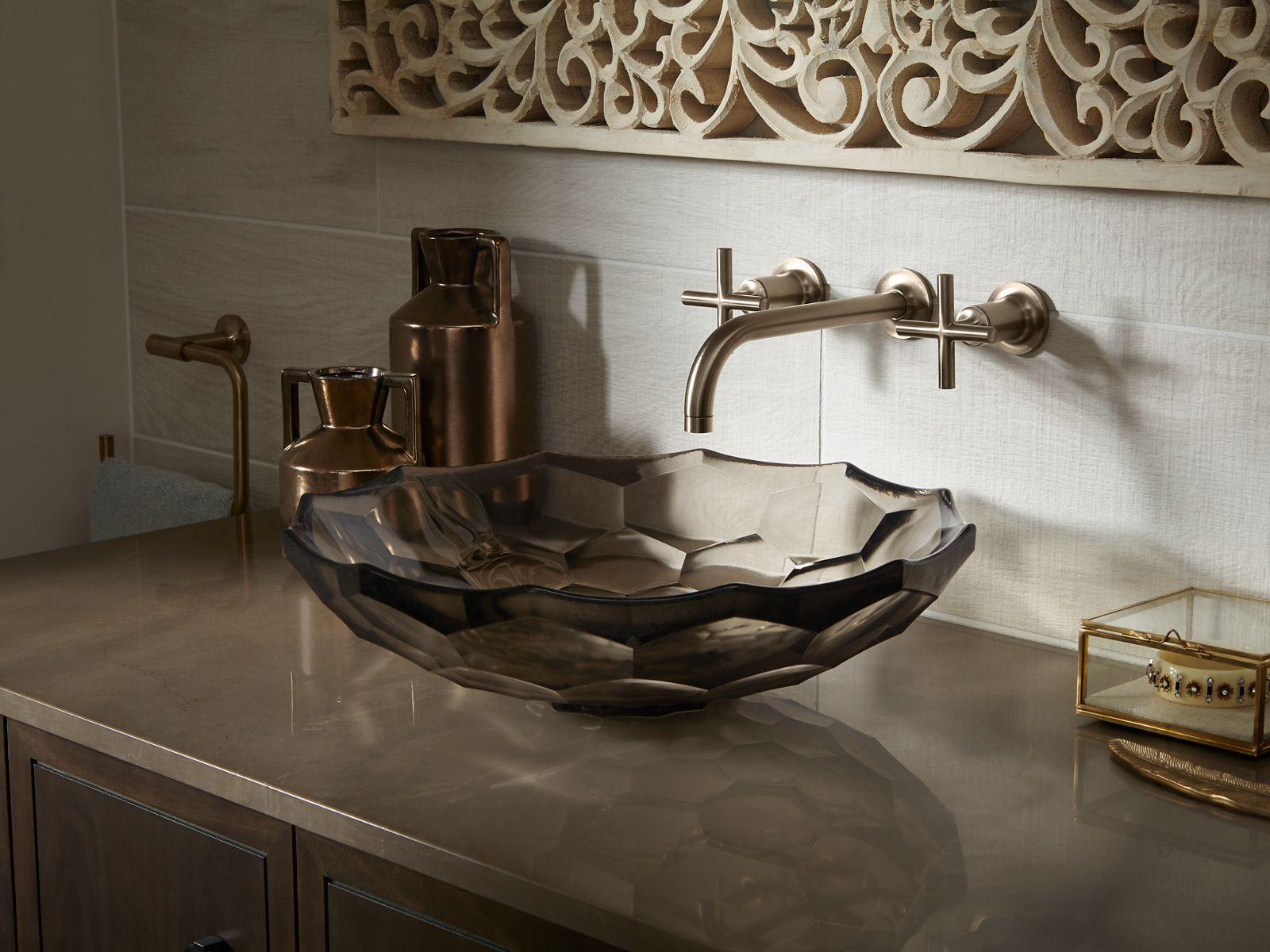 The Briolette glass sink displays a uniquely faceted shape inspired by the precisely cut surfaces of precious stone. Gently curved walls highlight the natural textural qualities of glass and create a striking reflective effect. This sink sits on top of the counter as a brilliant addition to your bath or powder room.