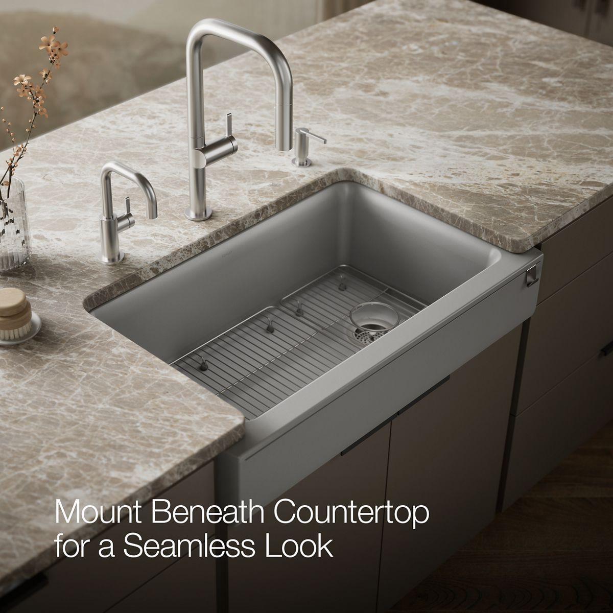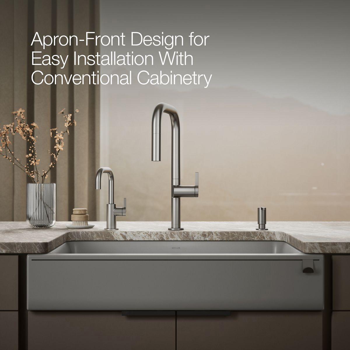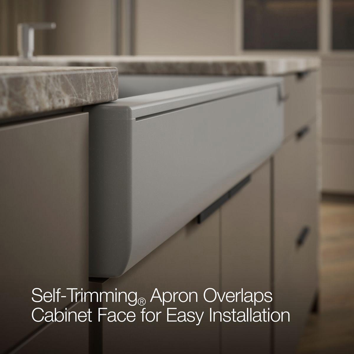 With soft French curves, the Cairn kitchen sink offers transitional style to suit contemporary and traditional kitchens alike. Cairn is made of KOHLER Neoroc, a matte-finish composite material designed for extreme durability and unmatched beauty. Richly colored to complement any countertop, Neoroc resists scratches, stains, and fading, and is highly heat- and impact-resistant. The Self-Trimming apron design makes it easy to retrofit existing 36 cabinetry that has a false drawer front, requiring only a simple rough cut.