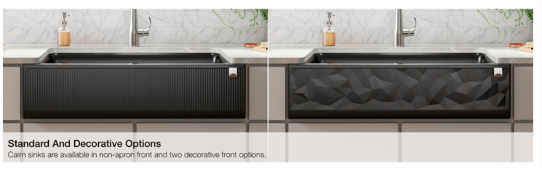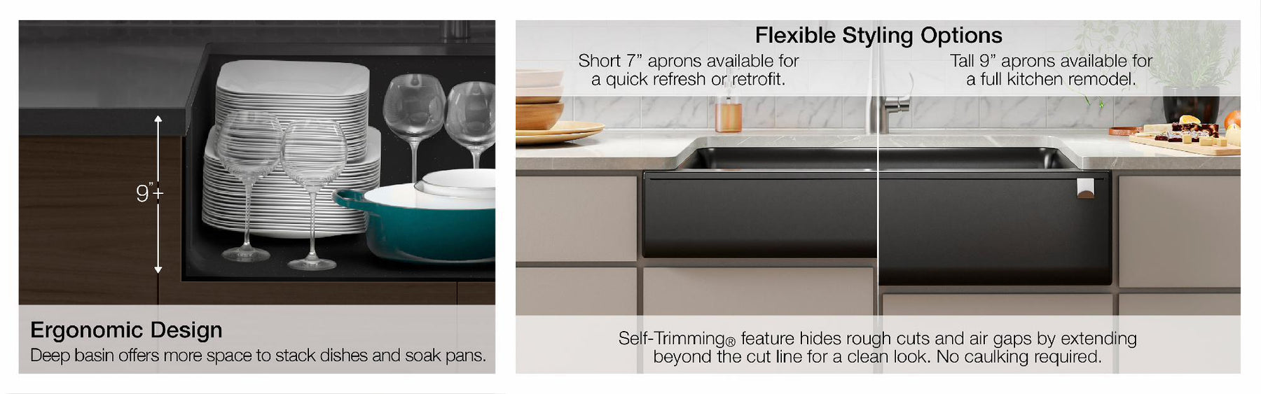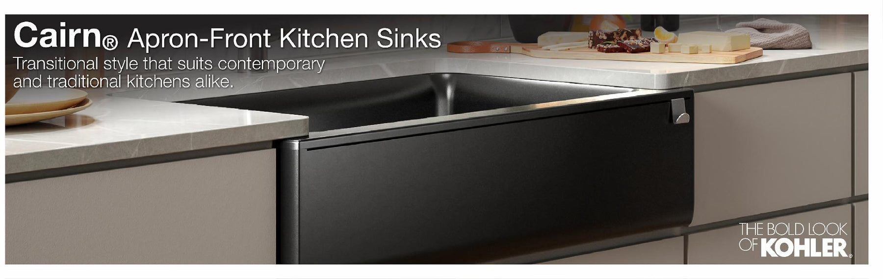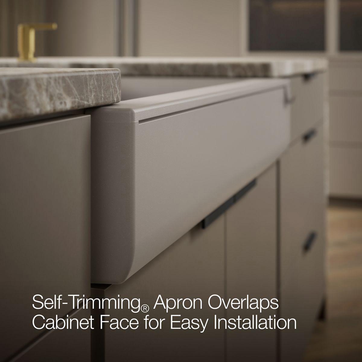 With soft French curves, the Cairn kitchen sink offers transitional style to suit contemporary and traditional kitchens alike. Cairn is made of KOHLER Neoroc, a matte-finish composite material designed for extreme durability and unmatched beauty. Richly colored to complement any countertop, Neoroc resists scratches, stains, and fading, and is highly heat- and impact-resistant. The Self-Trimming apron design makes it easy to retrofit existing 36 cabinetry that has a false drawer front, requiring only a simple rough cut.