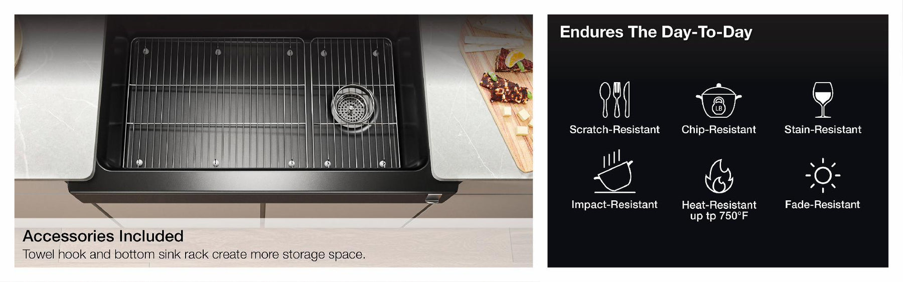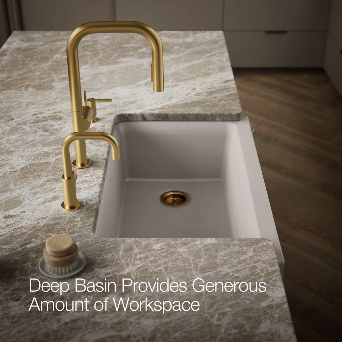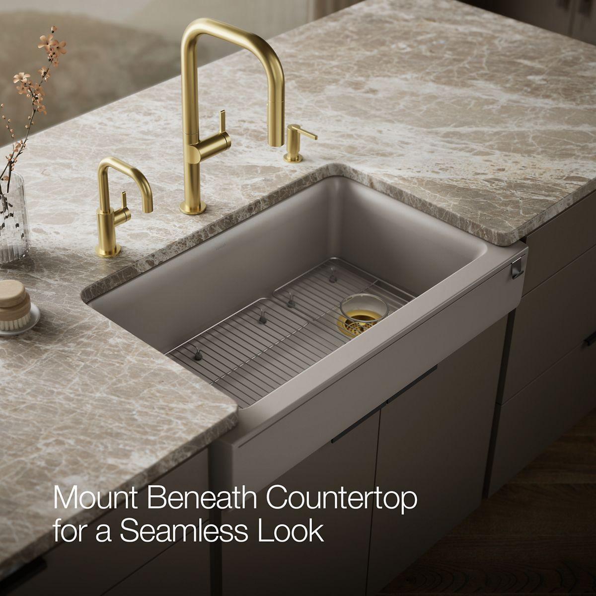 With soft French curves, the Cairn kitchen sink offers transitional style to suit contemporary and traditional kitchens alike. Cairn is made of KOHLER Neoroc, a matte-finish composite material designed for extreme durability and unmatched beauty. Richly colored to complement any countertop, Neoroc resists scratches, stains, and fading, and is highly heat- and impact-resistant. The Self-Trimming apron design makes it easy to retrofit existing 36 cabinetry that has a false drawer front, requiring only a simple rough cut.