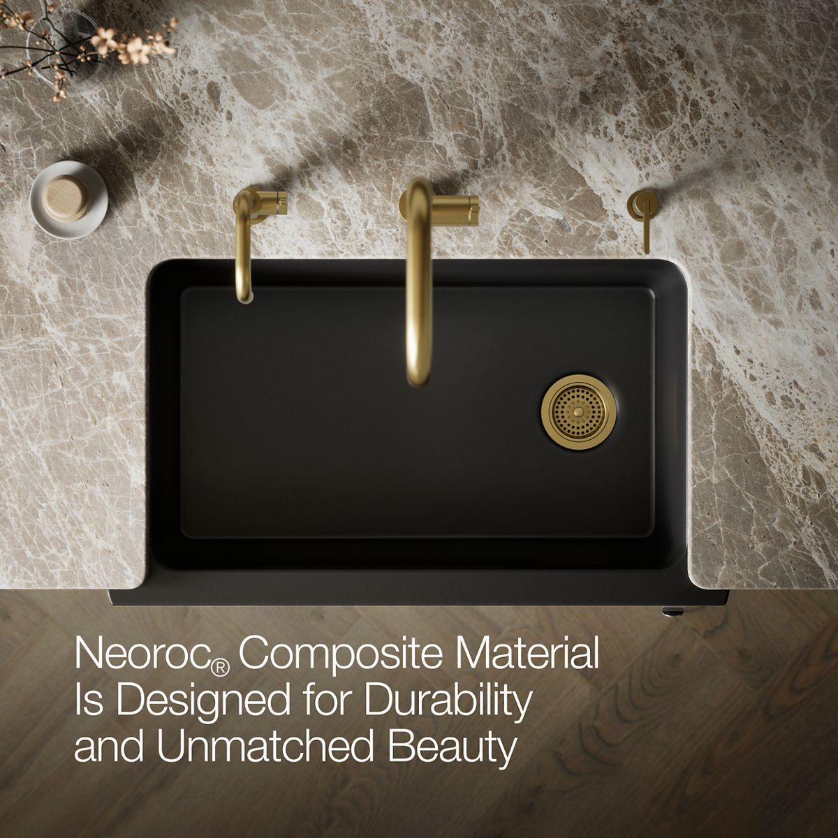 With soft French curves, the Cairn kitchen sink offers transitional style to suit contemporary and traditional kitchens alike. Cairn is made of KOHLER Neoroc®, a matte-finish composite material designed for extreme durability and unmatched beauty. Richly colored to complement any countertop, Neoroc resists scratches, stains, and fading, and is highly heat- and impact-resistant. A standard tall apron-front makes it easy to install on 36-inch apron-front cabinetry. The Self-Trimming® design requires only a simple rough cut, overlapping the cabinet face for beautiful results.