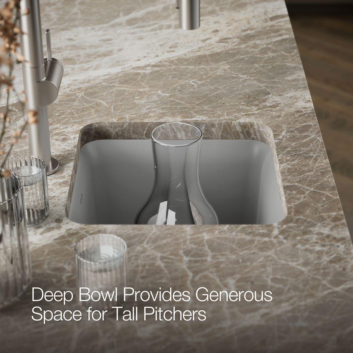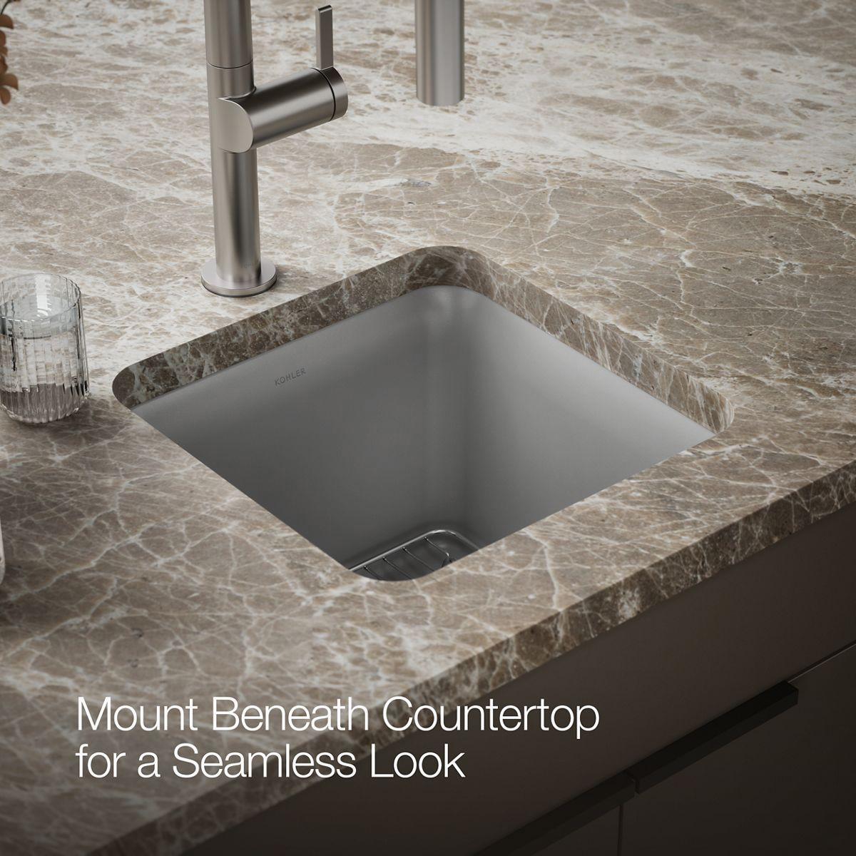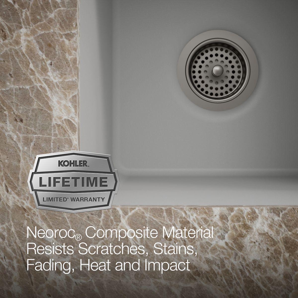 With soft French curves, the Cairn sink offers transitional style to suit contemporary and traditional kitchens alike. The Cairn bar sink is made of KOHLER Neoroc®, a matte-finish composite material designed for extreme durability and unmatched beauty. Richly colored to complement any countertop, Neoroc resists scratches, stains, and fading and is highly heat- and impact-resistant. This bar sink includes a bottom sink rack to keep the surface looking new.
