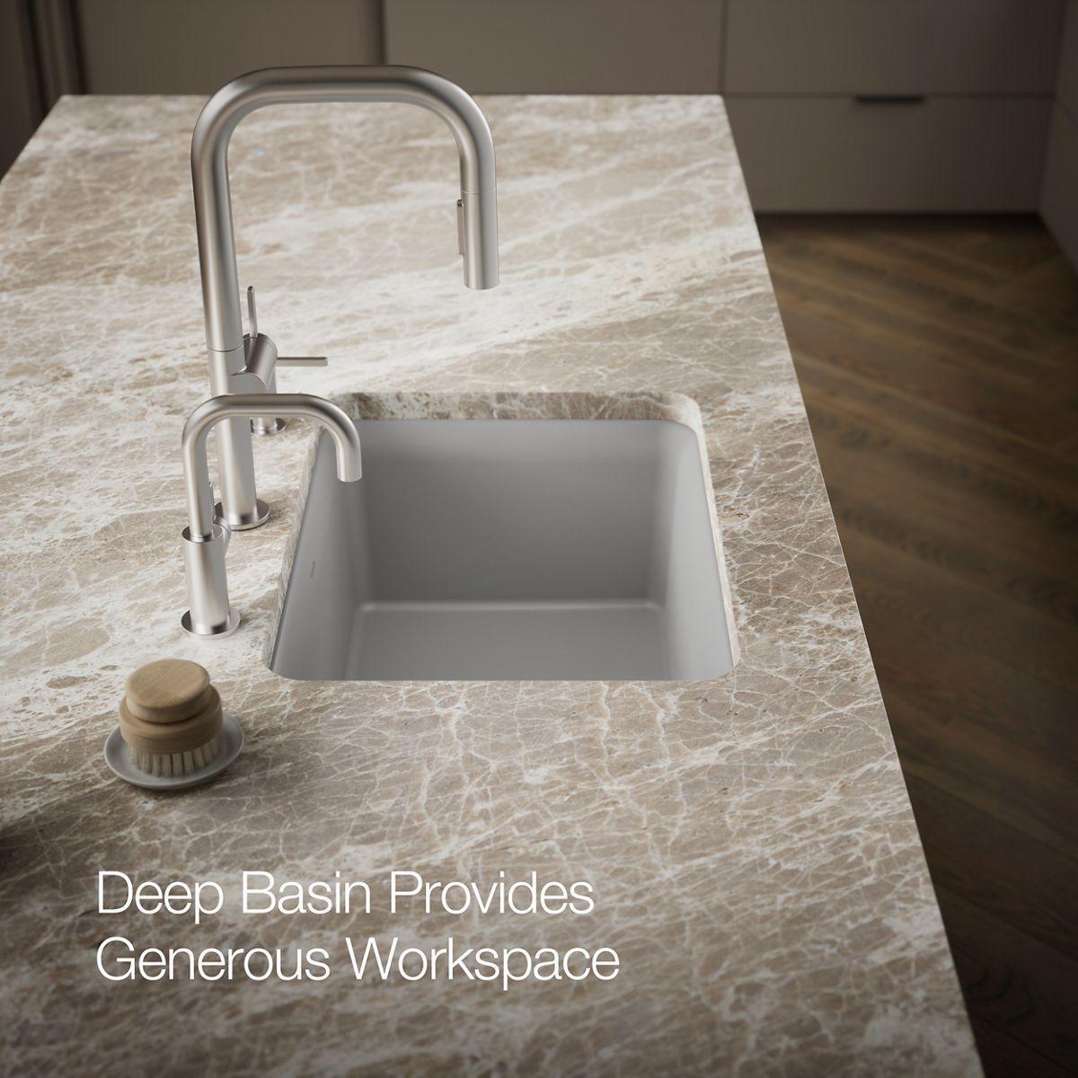 With soft French curves, the Cairn sink offers transitional style to suit contemporary and traditional kitchens alike. The Cairn sink is made of KOHLER Neoroc®, a matte-finish composite material designed for extreme durability and unmatched beauty. Richly colored to complement any countertop, Neoroc resists scratches, stains, and fading and is highly heat- and impact-resistant. This sink includes a bottom sink rack to keep the surface looking new.