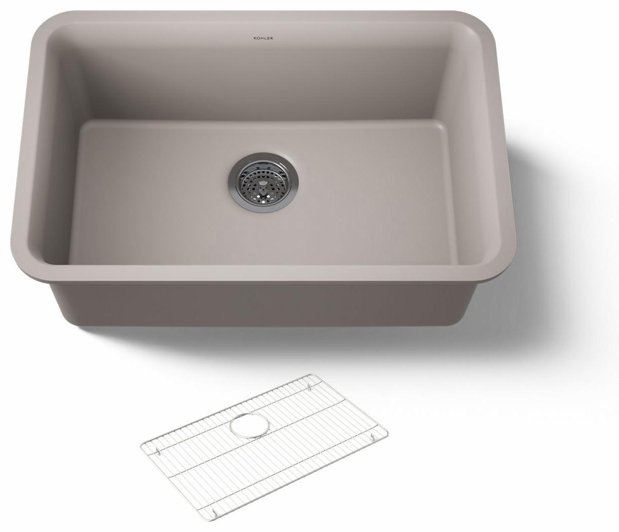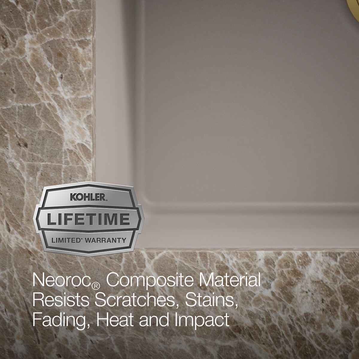 With soft French curves, the Cairn sink offers transitional style to suit contemporary and traditional kitchens alike. The Cairn sink is made of KOHLER Neoroc®, a matte-finish composite material designed for extreme durability and unmatched beauty. Richly colored to complement any countertop, Neoroc resists scratches, stains, and fading and is highly heat- and impact-resistant. This sink includes a bottom sink rack to keep the surface looking new.