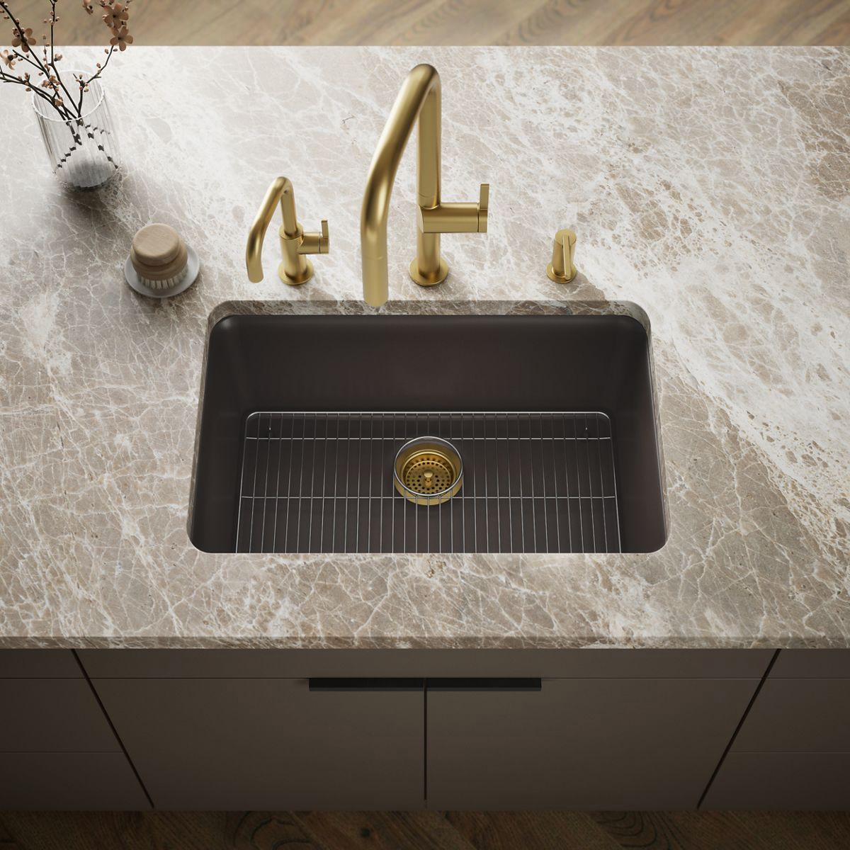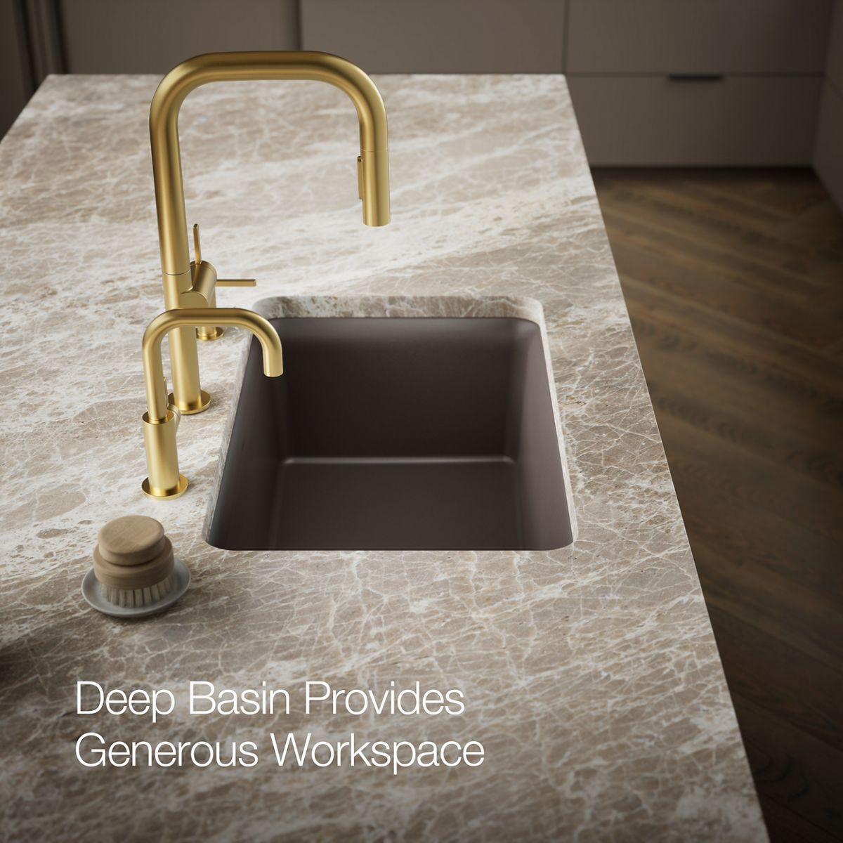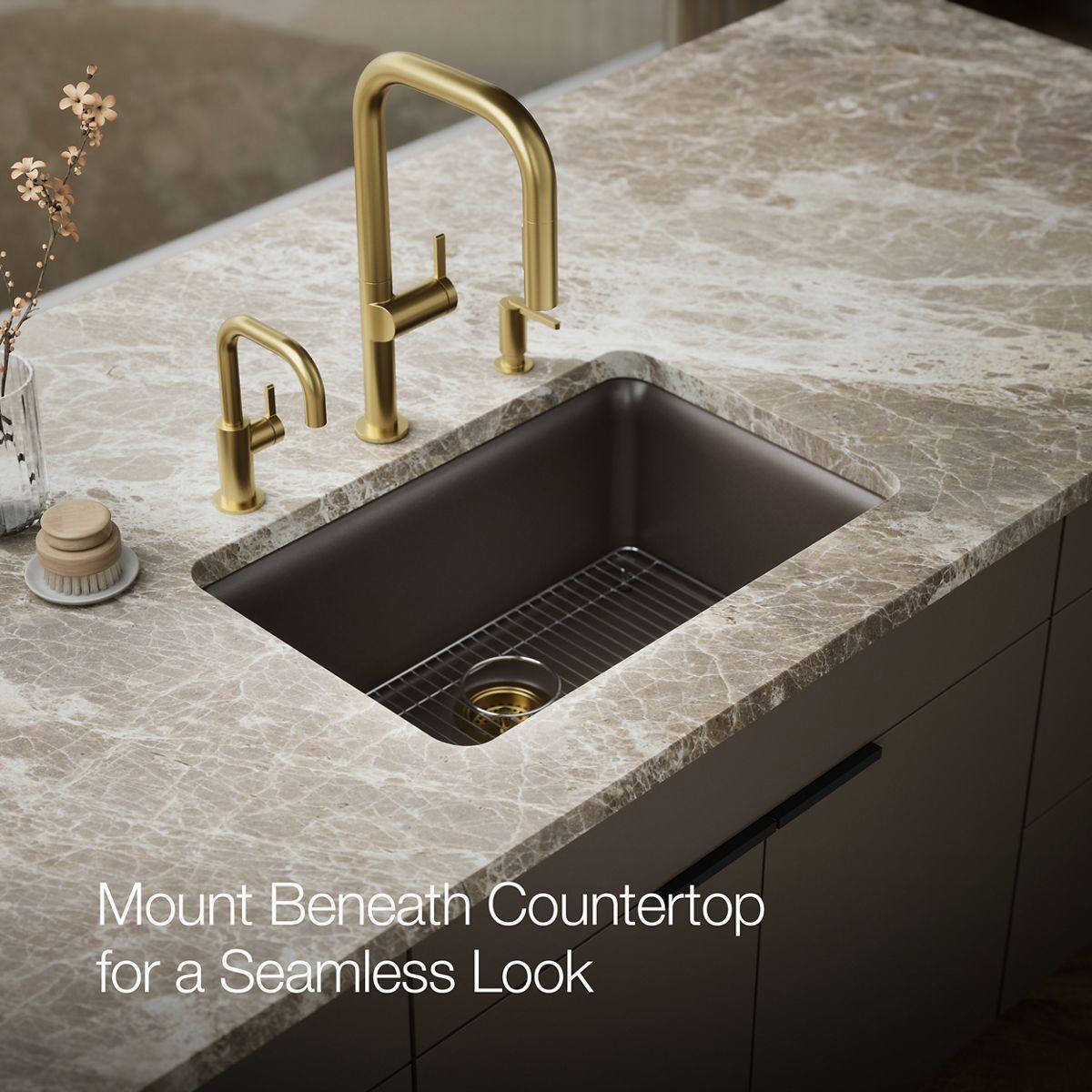 With soft French curves, the Cairn sink offers transitional style to suit contemporary and traditional kitchens alike. The Cairn sink is made of KOHLER Neoroc, a matte-finish composite material designed for extreme durability and unmatched beauty. Richly colored to complement any countertop, Neoroc resists scratches, stains, and fading and is highly heat- and impact-resistant. This sink includes a bottom sink rack to keep the surface looking new.