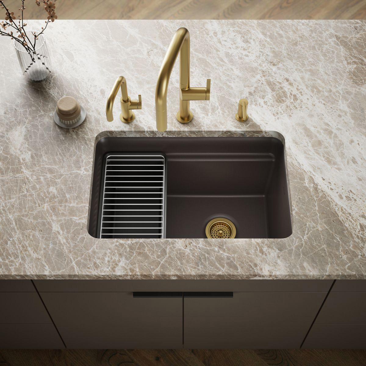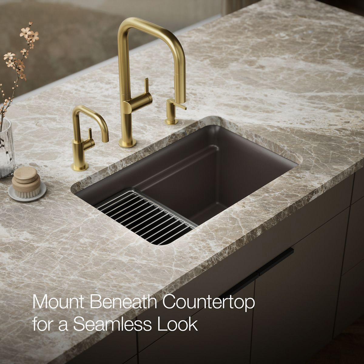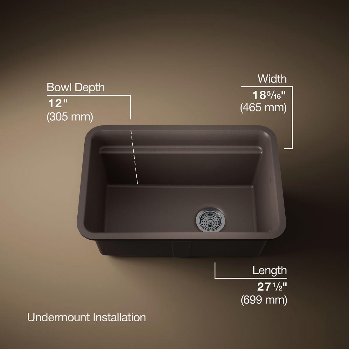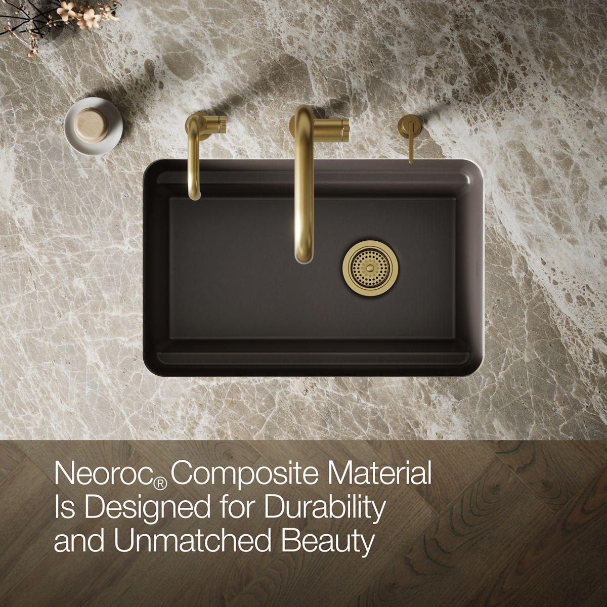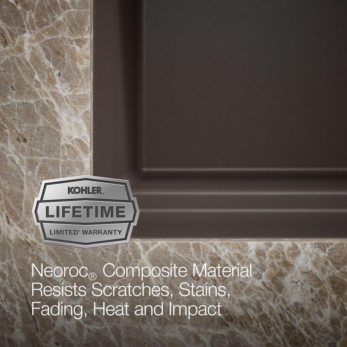 With soft curves, the Cairn undermount utility sink offers transitional style to suit the kitchen and laundry room alike. This Cairn sink is made of KOHLER Neoroc, a matte-finish composite material designed for extreme durability and unmatched beauty. Richly colored to complement any countertop, Neoroc resists scratches, stains, and fading and is highly heat- and impact-resistant. The Cairn utility sink offers an extra-deep bowl that gives you ample room for a variety of cleaning tasks. Included with the sink are a convenient deep wash bin and stainless steel utility rack that slide effortlessly within the sink to tailor your workstation for the task at hand.