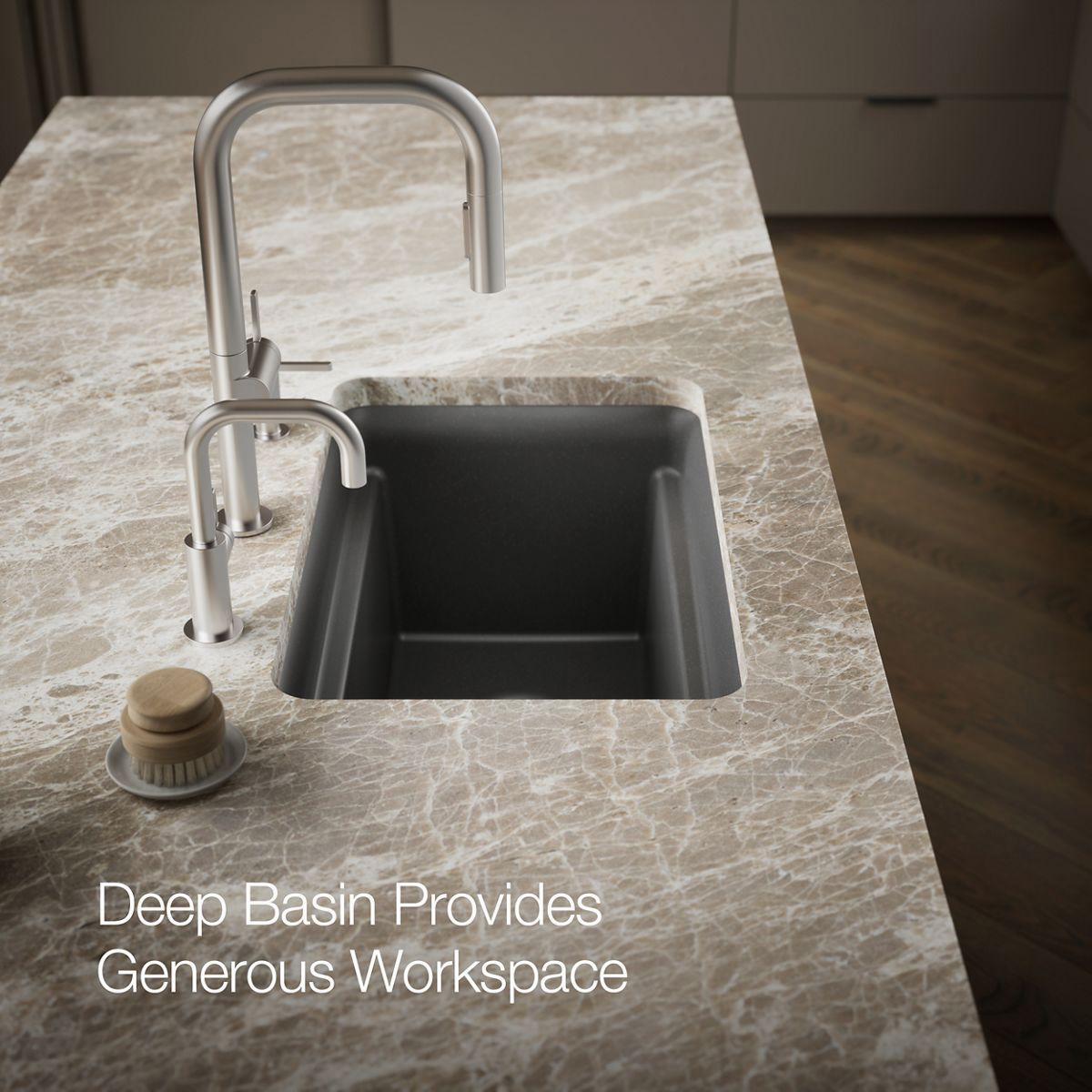 With soft curves, the Cairn undermount utility sink offers transitional style to suit the kitchen and laundry room alike. This Cairn sink is made of KOHLER Neoroc, a matte-finish composite material designed for extreme durability and unmatched beauty. Richly colored to complement any countertop, Neoroc resists scratches, stains, and fading and is highly heat- and impact-resistant. The Cairn utility sink offers an extra-deep bowl that gives you ample room for a variety of cleaning tasks. Included with the sink are a convenient deep wash bin and stainless steel utility rack that slide effortlessly within the sink to tailor your workstation for the task at hand.