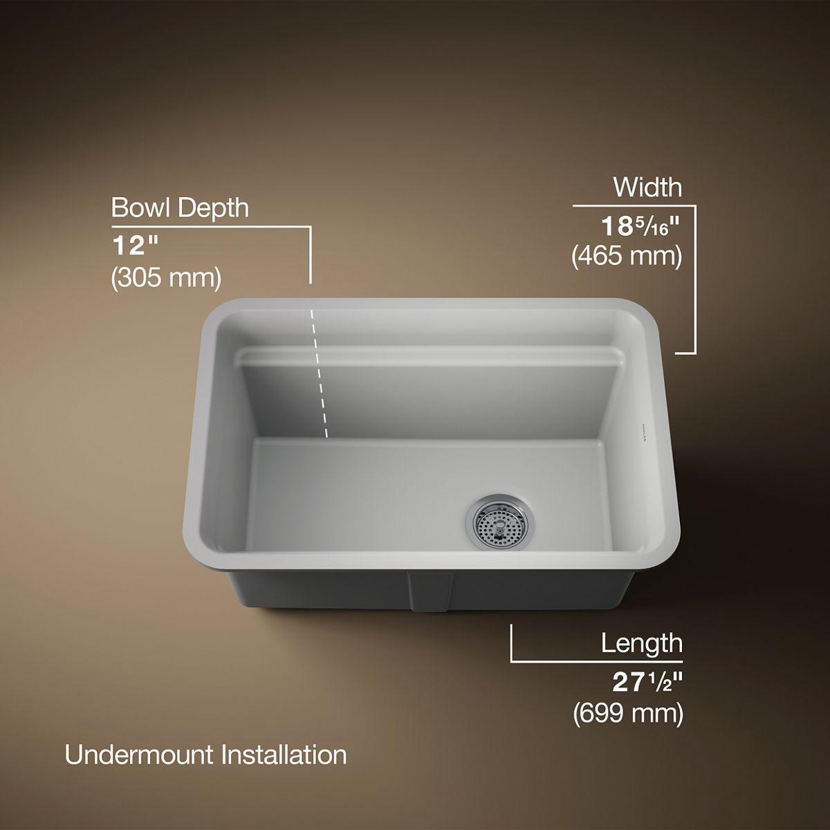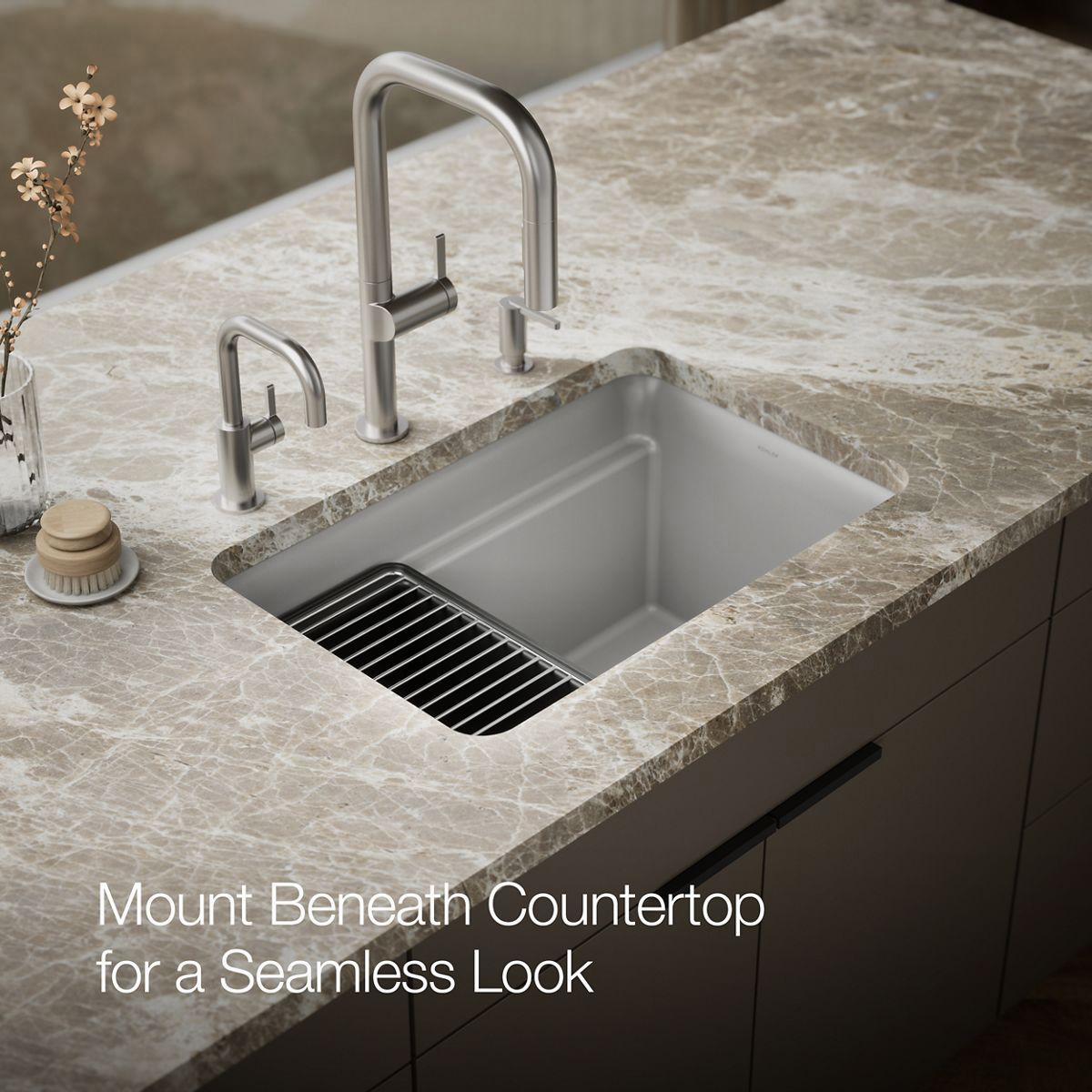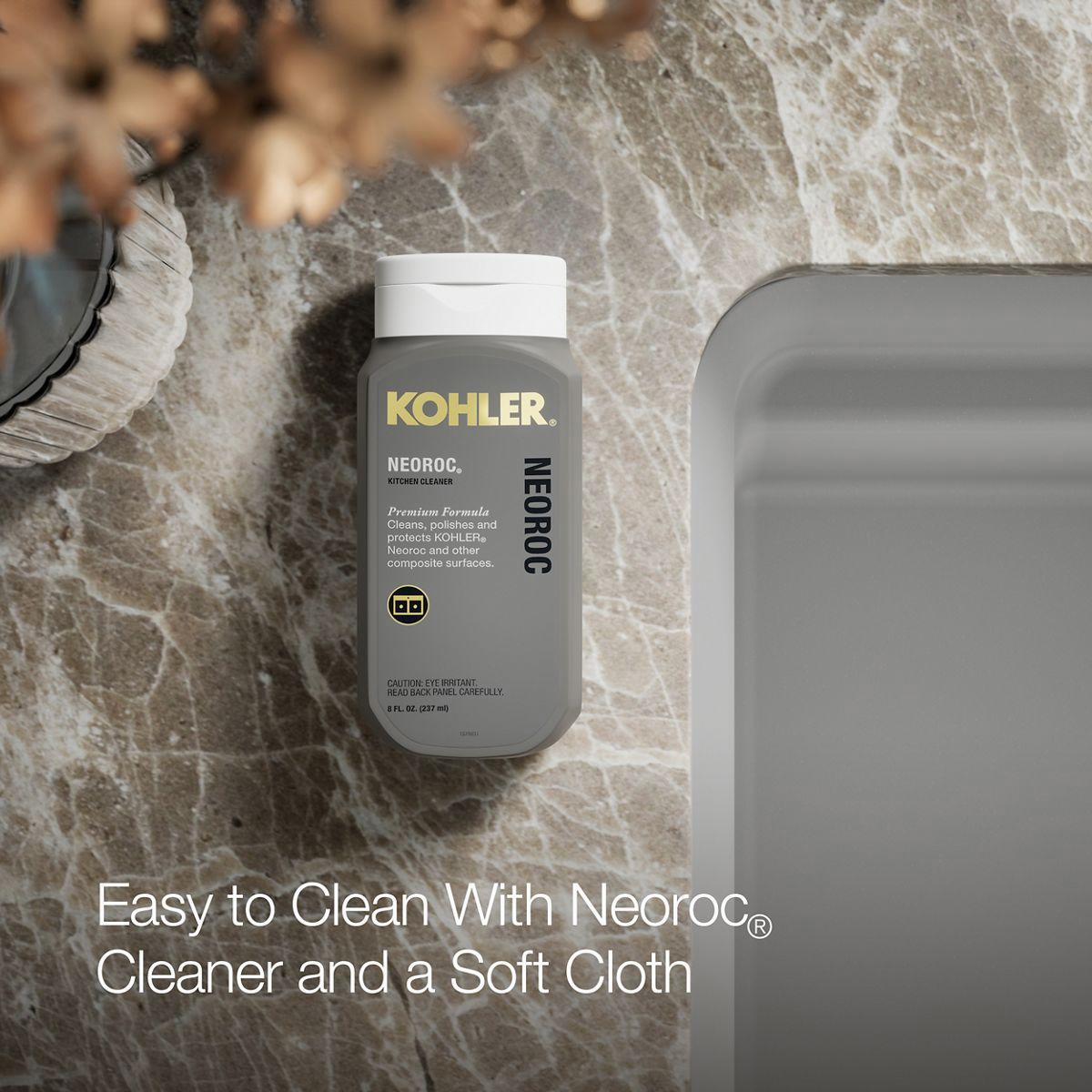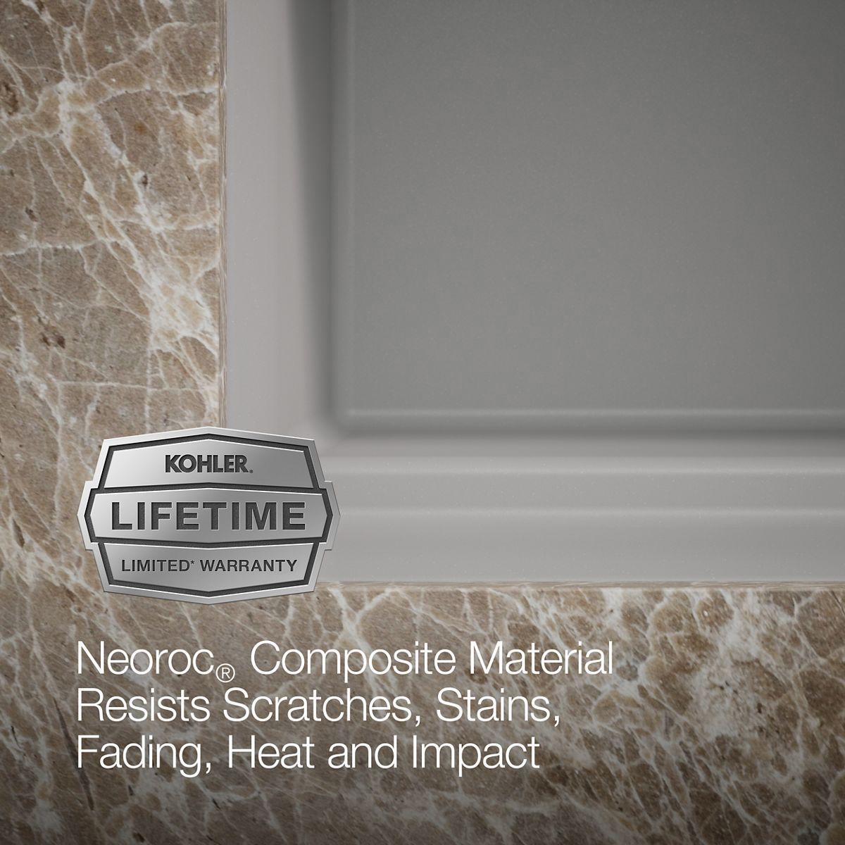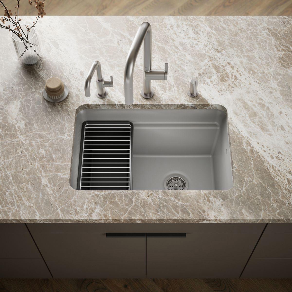 With soft curves, the Cairn undermount utility sink offers transitional style to suit the kitchen and laundry room alike. This Cairn sink is made of KOHLER Neoroc, a matte-finish composite material designed for extreme durability and unmatched beauty. Richly colored to complement any countertop, Neoroc resists scratches, stains, and fading and is highly heat- and impact-resistant. The Cairn utility sink offers an extra-deep bowl that gives you ample room for a variety of cleaning tasks. Included with the sink are a convenient deep wash bin and stainless steel utility rack that slide effortlessly within the sink to tailor your workstation for the task at hand.