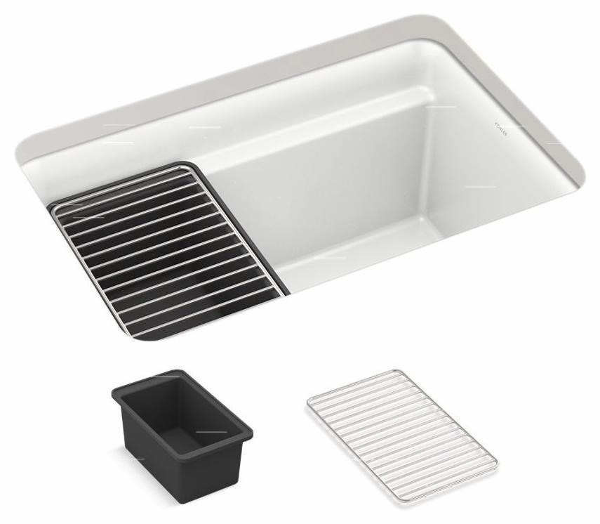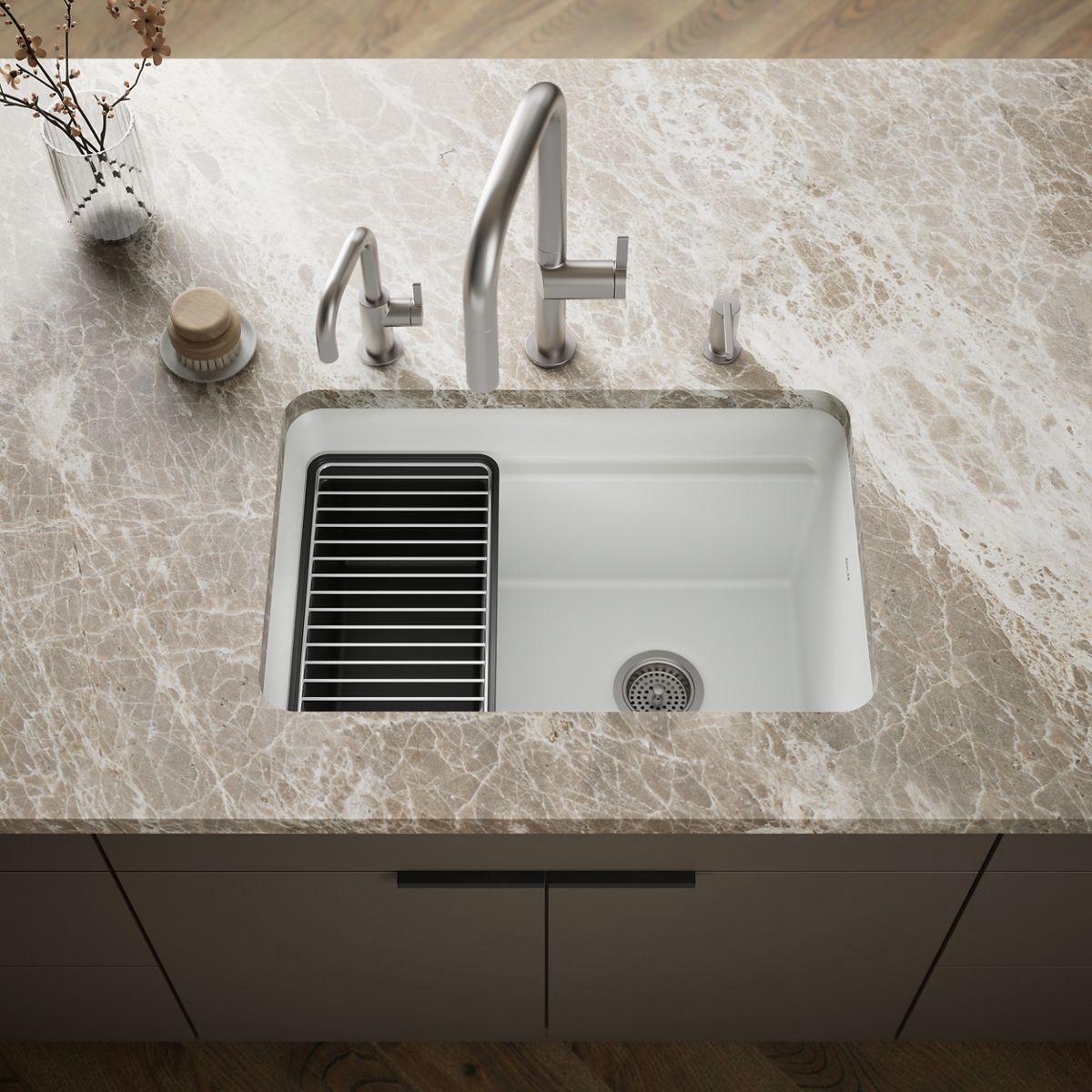 With soft curves, the Cairn undermount utility sink offers transitional style to suit the kitchen and laundry room alike. This Cairn sink is made of KOHLER Neoroc, a matte-finish composite material designed for extreme durability and unmatched beauty. Richly colored to complement any countertop, Neoroc resists scratches, stains, and fading and is highly heat- and impact-resistant. The Cairn utility sink offers an extra-deep bowl that gives you ample room for a variety of cleaning tasks. Included with the sink are a convenient deep wash bin and stainless steel utility rack that slide effortlessly within the sink to tailor your workstation for the task at hand.