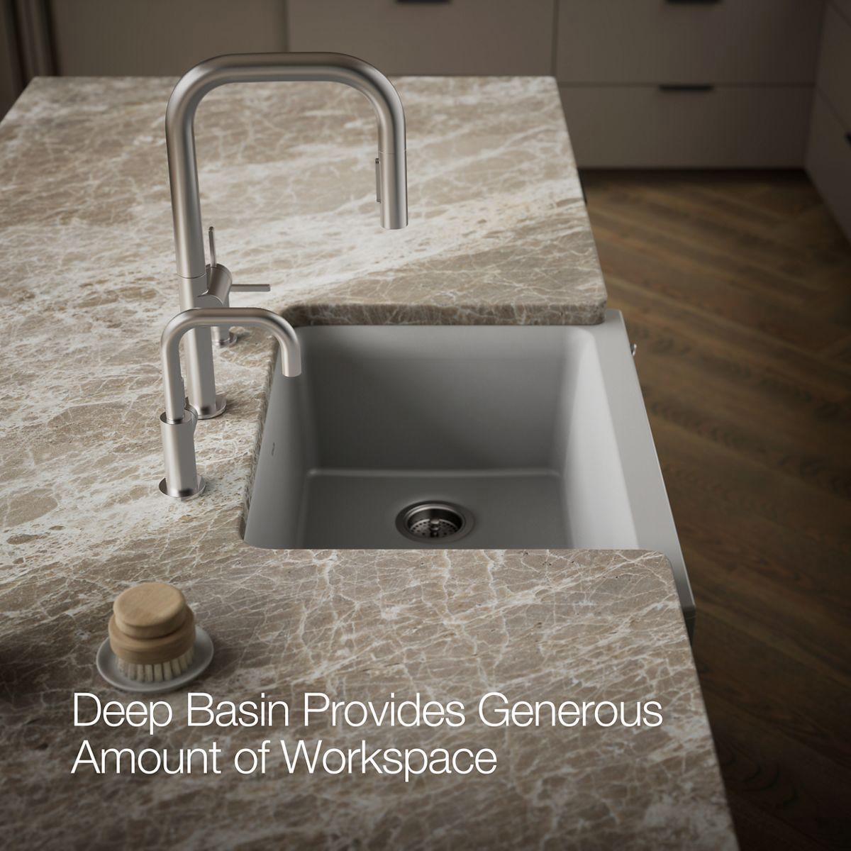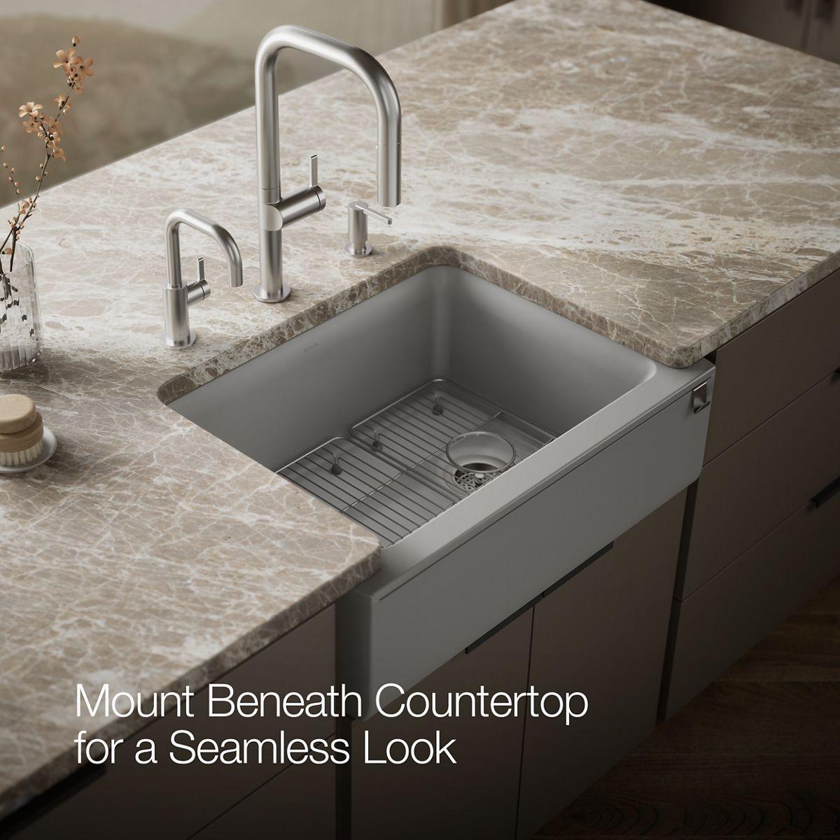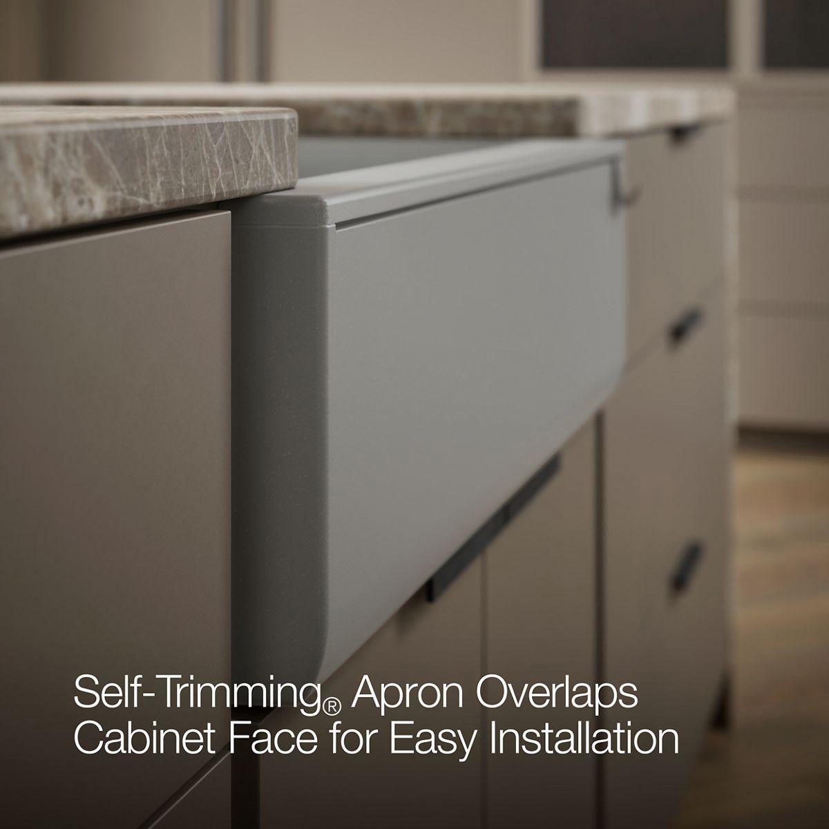 With soft French curves, the Cairn kitchen sink offers transitional style to suit contemporary and traditional kitchens alike. Cairn is made of KOHLER Neoroc, a matte-finish composite material designed for extreme durability and unmatched beauty. Richly colored to complement any countertop, Neoroc resists scratches, stains, and fading, and is highly heat- and impact-resistant. The Self-Trimming apron design requires only a simple rough cut, overlapping the cabinet face for beautiful results.