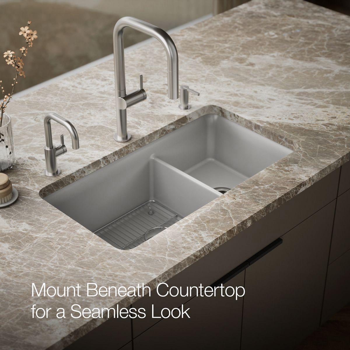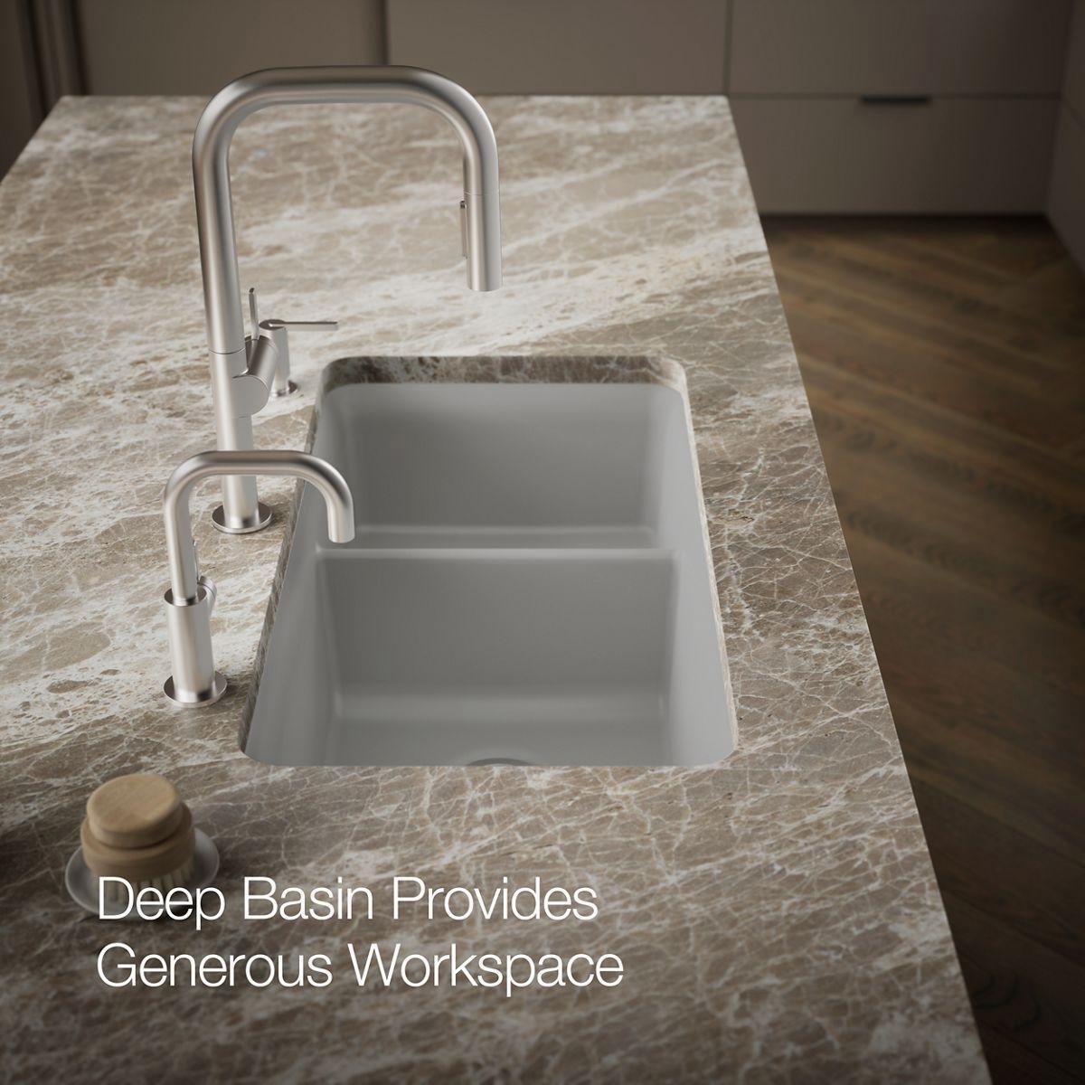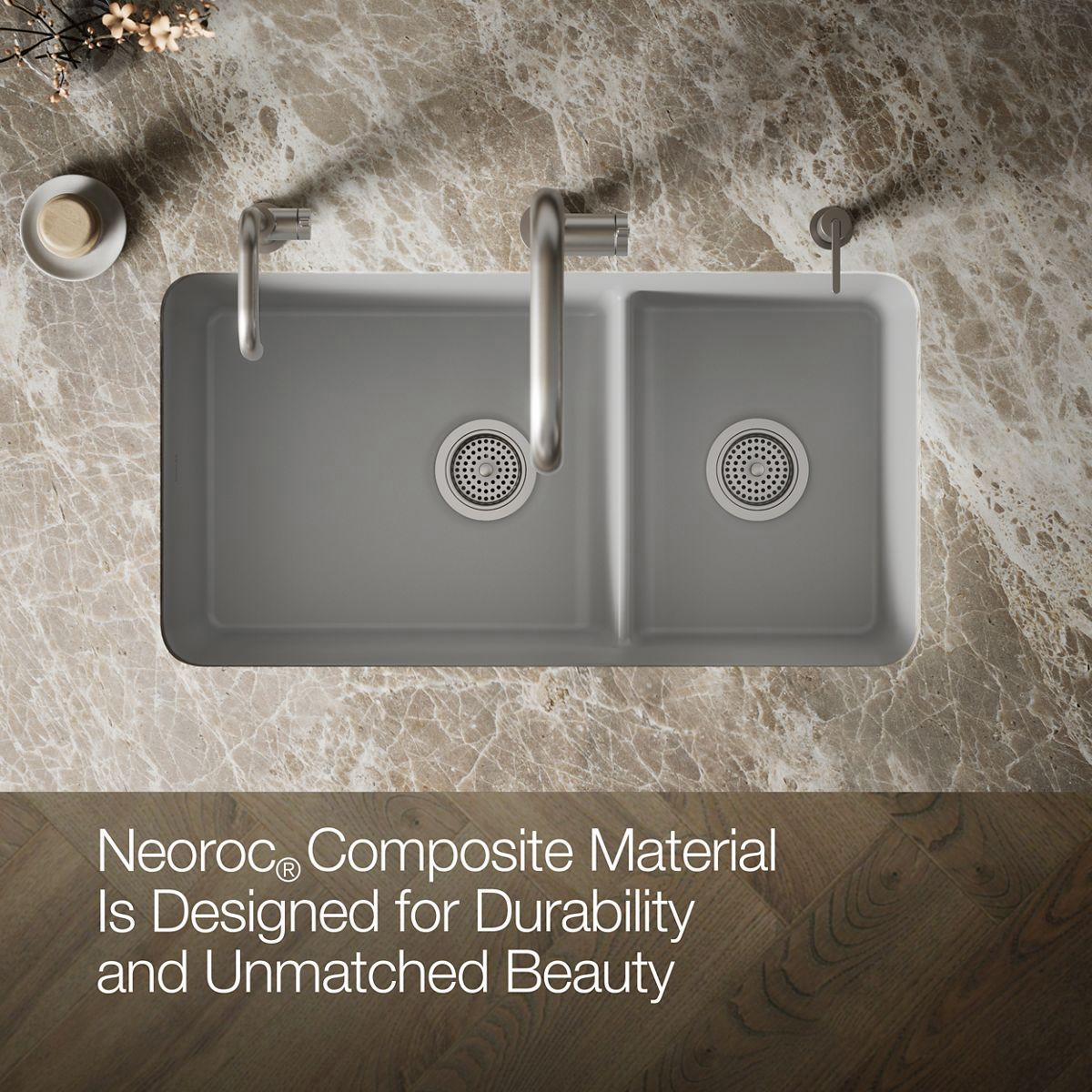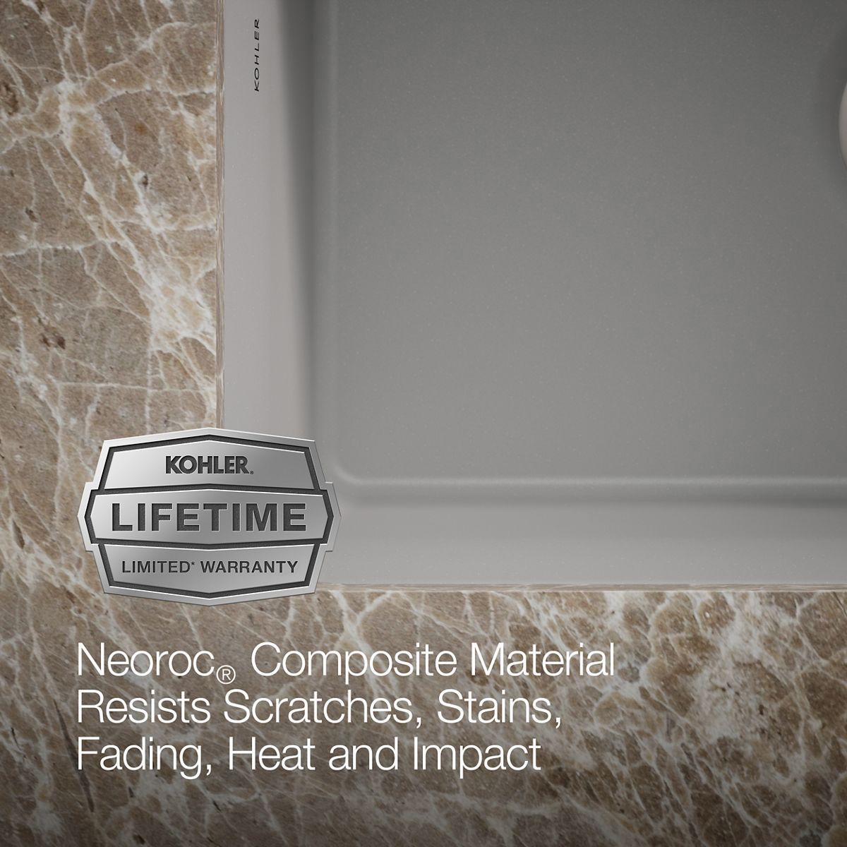 With soft French curves, the Cairn sink offers transitional style to suit contemporary and traditional kitchens alike. The Cairn sink is made of KOHLER Neoroc®, a matte-finish composite material designed for extreme durability and unmatched beauty. Richly colored to complement any countertop, Neoroc resists scratches, stains, and fading and is highly heat- and impact-resistant. This sink includes a rack for the large basin to keep the surface looking new.