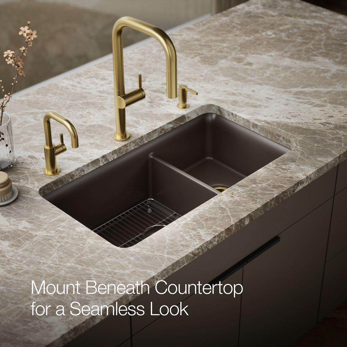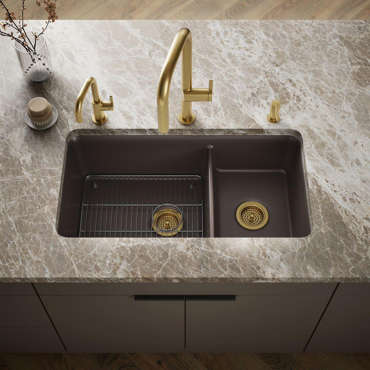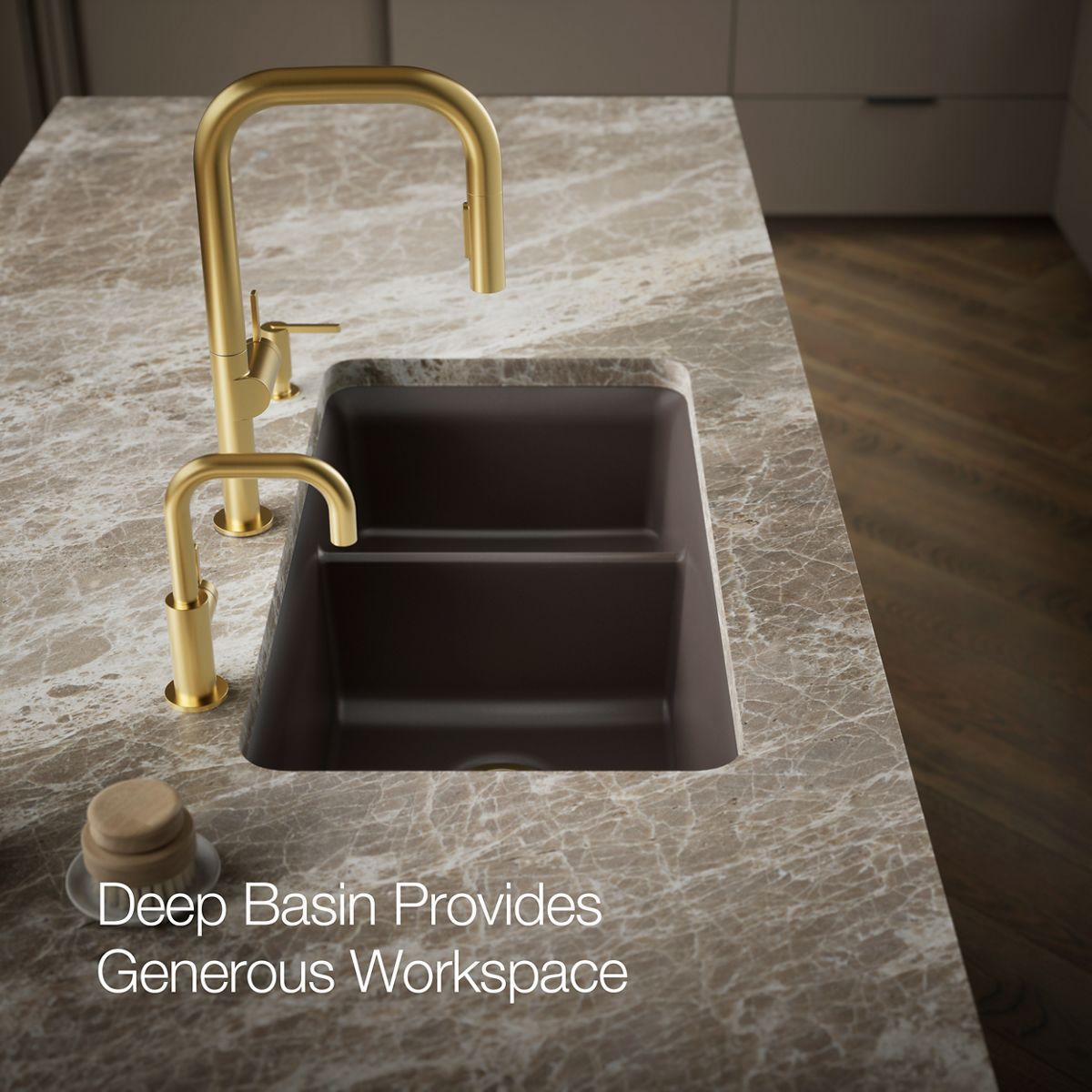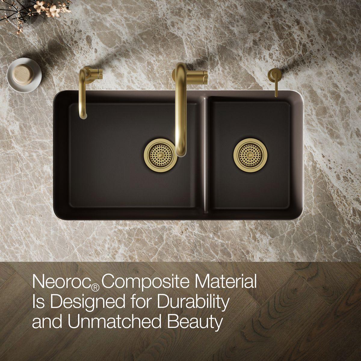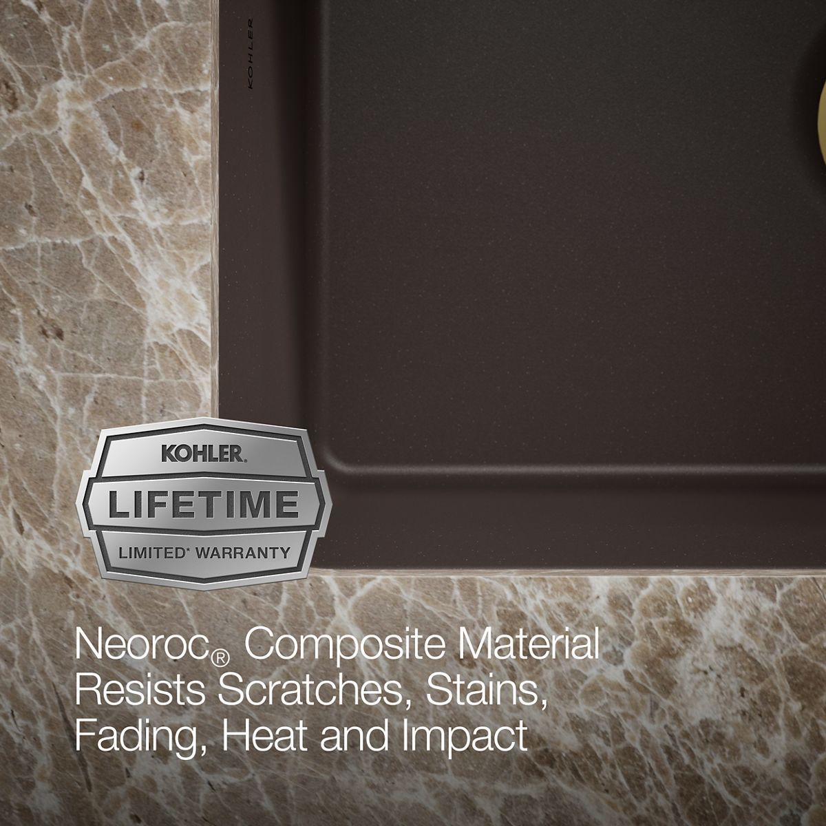 With soft French curves, the Cairn sink offers transitional style to suit contemporary and traditional kitchens alike. The Cairn sink is made of KOHLER Neoroc, a matte-finish composite material designed for extreme durability and unmatched beauty. Richly colored to complement any countertop, Neoroc resists scratches, stains, and fading and is highly heat- and impact-resistant. This sink includes a rack for the large basin to keep the surface looking new.