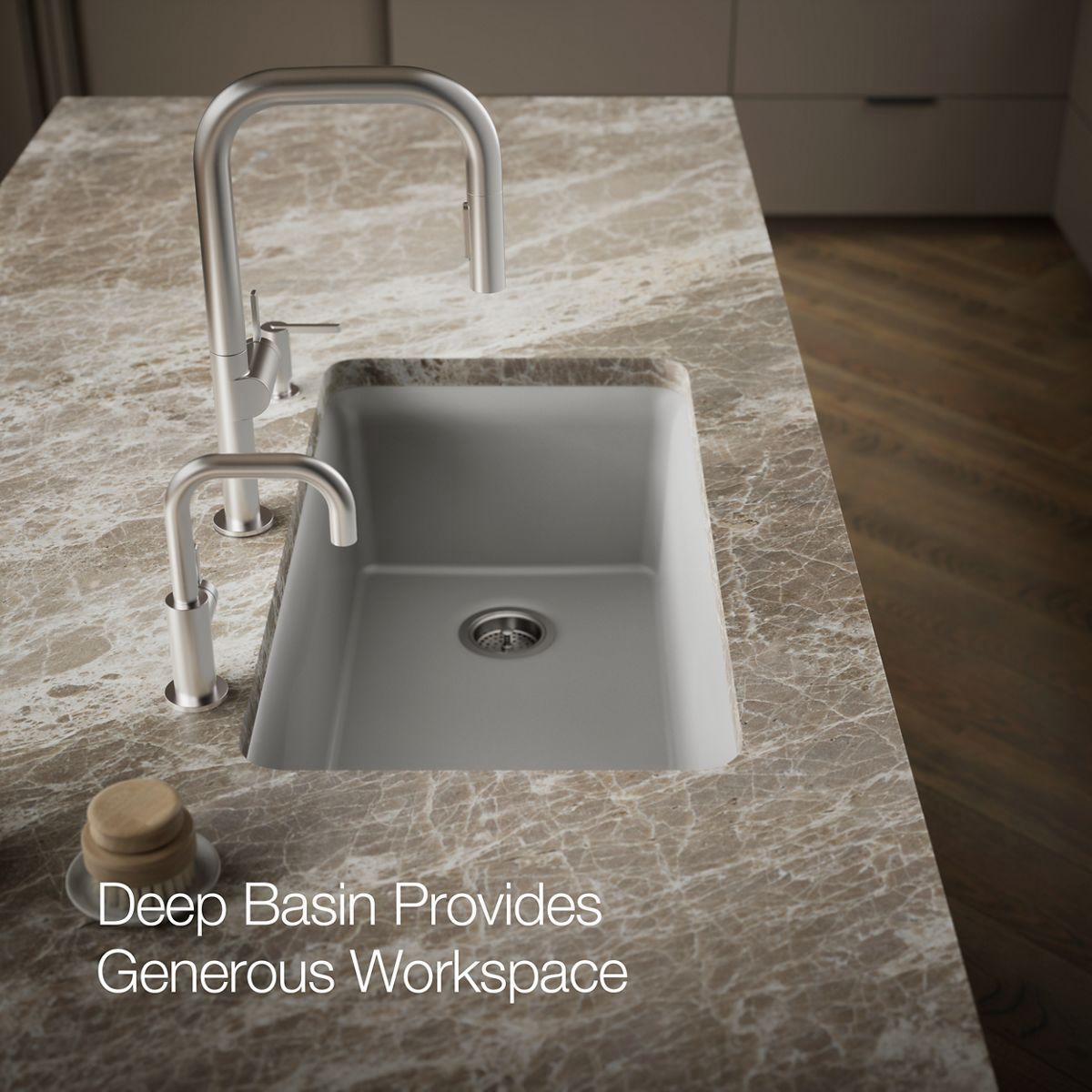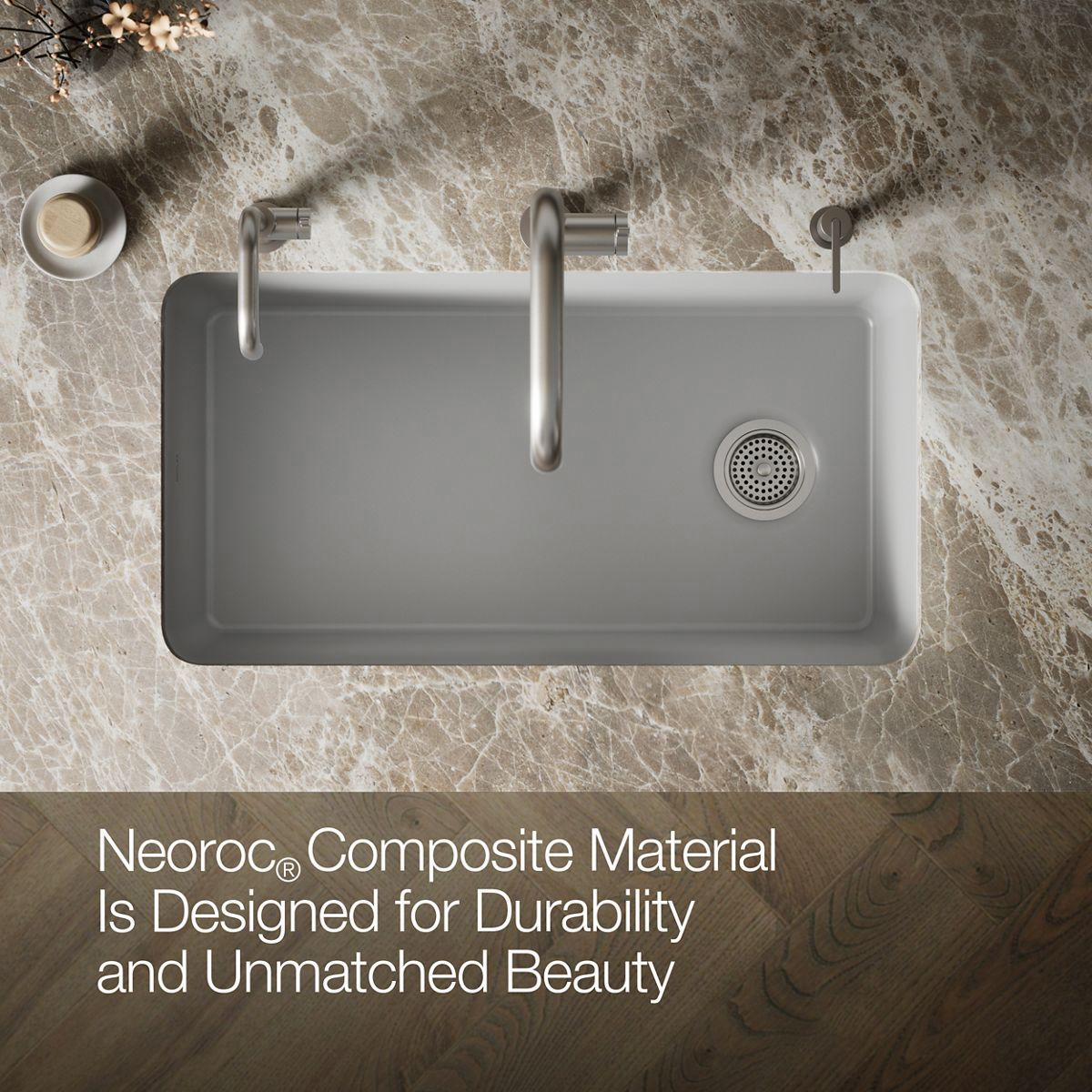 With soft French curves, the Cairn sink offers transitional style to suit contemporary and traditional kitchens alike. The Cairn sink is made of KOHLER Neoroc®, a matte-finish composite material designed for extreme durability and unmatched beauty. Richly colored to complement any countertop, Neoroc resists scratches, stains, and fading and is highly heat- and impact-resistant. This sink includes a bottom sink rack to keep the surface looking new.