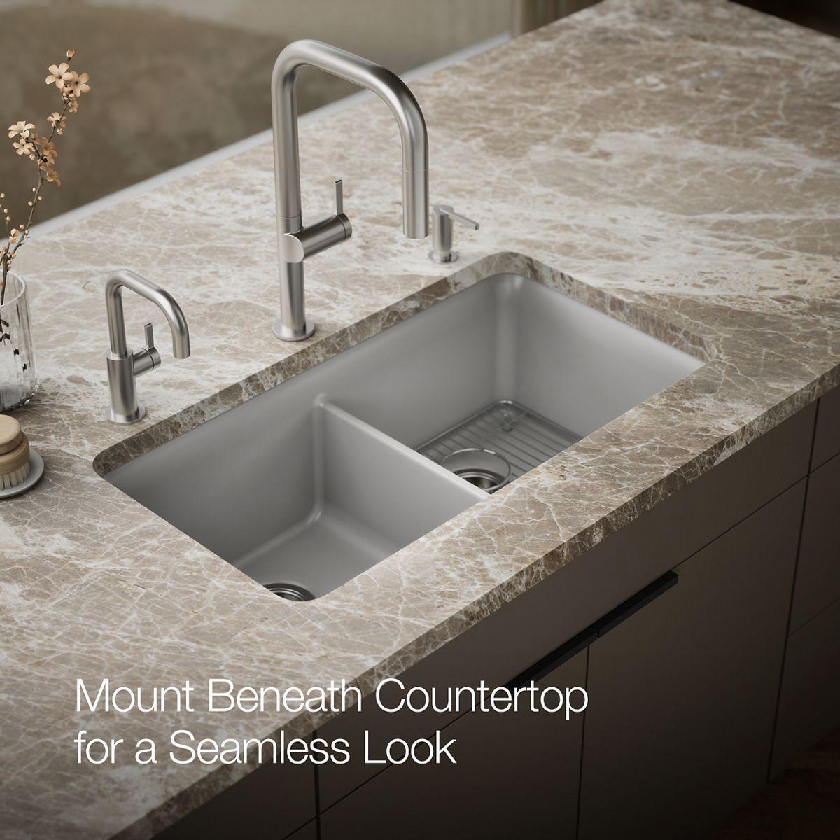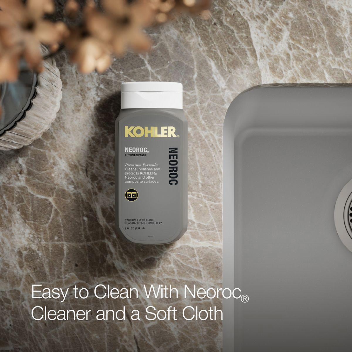 With soft French curves, the Cairn sink offers transitional style to suit contemporary and traditional kitchens alike. The Cairn sink is made of KOHLER Neoroc®, a matte-finish composite material designed for extreme durability and unmatched beauty. Richly colored to complement any countertop, Neoroc resists scratches, stains, and fading and is highly heat- and impact-resistant. This sink includes a bottom sink rack to keep the surface looking new.