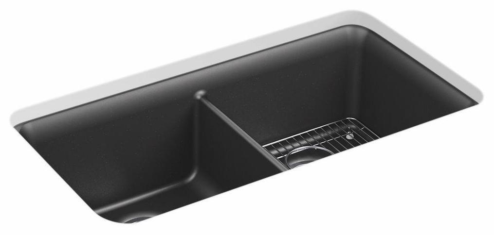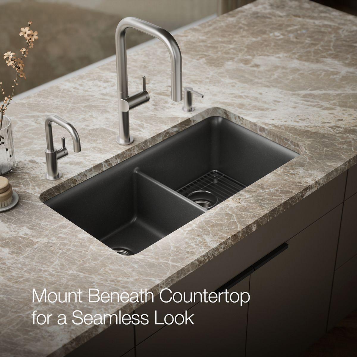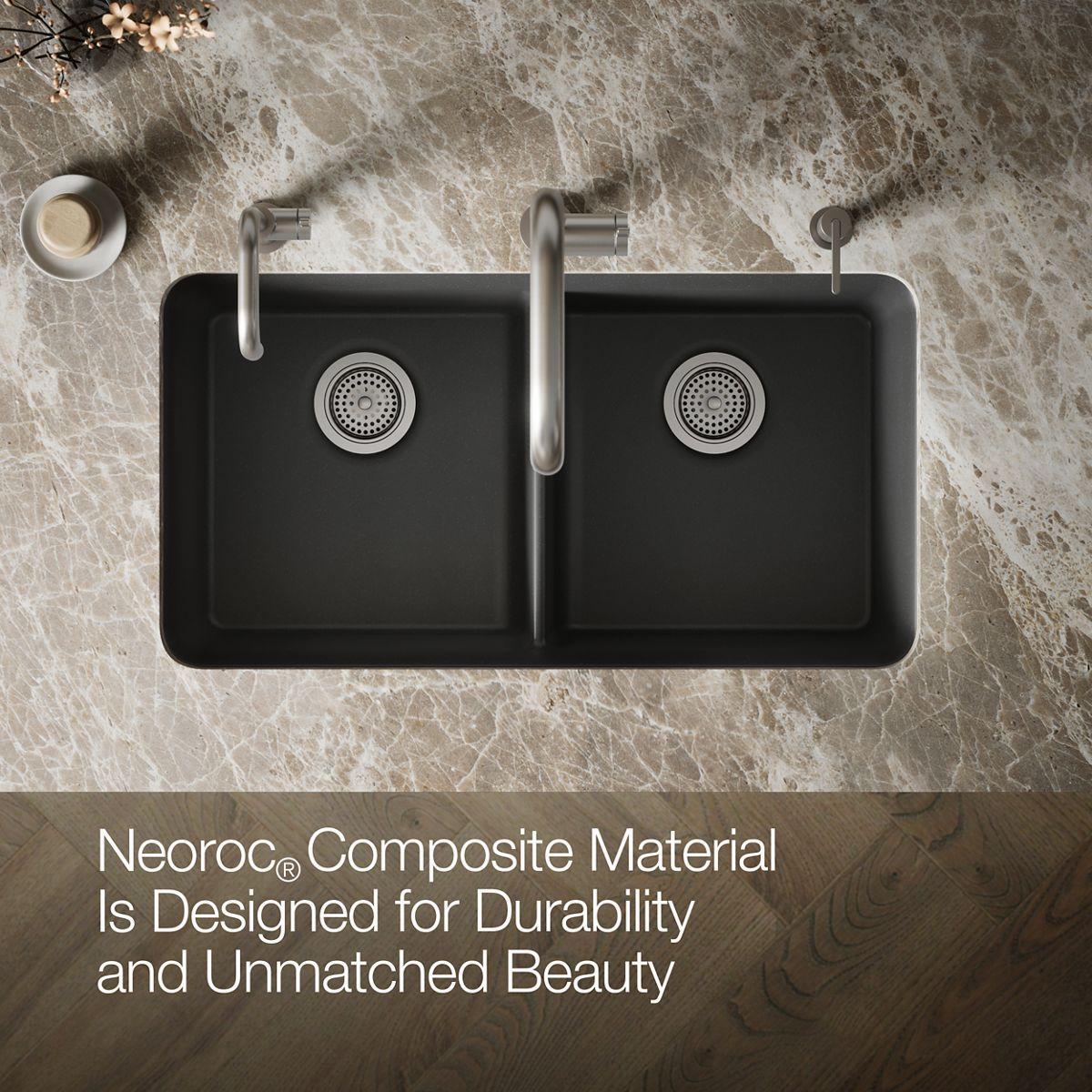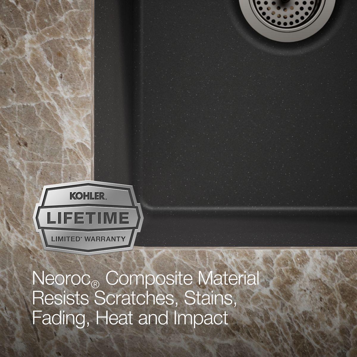 With soft French curves, the Cairn sink offers transitional style to suit contemporary and traditional kitchens alike. The Cairn sink is made of KOHLER Neoroc®, a matte-finish composite material designed for extreme durability and unmatched beauty. Richly colored to complement any countertop, Neoroc resists scratches, stains, and fading and is highly heat- and impact-resistant. This sink includes a bottom sink rack to keep the surface looking new.