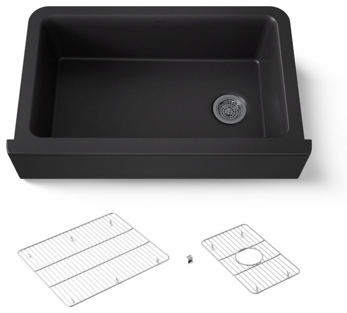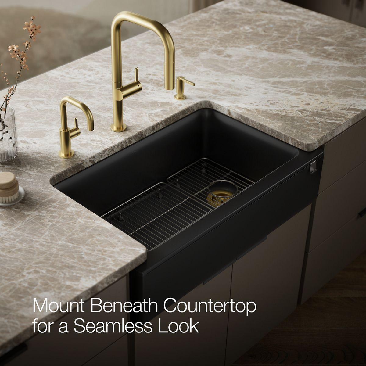 With soft French curves, the Cairn® kitchen sink offers transitional style to suit contemporary and traditional kitchens alike. Cairn is made of KOHLER Neoroc®, a matte-finish composite material designed for extreme durability and unmatched beauty. Richly colored to complement any countertop, Neoroc resists scratches, stains, and fading, and is highly heat- and impact-resistant. A standard tall apron-front makes it easy to install on 36-inch apron-front cabinetry. The Self-Trimming® design requires only a simple rough cut, overlapping the cabinet face for beautiful results.