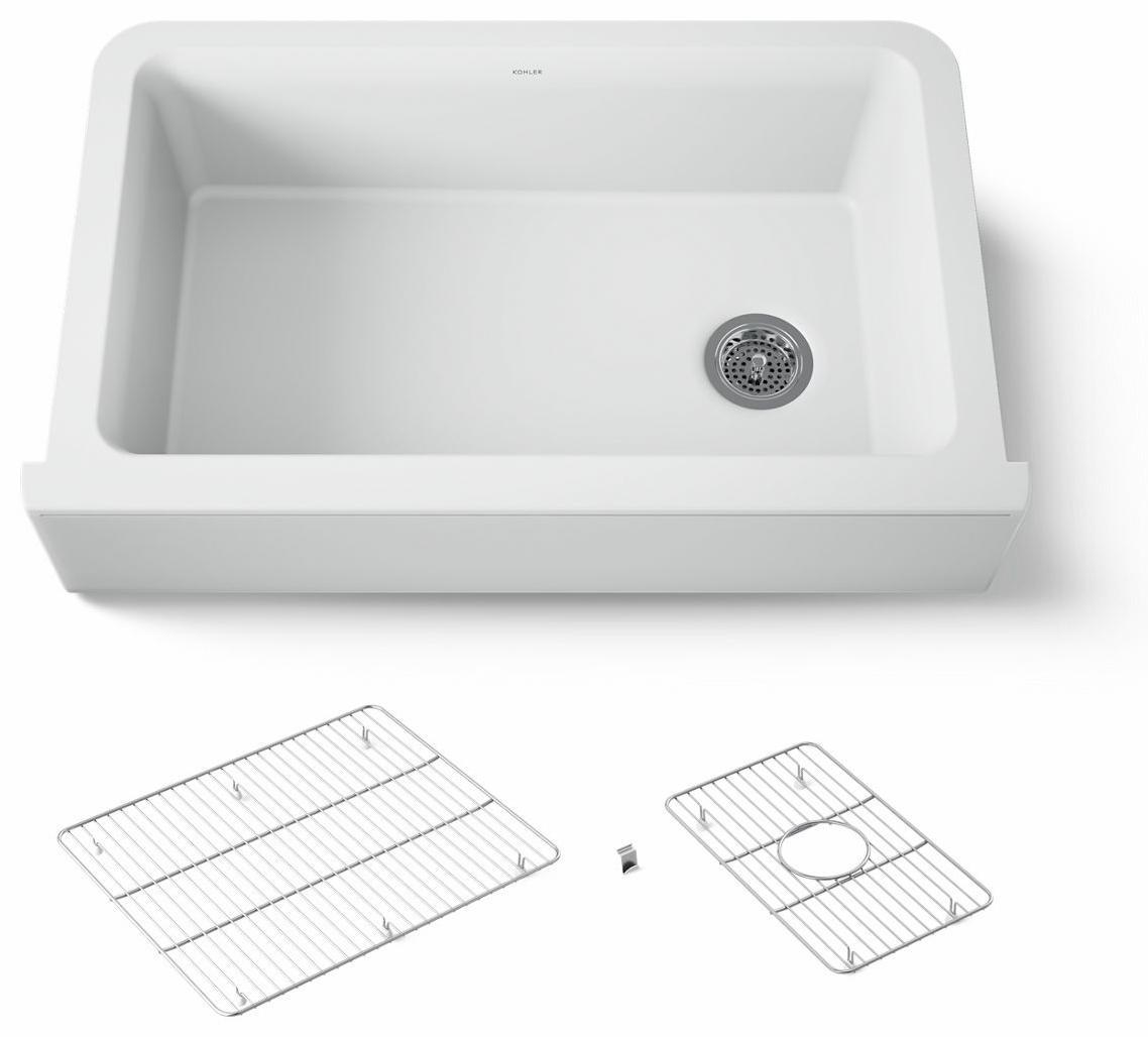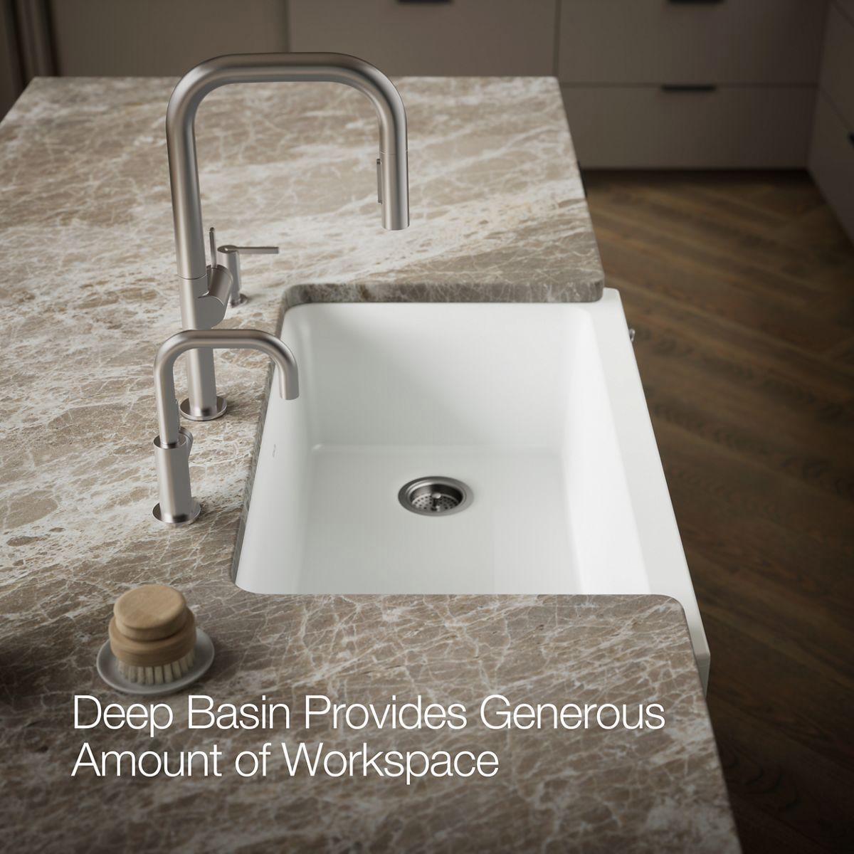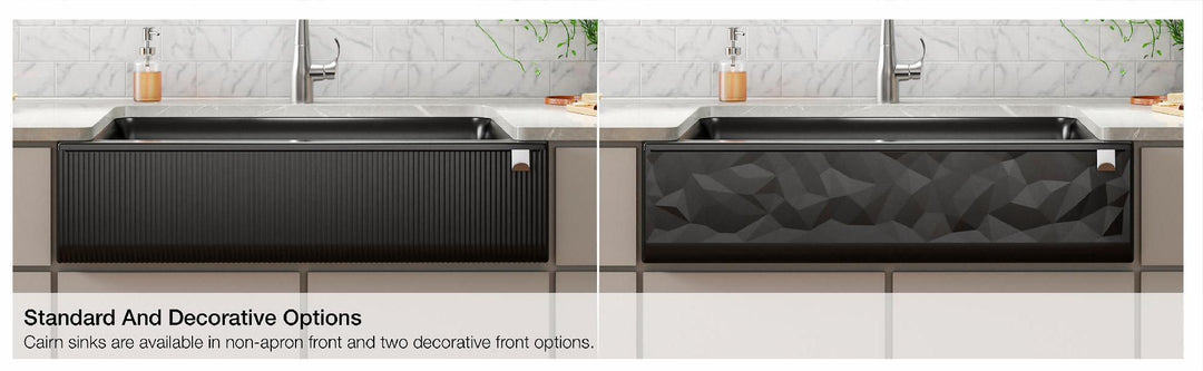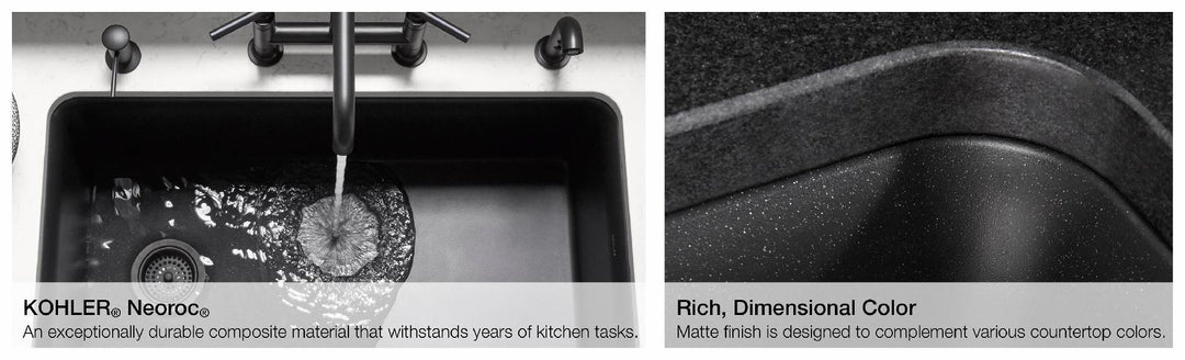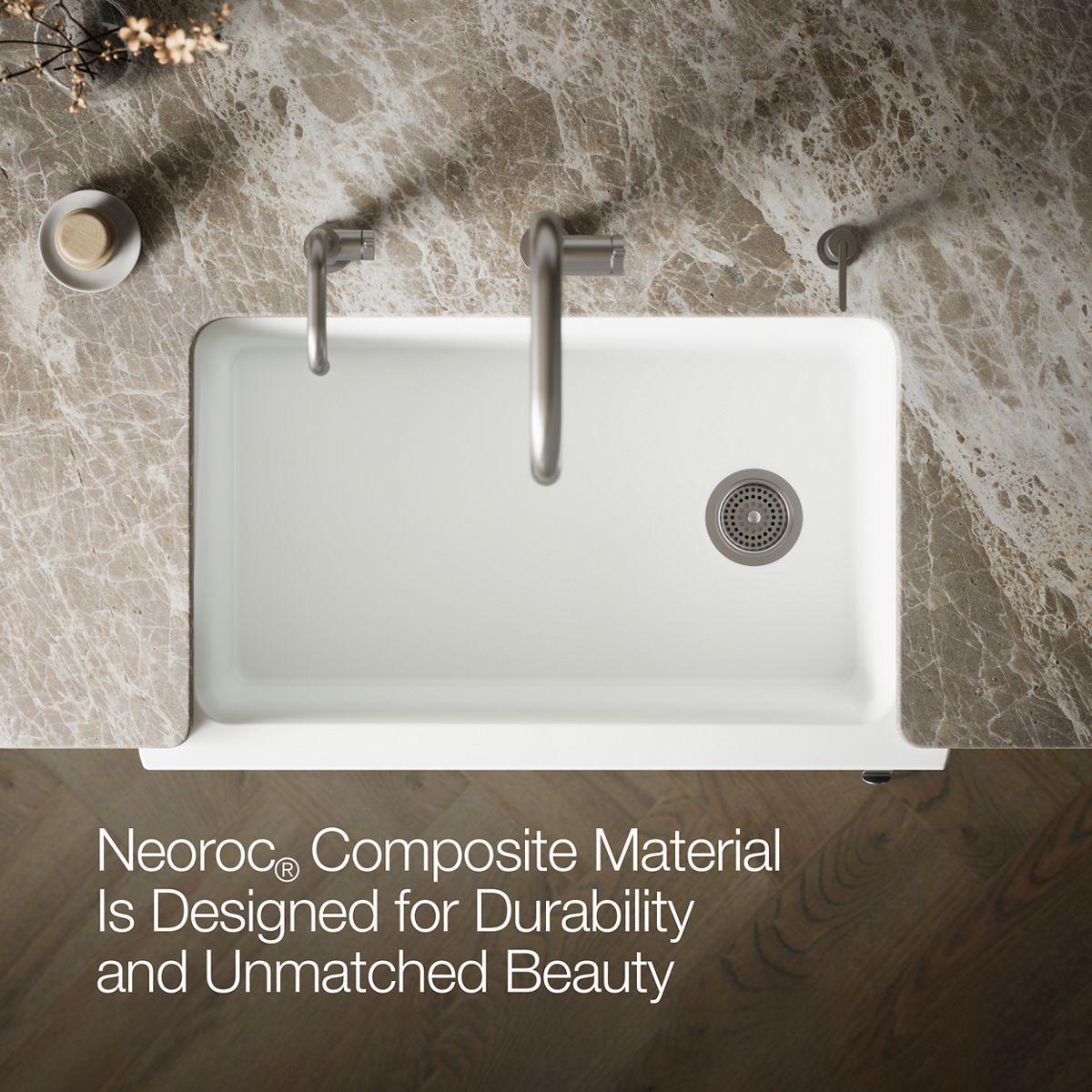 With soft French curves, the Cairn® kitchen sink offers transitional style to suit contemporary and traditional kitchens alike. Cairn is made of KOHLER Neoroc®, a matte-finish composite material designed for extreme durability and unmatched beauty. Richly colored to complement any countertop, Neoroc resists scratches, stains, and fading, and is highly heat- and impact-resistant. A standard tall apron-front makes it easy to install on 36-inch apron-front cabinetry. The Self-Trimming® design requires only a simple rough cut, overlapping the cabinet face for beautiful results.
