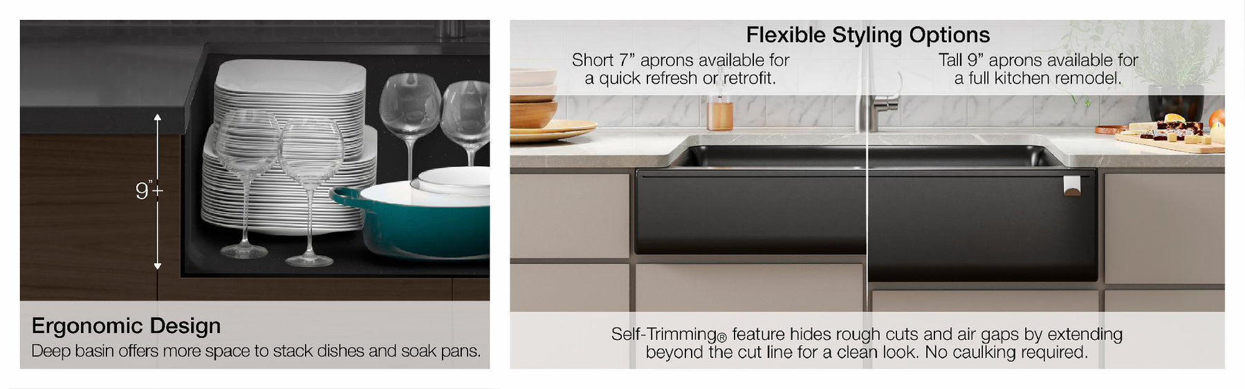 - Self-Trimming® apron overlaps cabinet face for easy installation and beautiful results.
