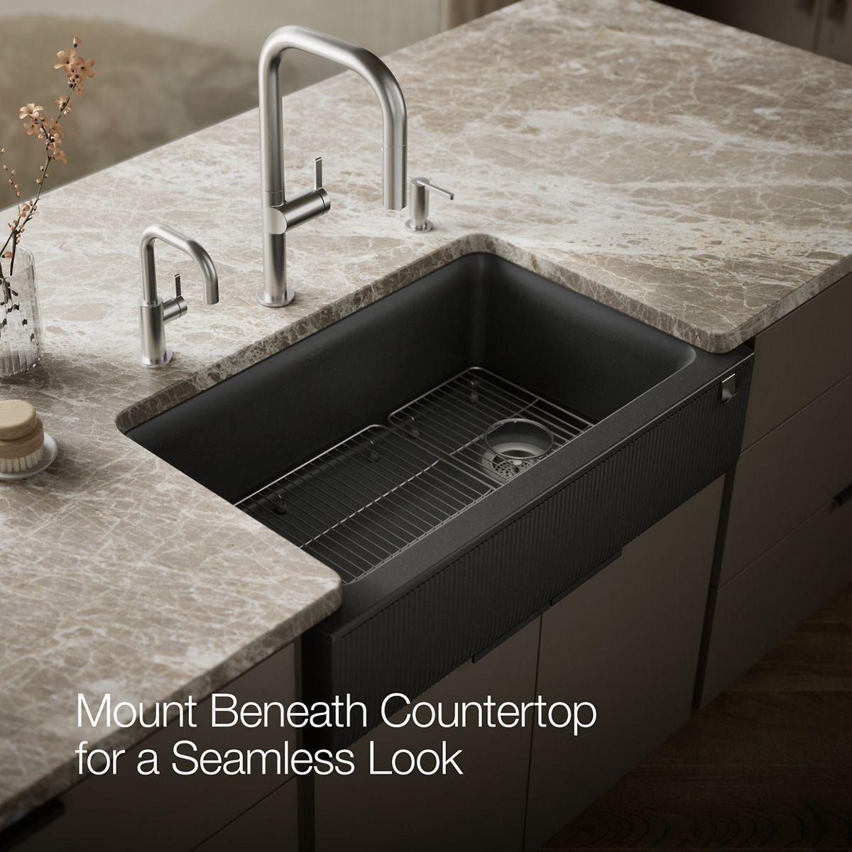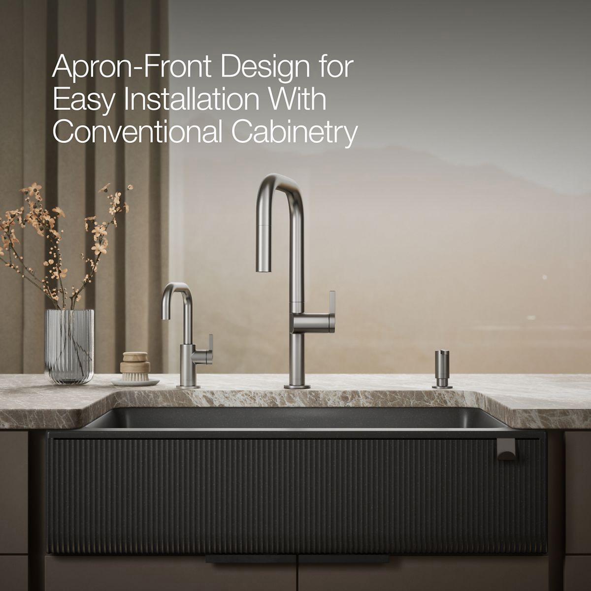 With soft French curves, the Cairn kitchen sink offers transitional style to suit contemporary and traditional kitchens alike. Cairn is made of KOHLER Neoroc, a matte-finish composite material designed for extreme durability and unmatched beauty. Richly colored to complement any countertop, Neoroc resists scratches, stains, and fading, and is highly heat- and impact-resistant. A standard tall apron-front makes it easy to install on 36-inch apron-front cabinetry. The Self-Trimming design requires only a simple rough cut, overlapping the cabinet face for beautiful results.