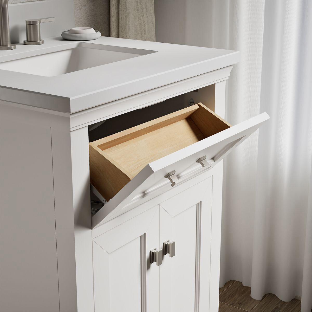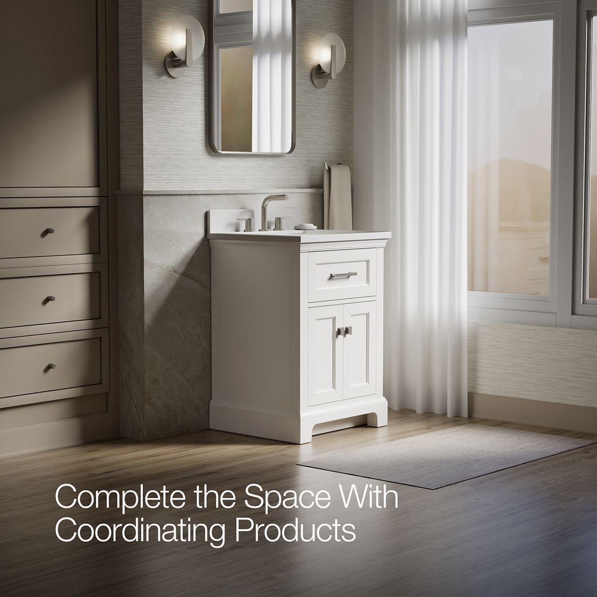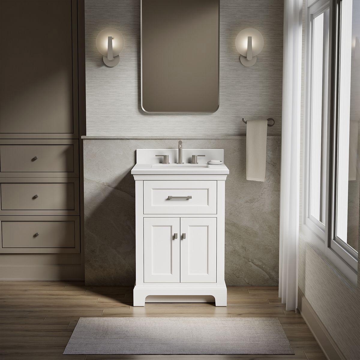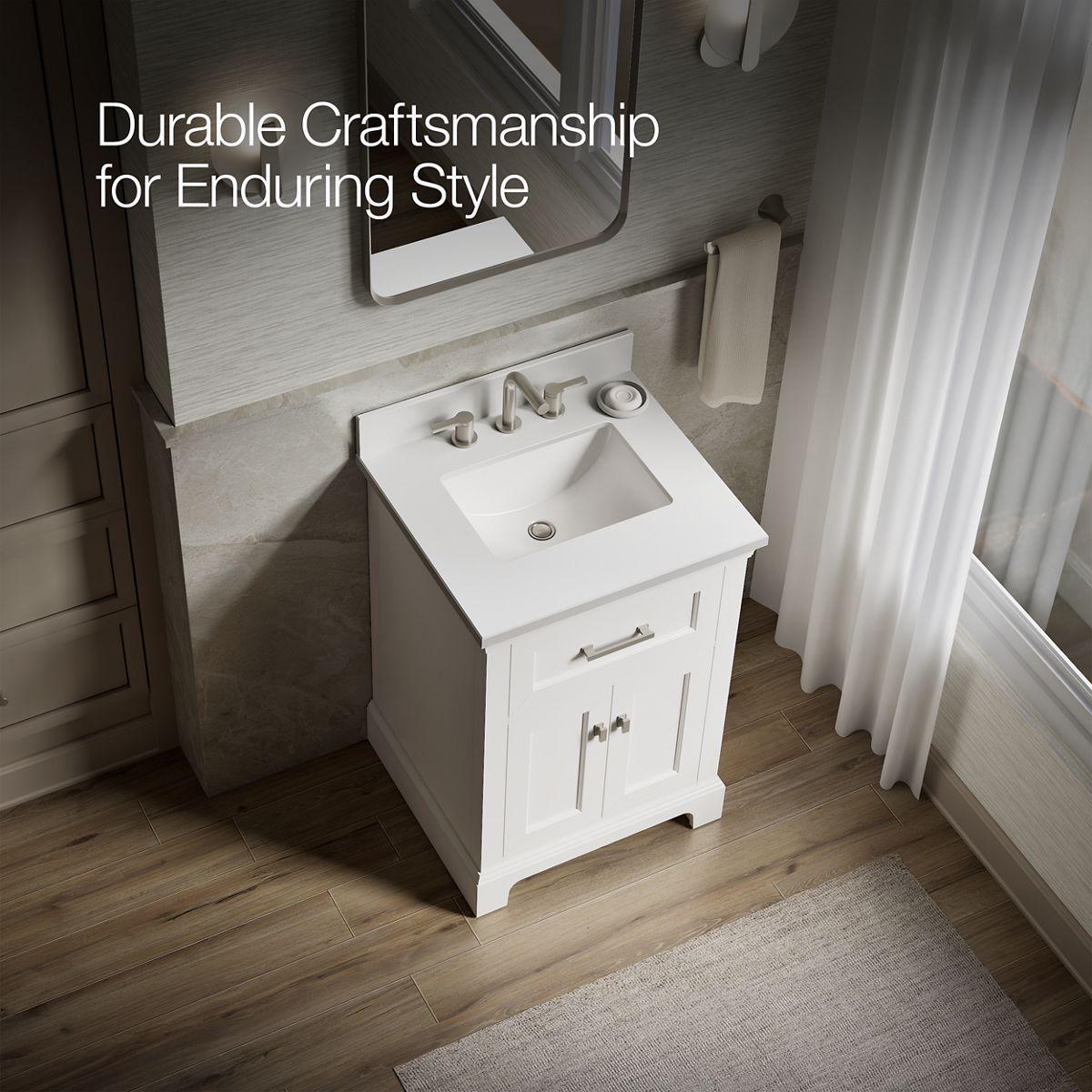 Inspired by midcentury modern design, the Charlemont vanity collection is adorned with elegant lines, subtle textures, and minimalist simplicity, bridging the gap between commonplace and niche. Raised-center door and drawer panels add visual interest, along with sharply squared hardware pulls featuring subtle details. This 24" vanity set includes cabinet, quartz countertop with matching backsplash, sink, and hardware.
