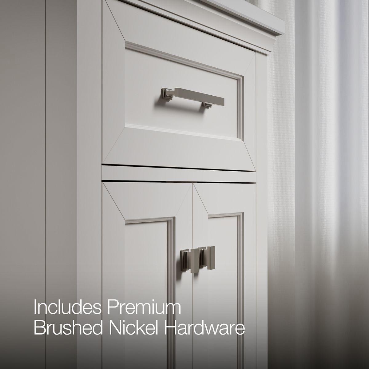 - Vibrant Brushed Nickel hardware included on White vanities, Vibrant Brushed Moderne Brass hardware on Ferrous Grey and Tidal Blue vanities, and Matte Black hardware on Light Oak vanities