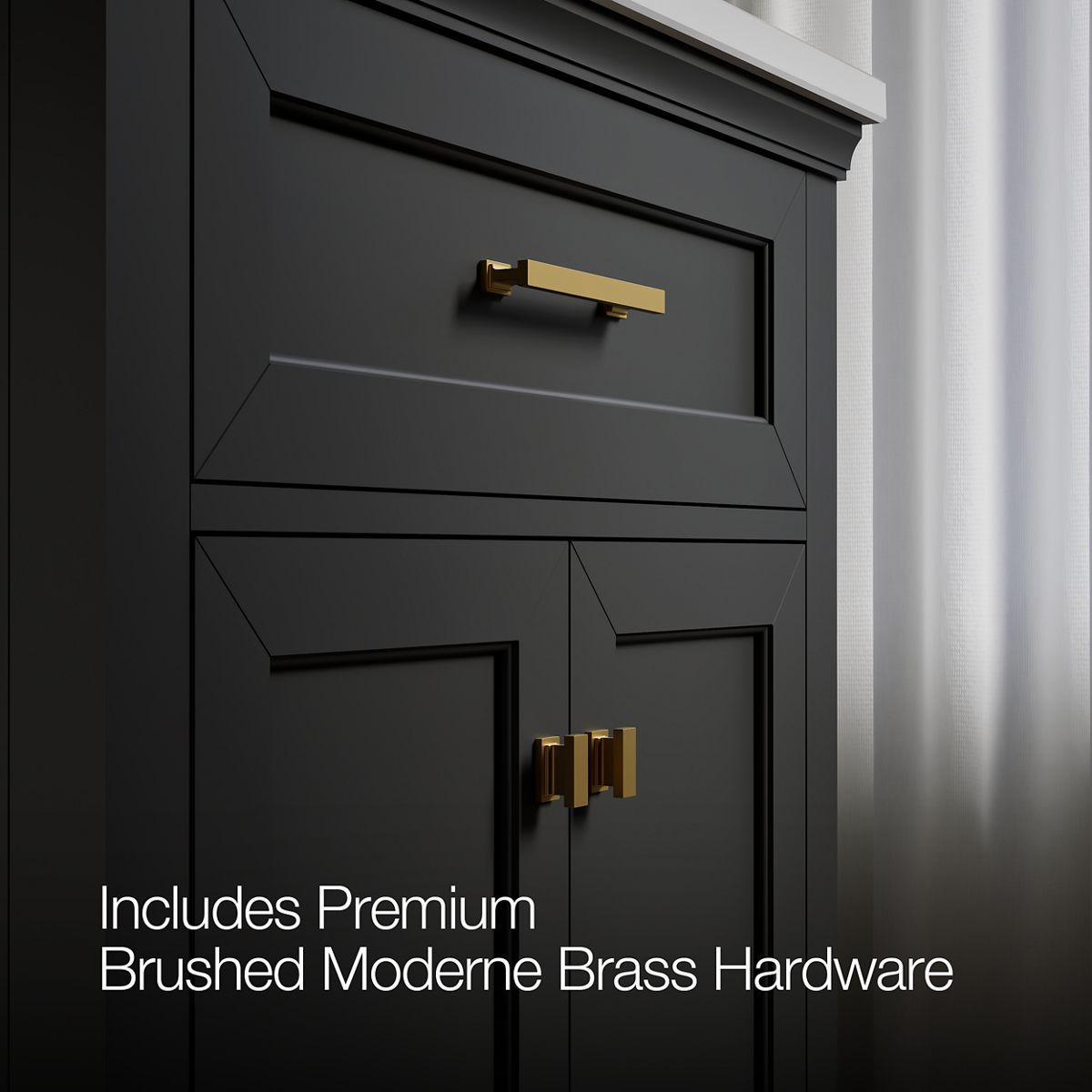 - Vibrant Brushed Nickel hardware included on White vanities, Vibrant Brushed Moderne Brass hardware on Ferrous Grey and Tidal Blue vanities, and Matte Black hardware on Light Oak vanities
