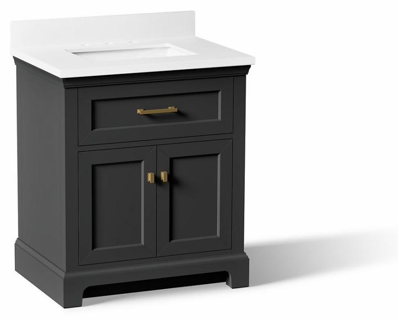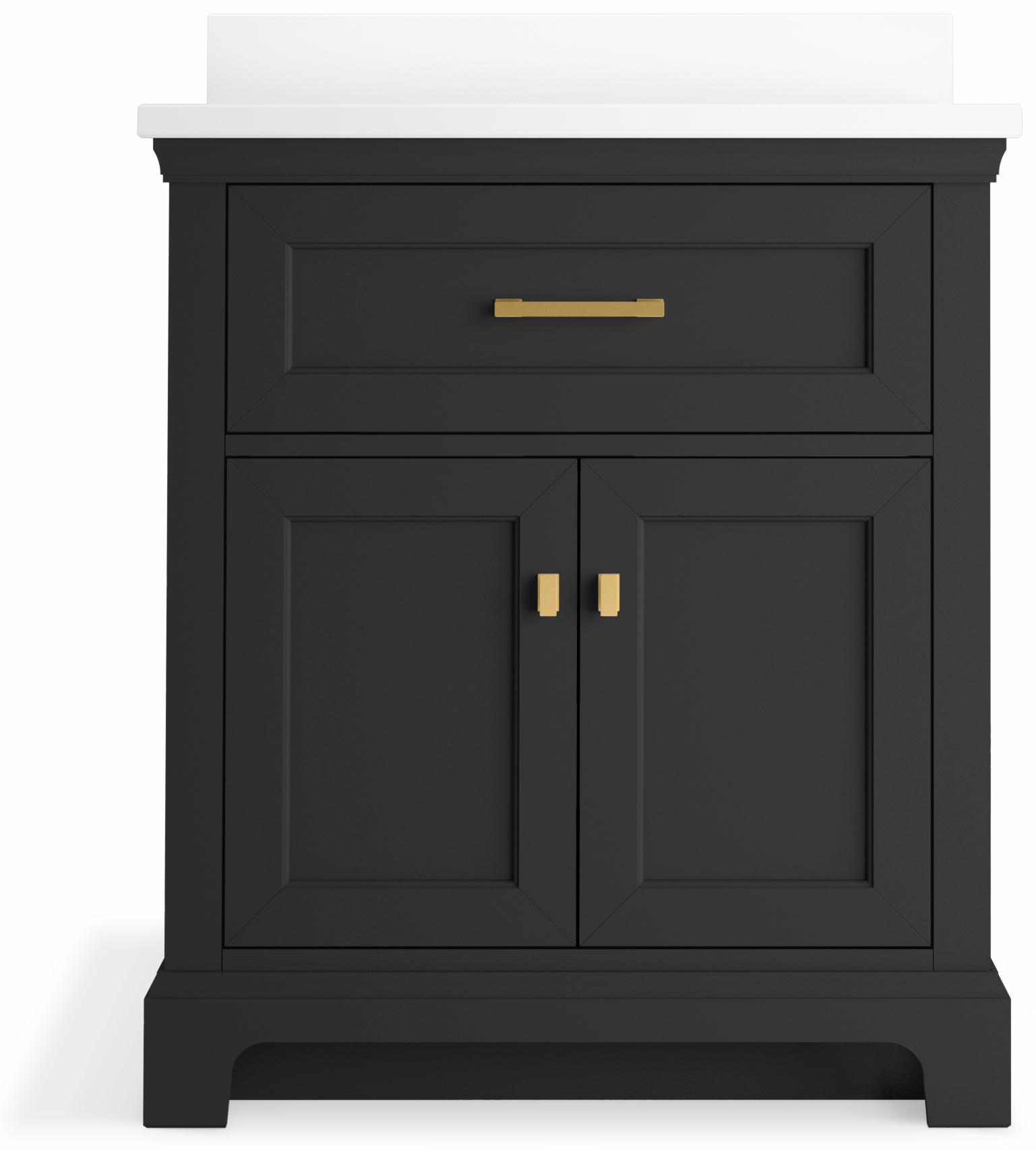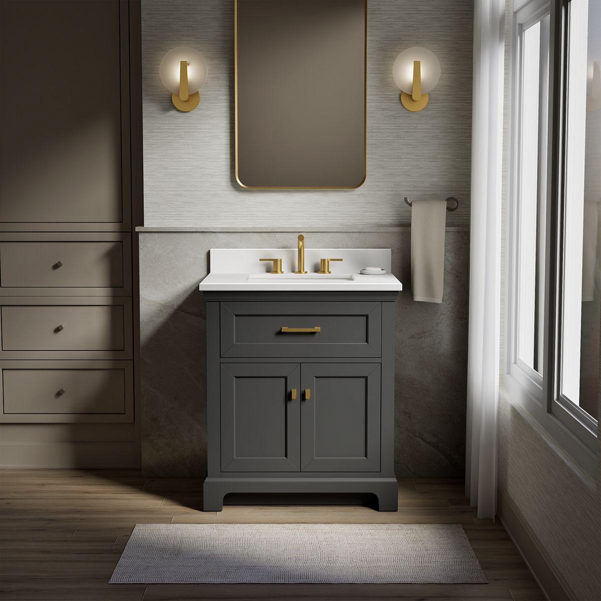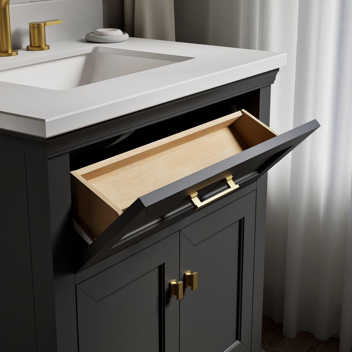 Inspired by midcentury modern design, the Charlemont vanity collection is adorned with elegant lines, subtle textures, and minimalist simplicity, bridging the gap between commonplace and niche. Raised-center door and drawer panels add visual interest, along with sharply squared hardware pulls featuring subtle details. This 30" vanity set includes cabinet, quartz countertop with matching backsplash, sink, and hardware.